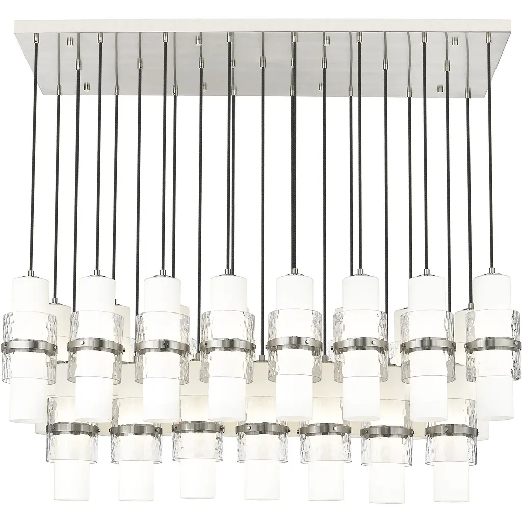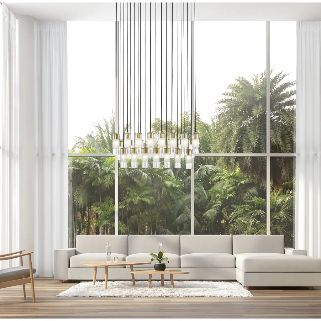 An impressive collection of 23 lights ensures grand scale for a modern linear chandelier from the Alton collection. Modern gold finish housings host clear and frosted glass, creating soft, inviting illumination and a sense of substance. Black braided cloth cord covers add a tailored touch, suspending lights in three rows and two tiers to deliver bold, sculptural style over an island, foyer, or dining table.