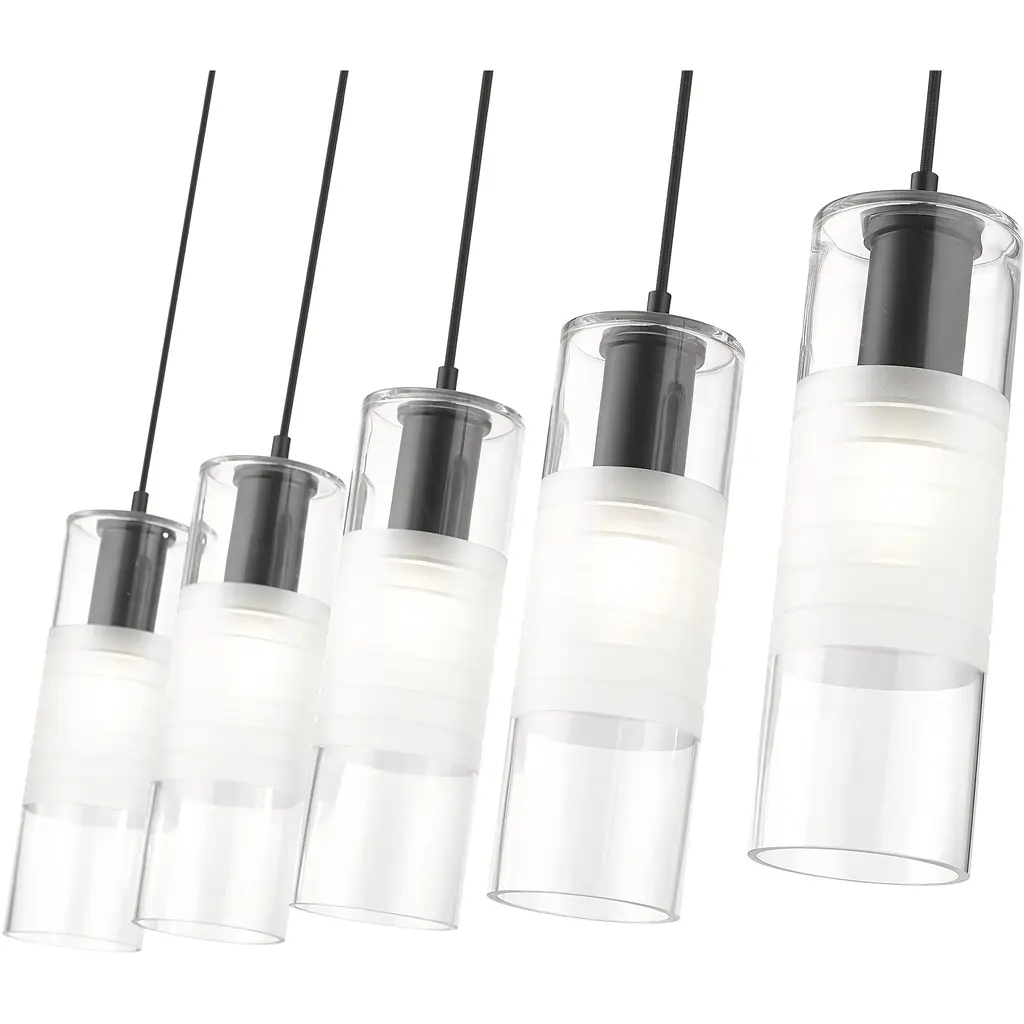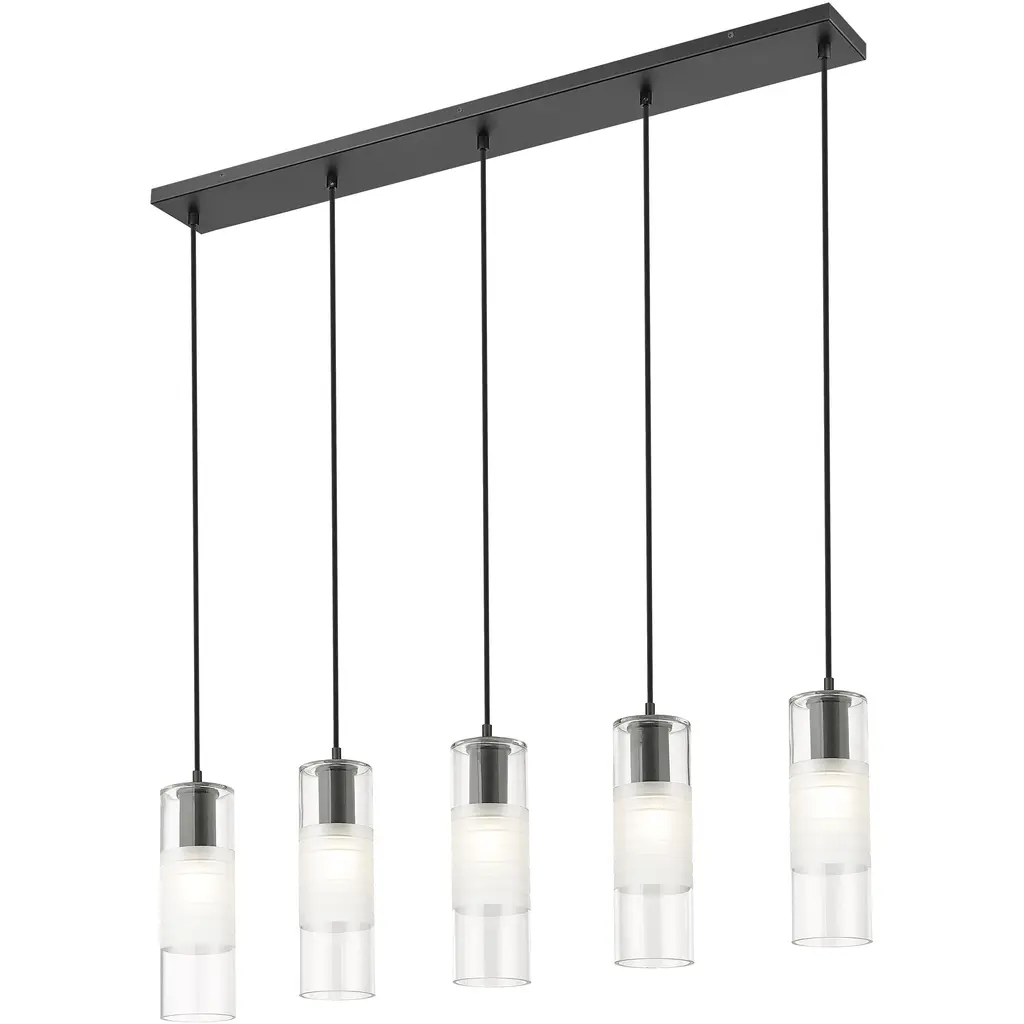 Tailored simplicity infuses a modern five-light linear chandelier with sophistication. Its matte black finish frame and robust housings offer a lovely complement to braided cloth covered cords that suspend each light in this island fixture, making it the perfect choice for refined but welcoming aesthetics in your kitchen or dining room.