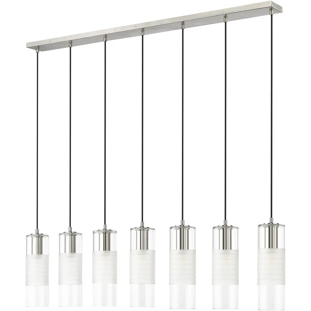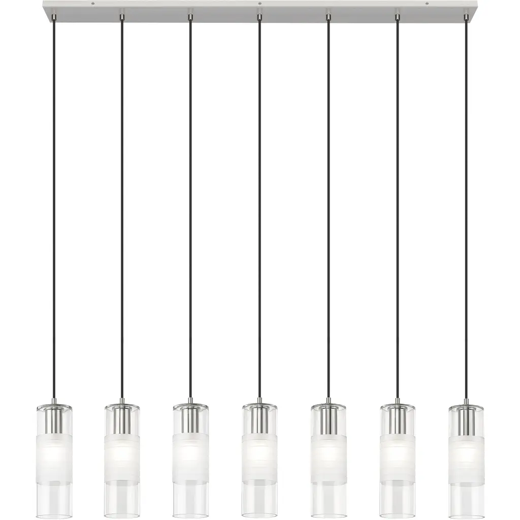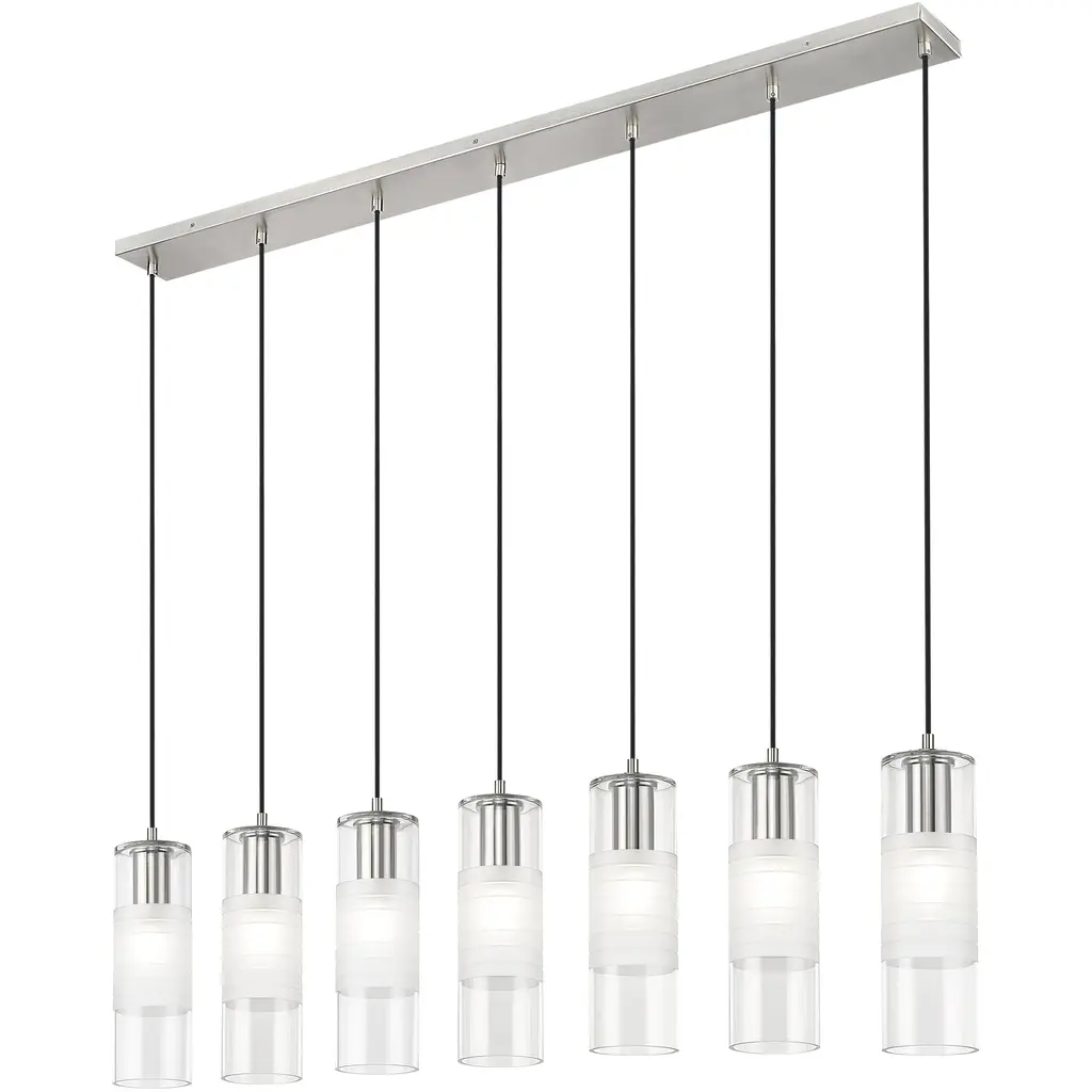Instill a refined sensibility over a kitchen island or dining table with a modern seven-light linear chandelier. Impeccably designed with artisan clear and frosted glass shades and robust housings, the chandelier features a long, slim canopy and a timeless brushed nickel finish. Each light suspends from a covered in braided cloth, lending impeccable tailoring and attention to detail to this superb fixture.