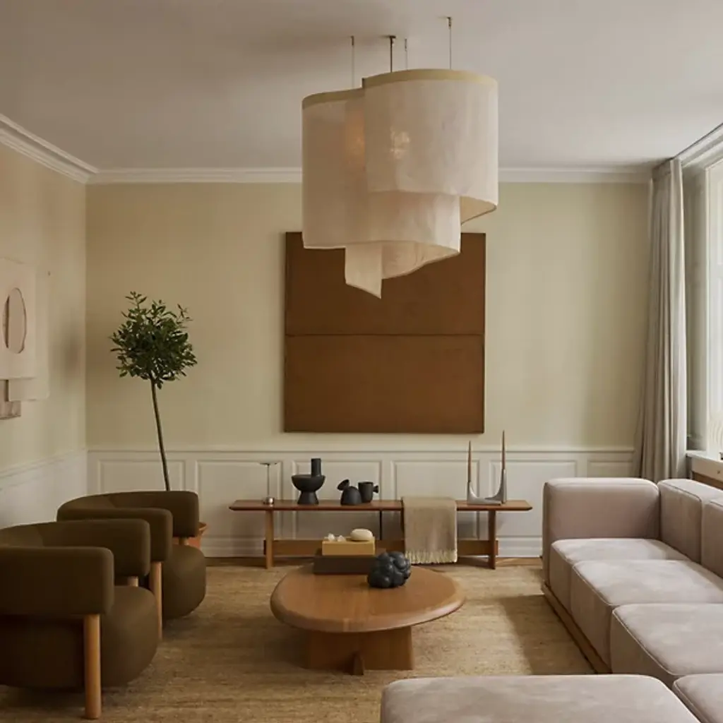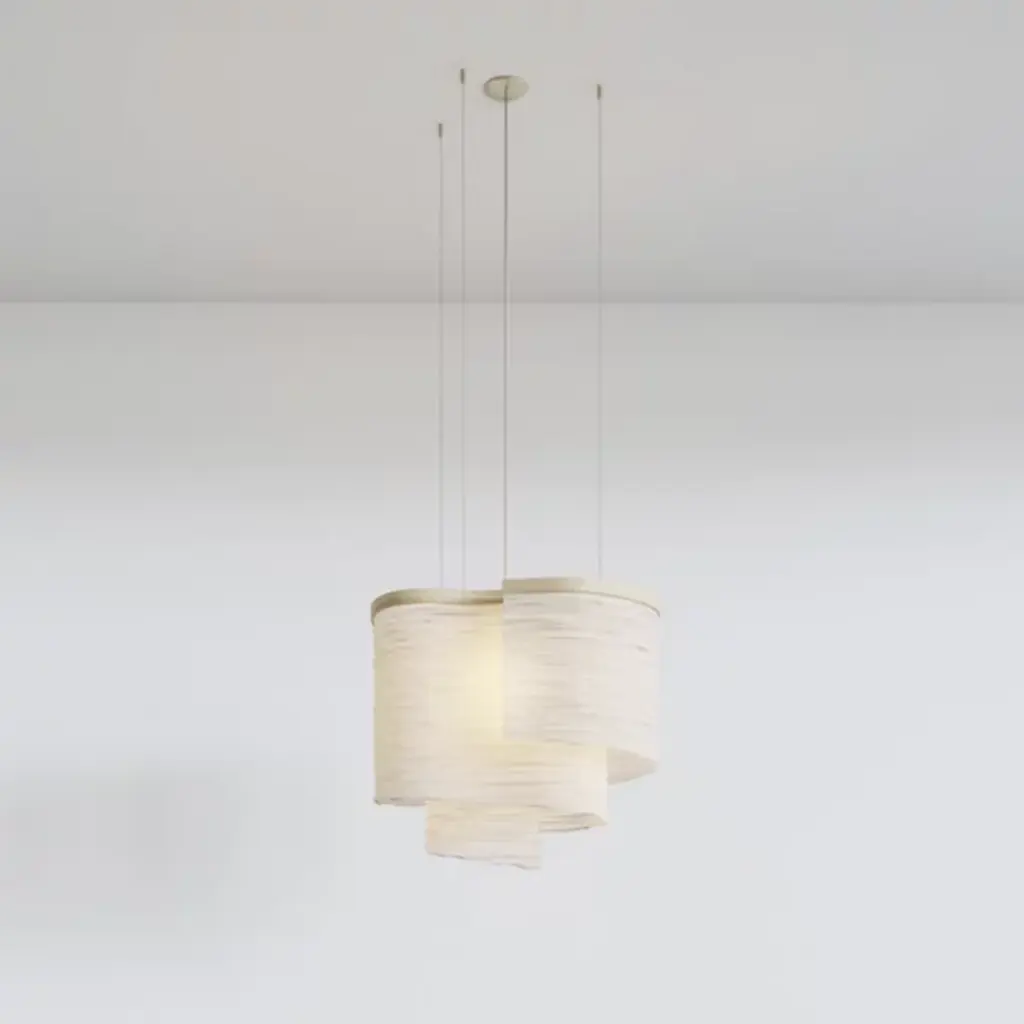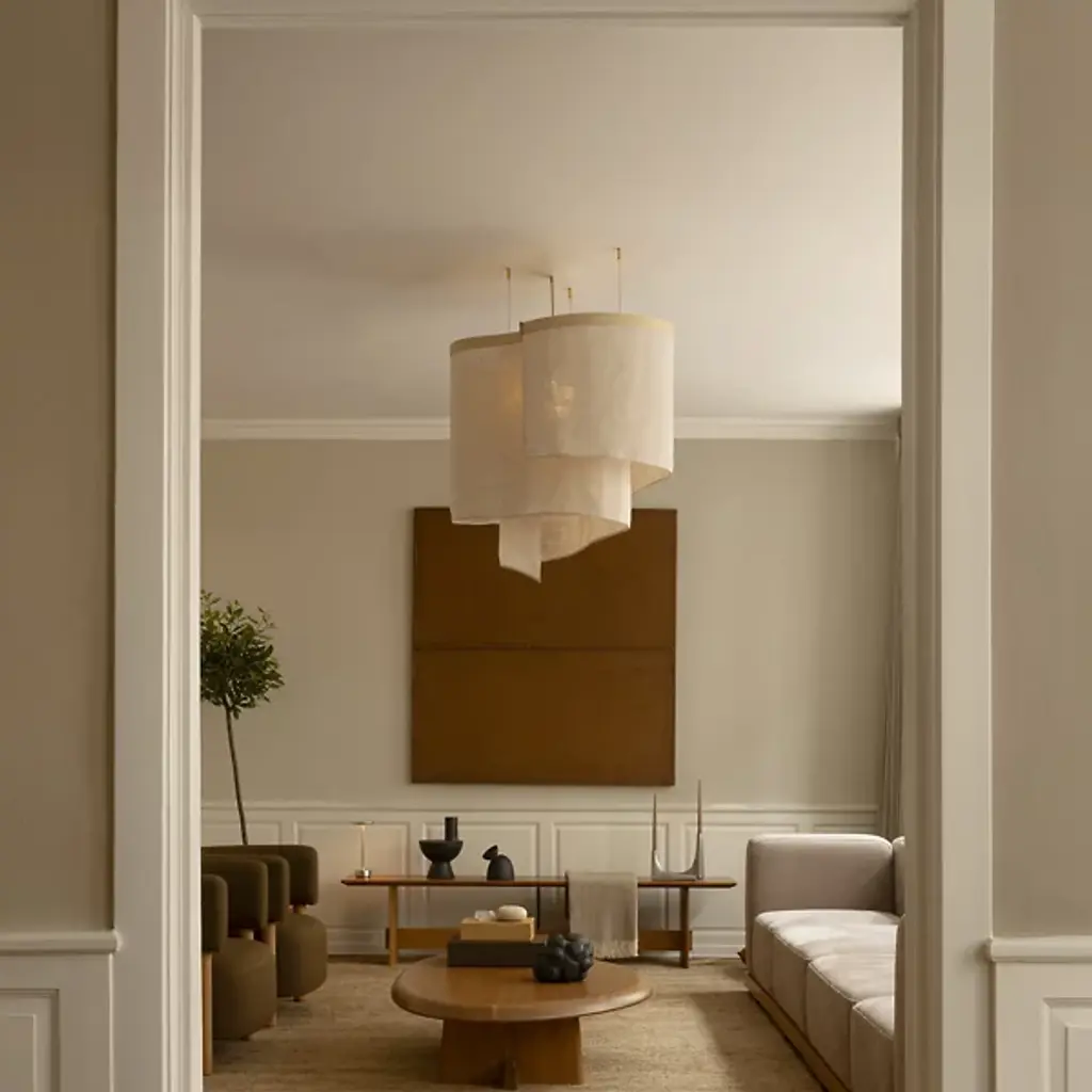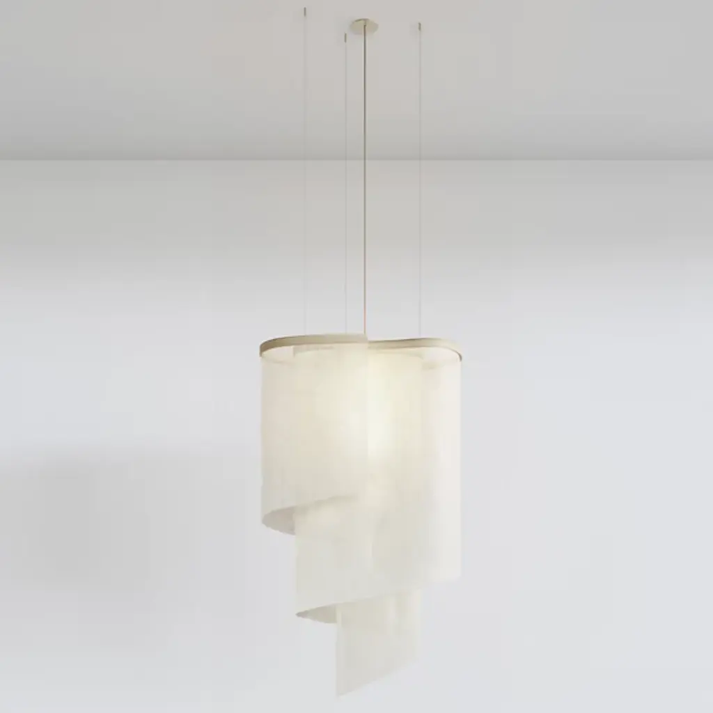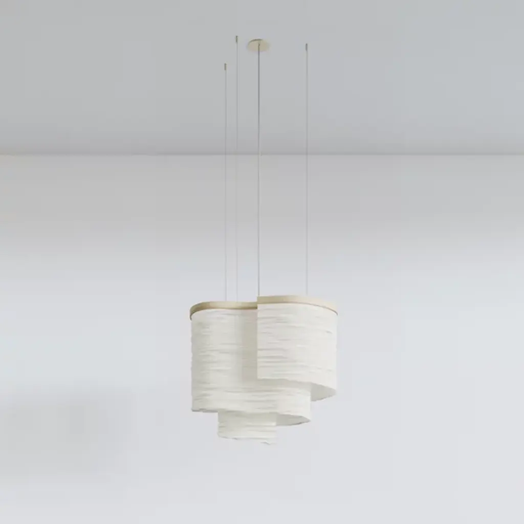 The Altostratus Chandelier from Ladies and Gentlemen Studio showcases an eye-catching design that brings a sense of movement and positive energy. It was designed by Dylan Davis & Jean Lee, who drew inspiration from sunlight shining through clouds, crafting a sinuous textile shade that embodies energy in motion. The shade hangs from a curving wooden frame, enhancing the warm, elegant aesthetic of the piece. With custom heights available upon request and dimming capabilities, this chandelier can suit a variety of settings, adding sophistication and vitality wherever it hangs.