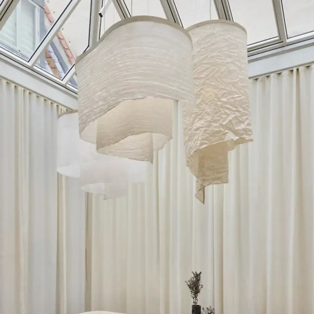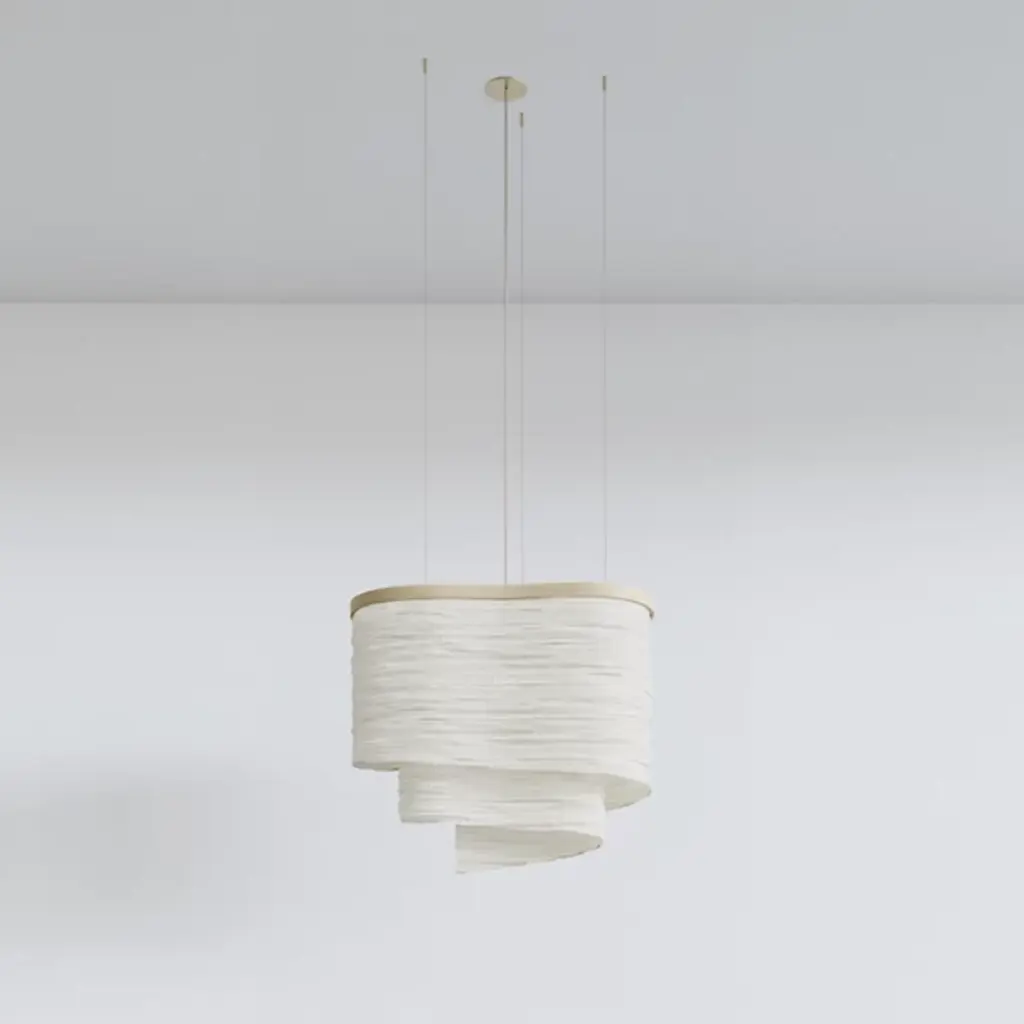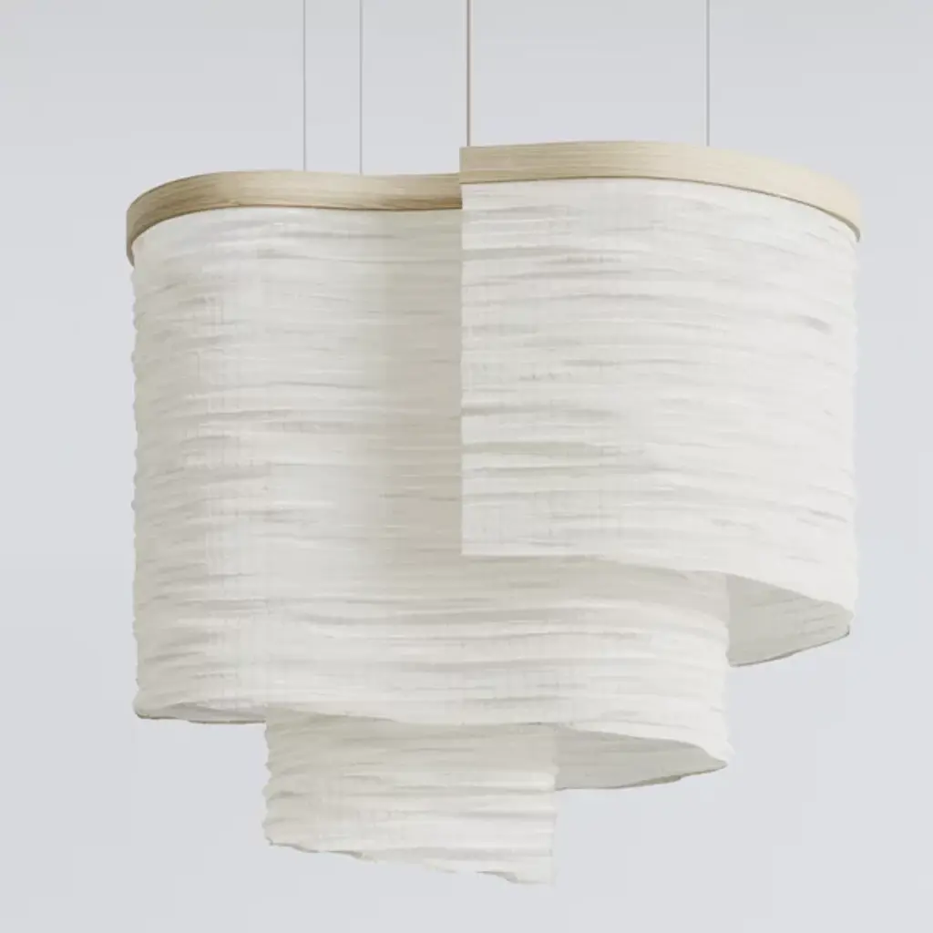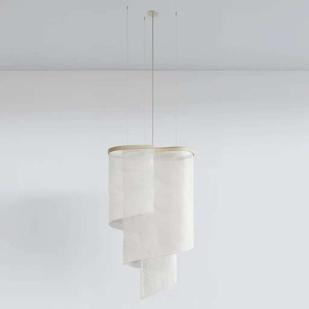 The Altostratus Chandelier from Ladies and Gentlemen Studio showcases an eye-catching design that brings a sense of movement and positive energy. It was designed by Dylan Davis & Jean Lee, who drew inspiration from sunlight shining through clouds, crafting a sinuous textile shade that embodies energy in motion. The shade hangs from a curving wooden frame, enhancing the warm, elegant aesthetic of the piece. With custom heights available upon request and dimming capabilities, this chandelier can suit a variety of settings, adding sophistication and vitality wherever it hangs.
