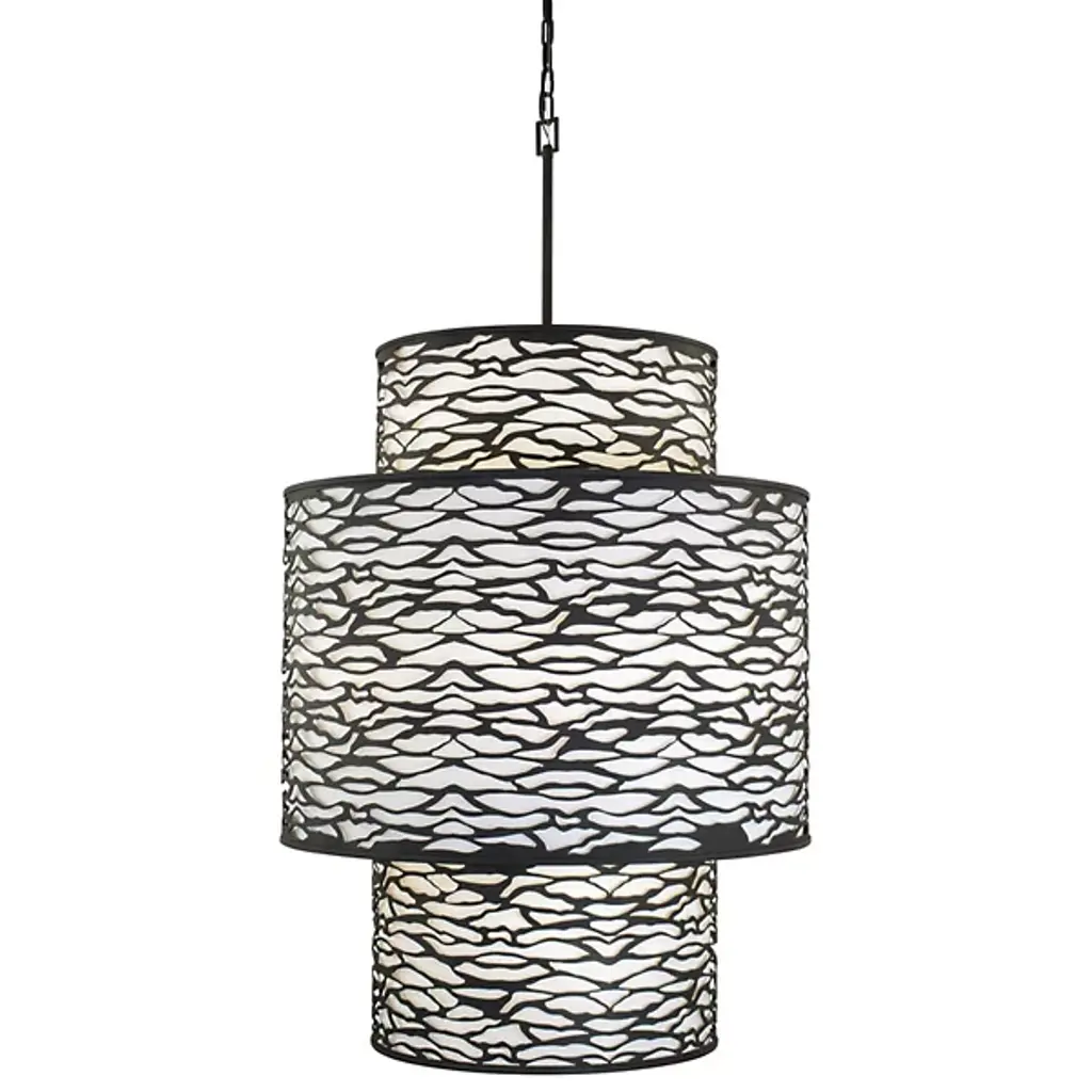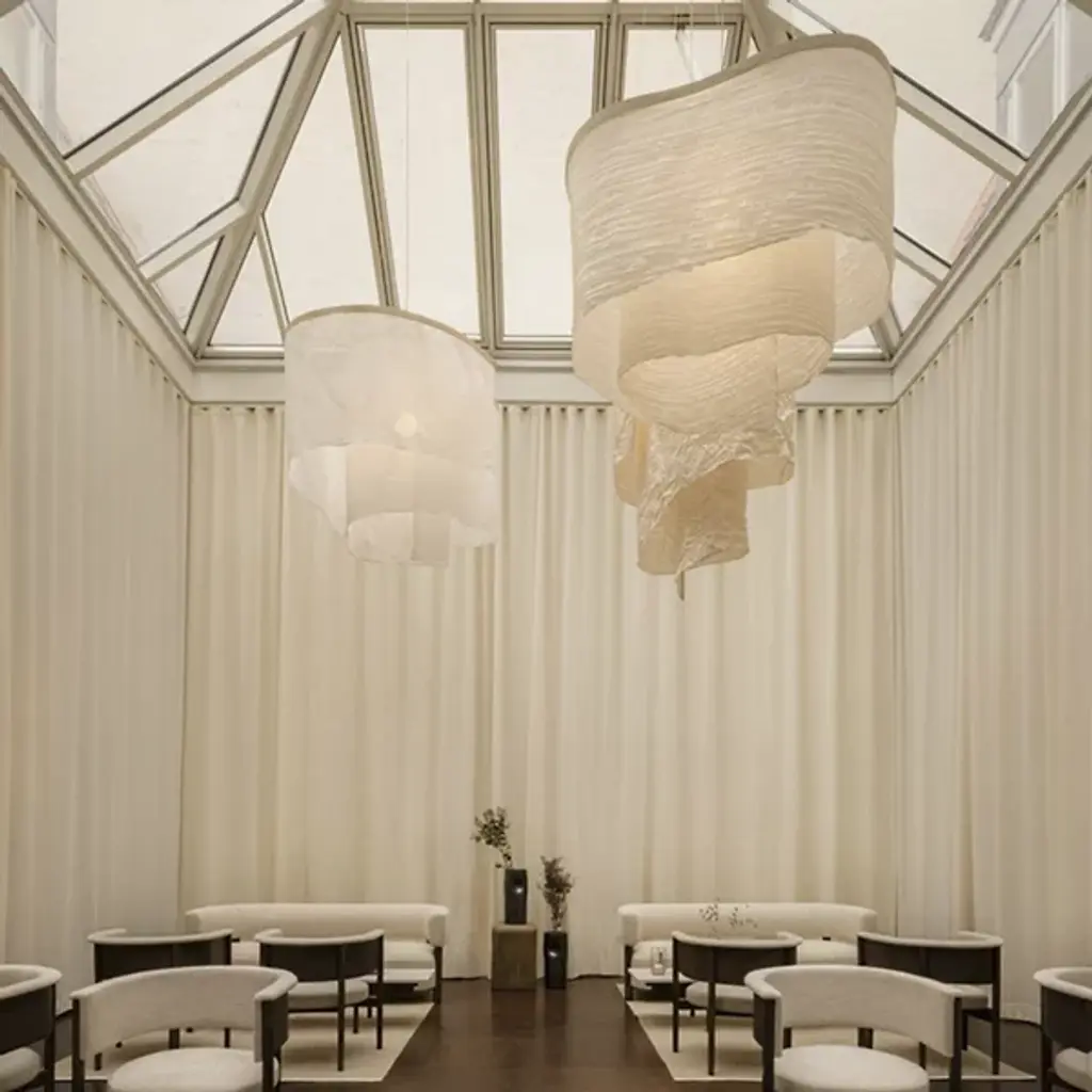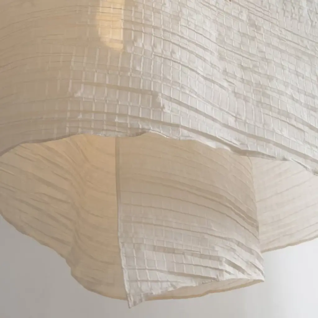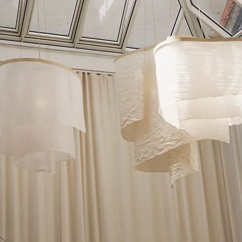 The Altostratus Chandelier from Ladies and Gentlemen Studio showcases an eye-catching design that brings a sense of movement and positive energy. It was designed by Dylan Davis & Jean Lee, who drew inspiration from sunlight shining through clouds, crafting a sinuous textile shade that embodies energy in motion. The shade hangs from a curving wooden frame, enhancing the warm, elegant aesthetic of the piece. With custom heights available upon request and dimming capabilities, this chandelier can suit a variety of settings, adding sophistication and vitality wherever it hangs.