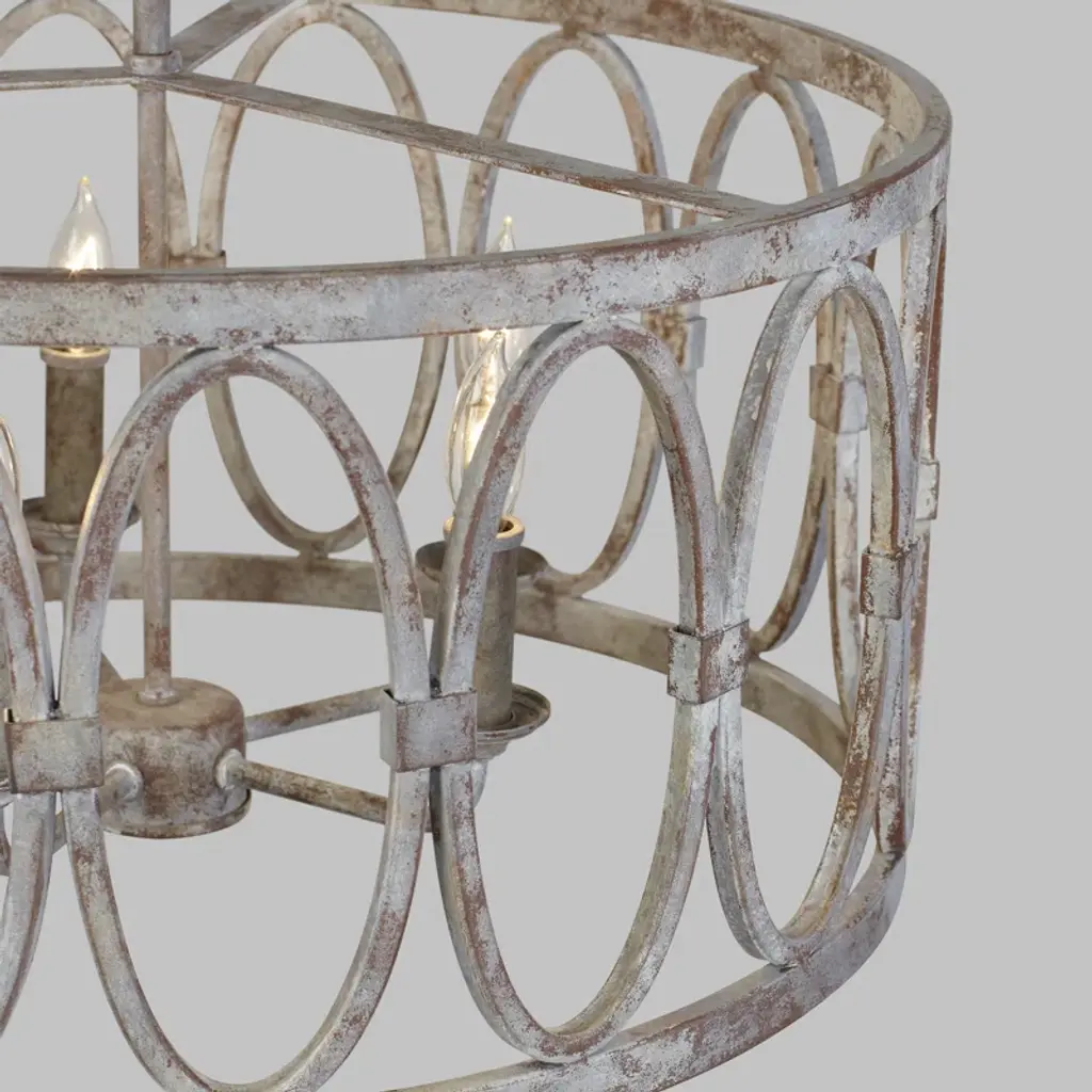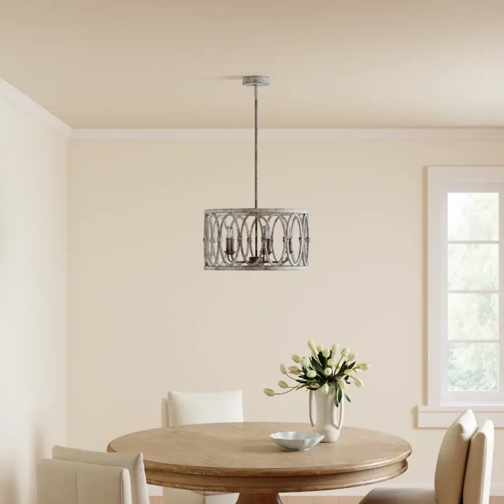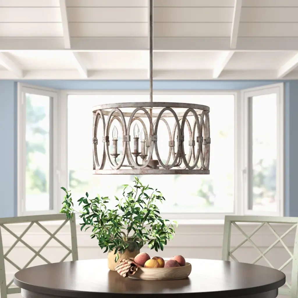 This 5-light chandelier brightens up your kitchen or dining room and adds a French country-inspired design to your space. It's made from metal in a distressed white finish for an antique country cottage aesthetic. The open-work drum shade features an oval trellis design all around the edge that encases the candelabra. The bare 60W candle bulbs (not included) wash your dinner or prep space in a warm glow. Plus, it hangs from an adjustable download and has a sloped ceiling-compatible canopy.