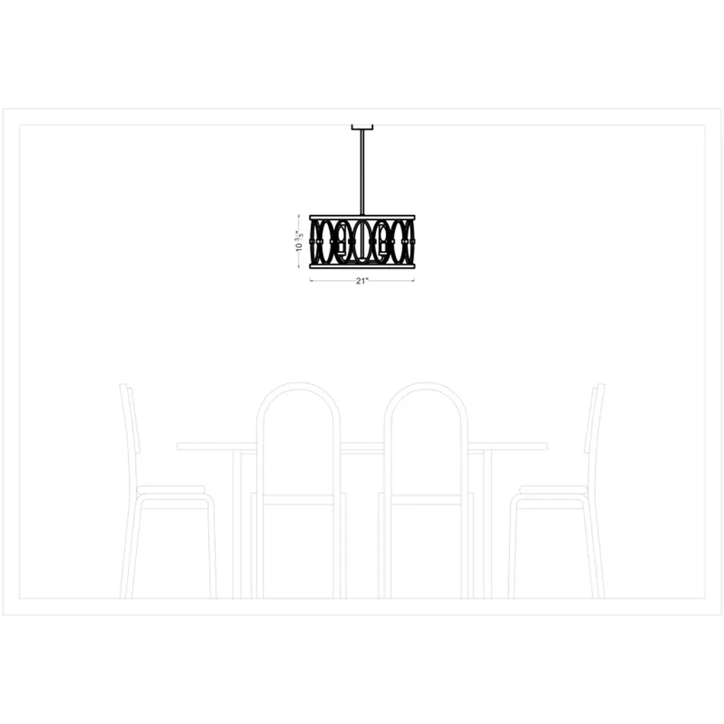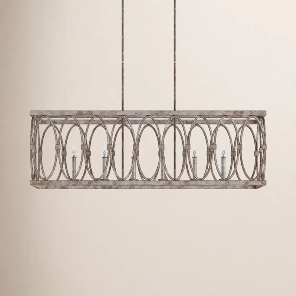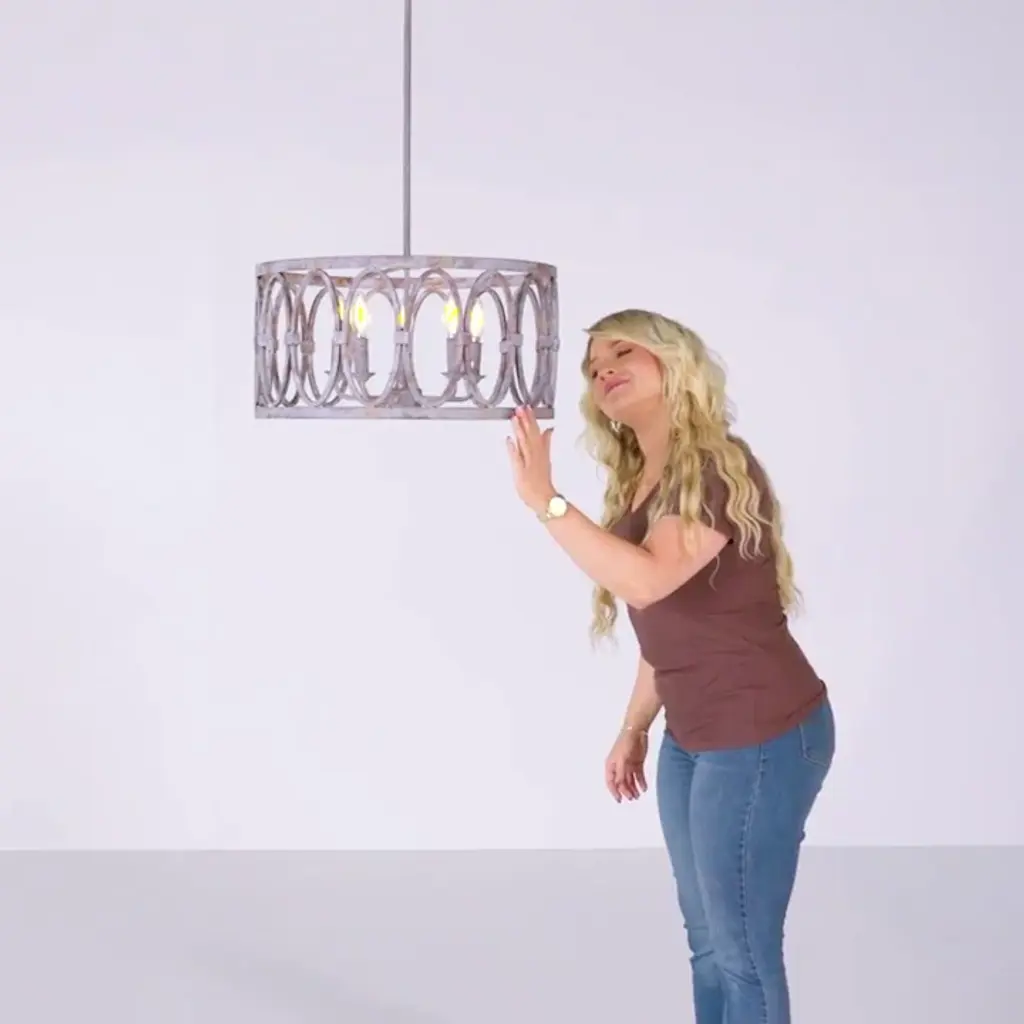 This 5-light chandelier brightens up your kitchen or dining room and adds a French country-inspired design to your space. It's made from metal in a distressed white finish for an antique country cottage aesthetic. The open-work drum shade features an oval trellis design all around the edge that encases the candelabra. The bare 60W candle bulbs (not included) wash your dinner or prep space in a warm glow. Plus, it hangs from an adjustable download and has a sloped ceiling-compatible canopy.