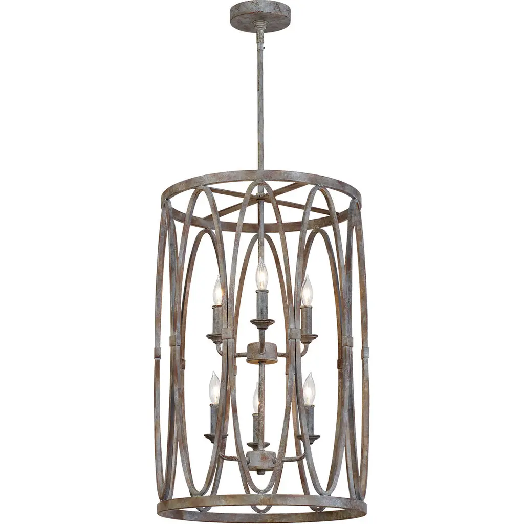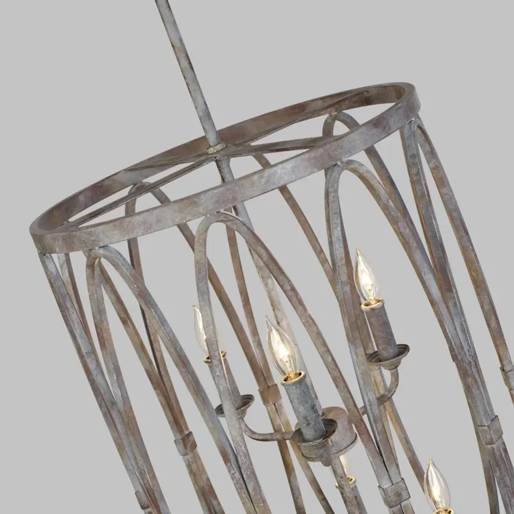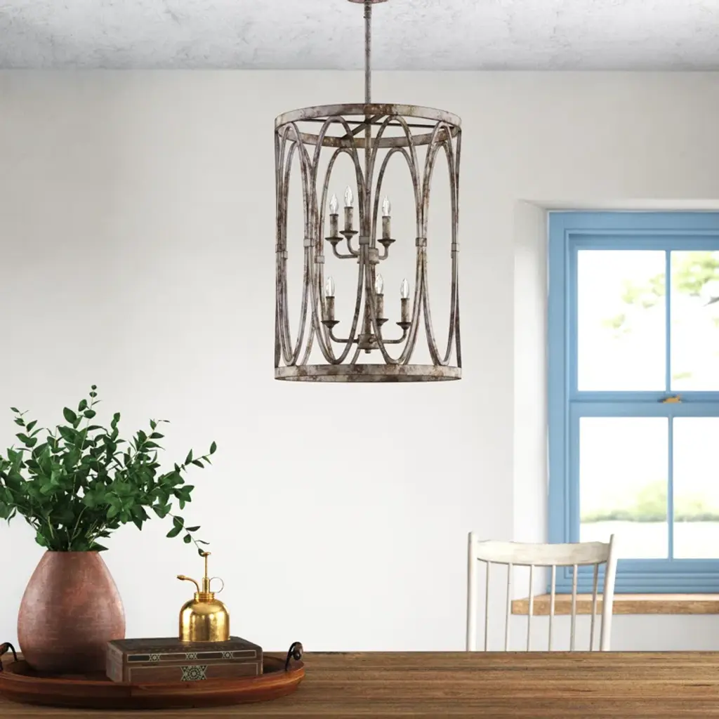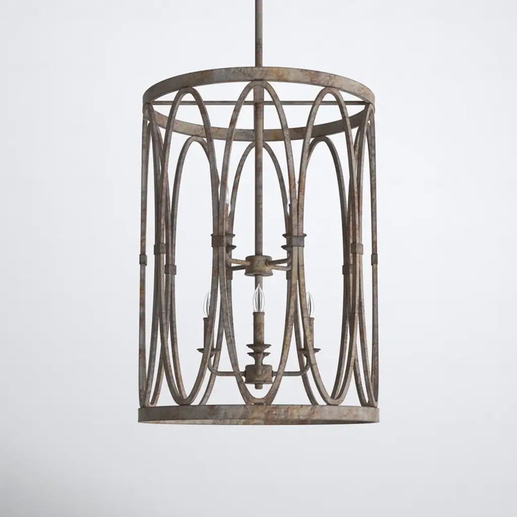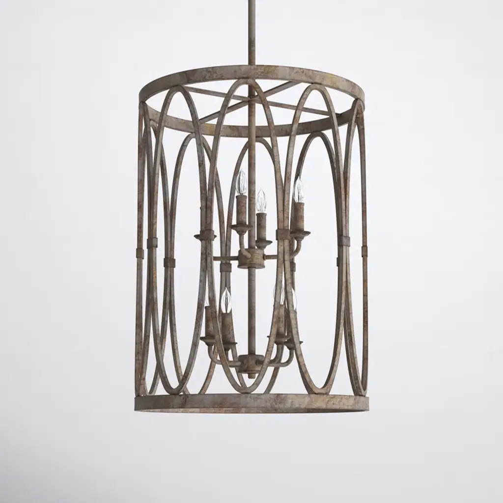 Elevate your space with this statement-making six-light chandelier, designed to impress with its drum-shaped silhouette and distressed metal finish. Crafted from steel, it features two tiers of candle-shaped lights that cast an ambient glow throughout the room. The included download and canopy ensure a seamless installation, while the damp location listing makes it versatile for various environments. Dimmable for customized lighting, this chandelier brings a touch of elegance to both residential and professional settings without over-promising resilience.