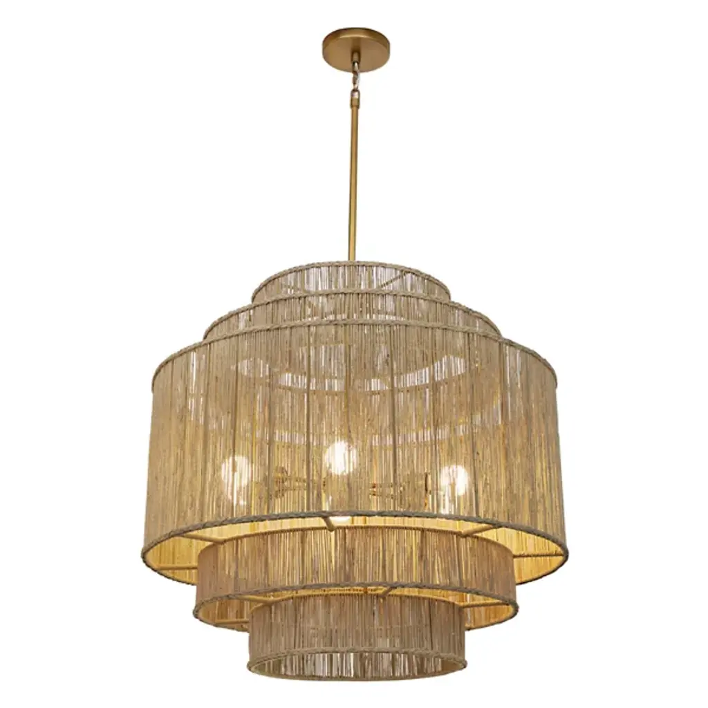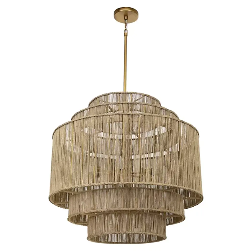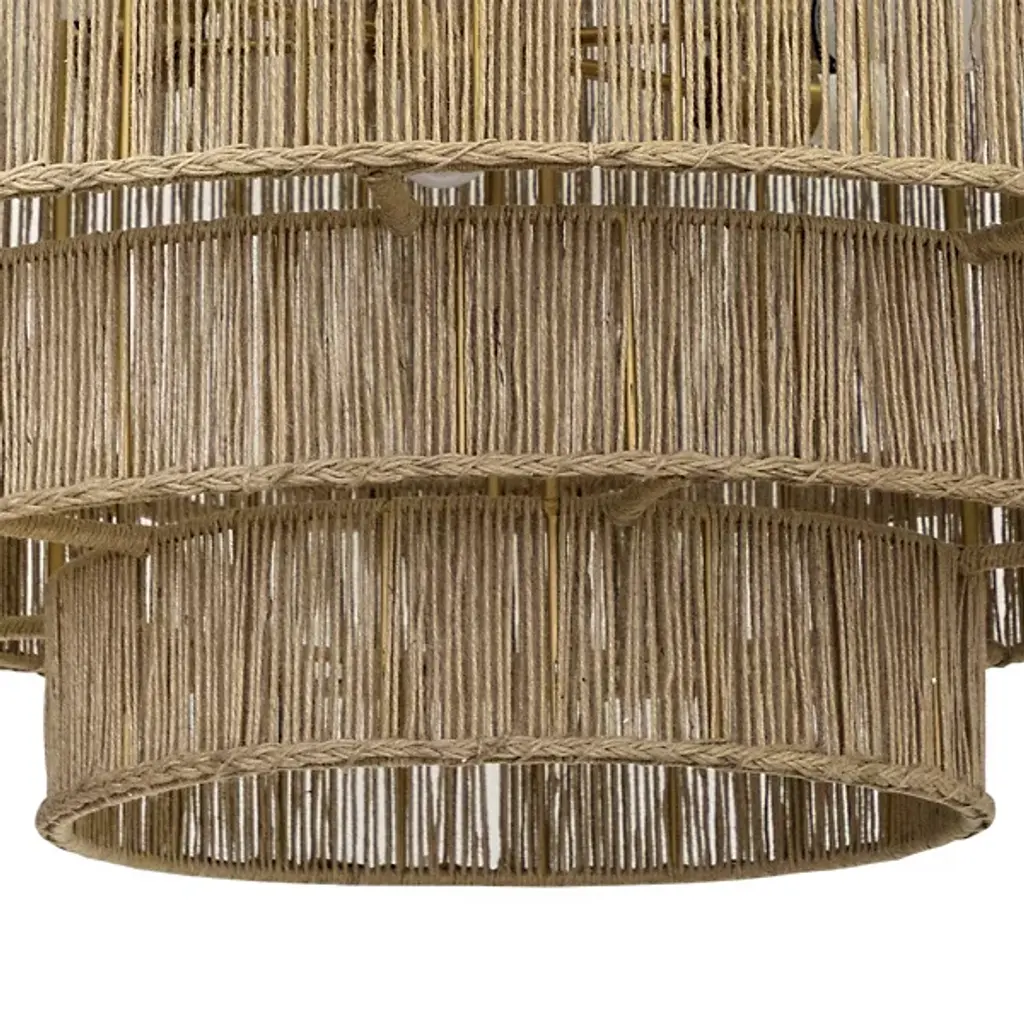 The Alyssa Chandelier from Sunpan showcases the timeless beauty of natural materials with its five-tiered design, each level meticulously handwoven from jute. This stunning fixture combines rustic charm with elegant craftsmanship and is suspended from an antique brass rod. The intricate weave filters light through, creating a soft, warm glow that brings a light and airy ambiance to any space. Whether gracing a dining room, entryway, or living area, the Alyssa Chandelier is a captivating focal point, blending texture and illumination.