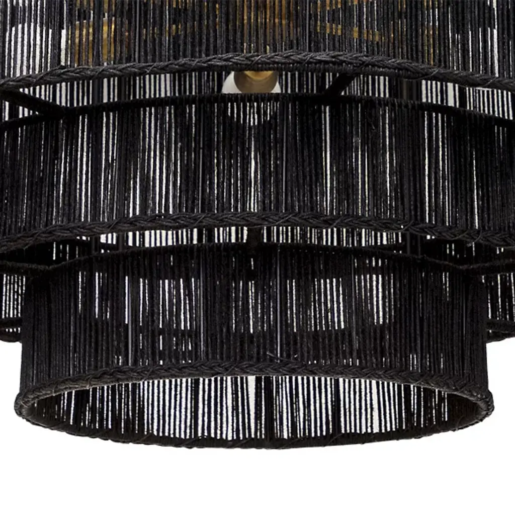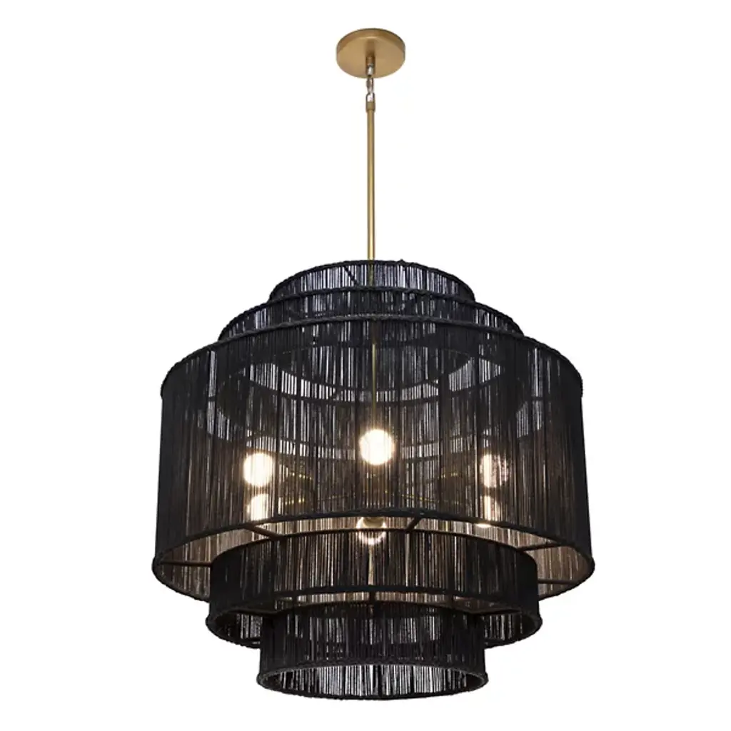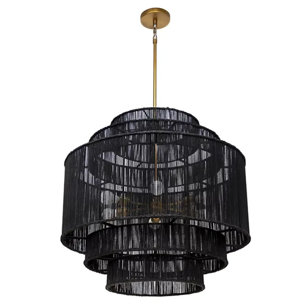The Alyssa Chandelier from Sunpan showcases the timeless beauty of natural materials with its five-tiered design, each level meticulously handwoven from jute. This stunning fixture combines rustic charm with elegant craftsmanship and is suspended from an antique brass rod. The intricate weave filters light through, creating a soft, warm glow that brings a light and airy ambiance to any space. Whether gracing a dining room, entryway, or living area, the Alyssa Chandelier is a captivating focal point, blending texture and illumination.