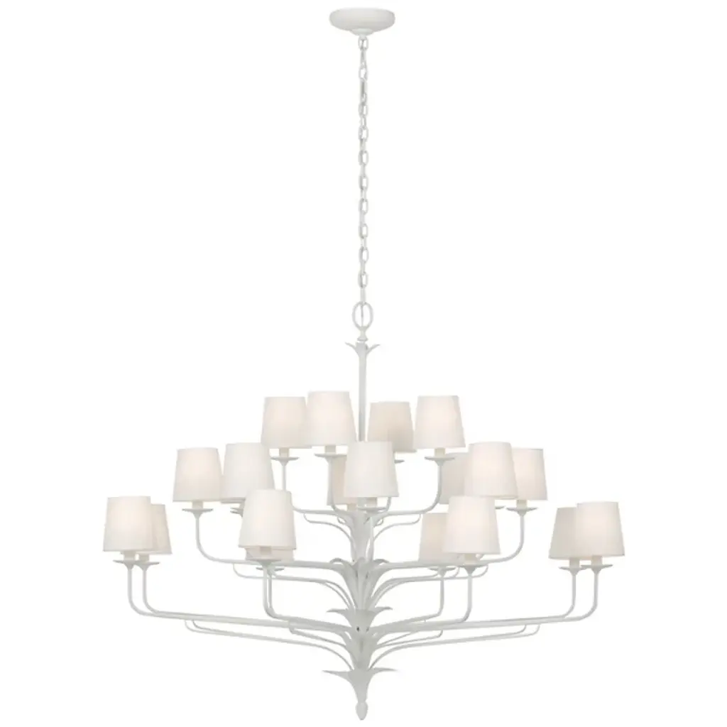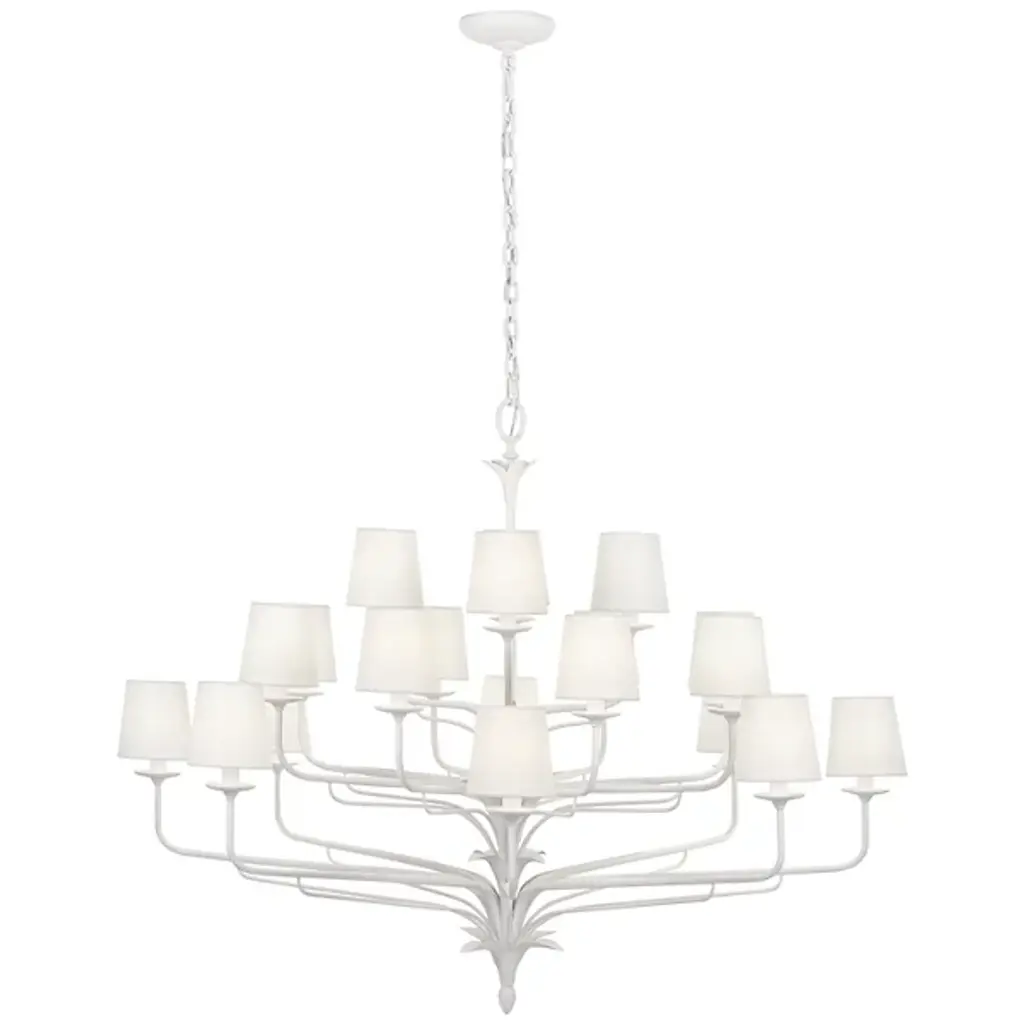 The Amalfi 3 Tier Chandelier from Visual Comfort Signature lends grand, nature-inspired elegance to any room. Designed by Chapman & Myers and well-suited to large, open spaces, the chandelier descends from a rounded canopy, with a chain and central stem suspending three tiers of branch-like arms arranged in harmonious layers. Each lower tier of steel arms stretches progressively wider, with each organic-themed arm holding a candelabra light crowned by a flared linen shade, casting a warm, layered glow. Damp-rated for versatile placement, this fixture combines artisanal design with modern sophistication.