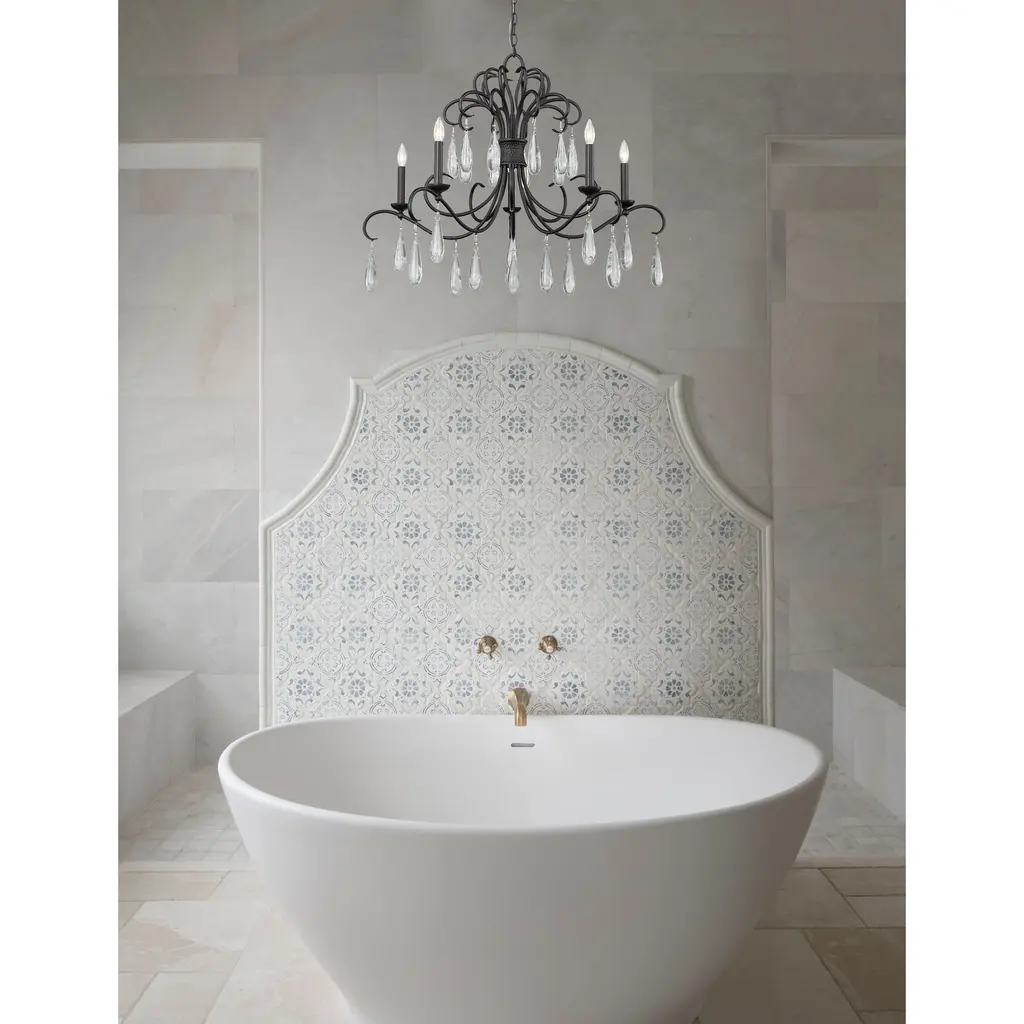 Sinuous scrolls and delicate crystal teardrops lend lush sophistication to a contemporary five-light chandelier. In matte black, it creates a rich, organic design element over an entry or in a dining room. Candelabra lights are a classic touch, offering a soft, warm glow for inviting ambiance.