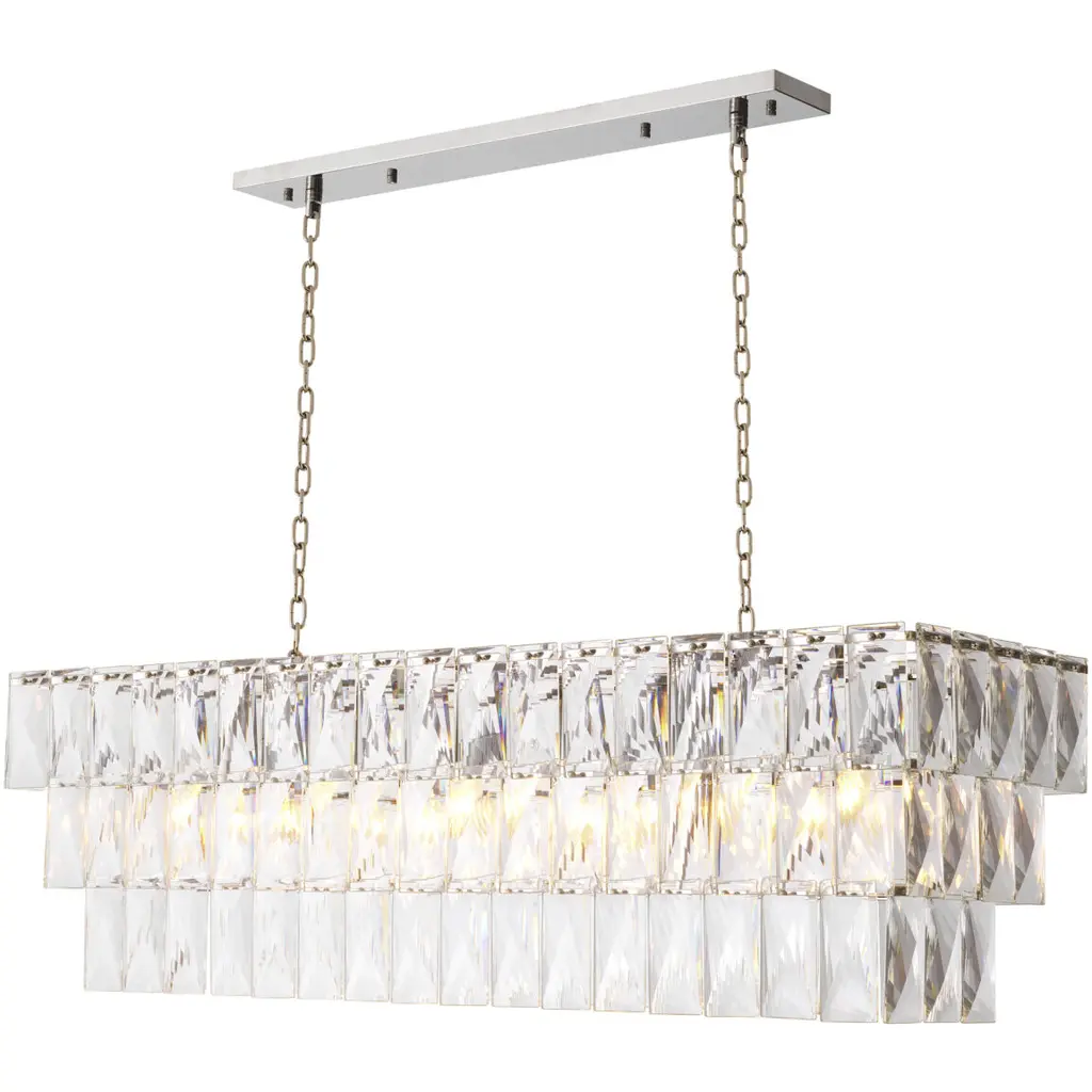 Add luxury and glamour to your hallway, living space or dining area with Chandelier Amazone. Boasting an impressive crystal glass fitting, this lustrous chandelier can illuminate an entire room. Moreover, it is an excellent way to show off your style. Suspended on two chains, it features a 3-layered nickel finish frame filled with rectangular smoke crystals that capture and refract light to create dramatic patterns on surrounding surfaces.
