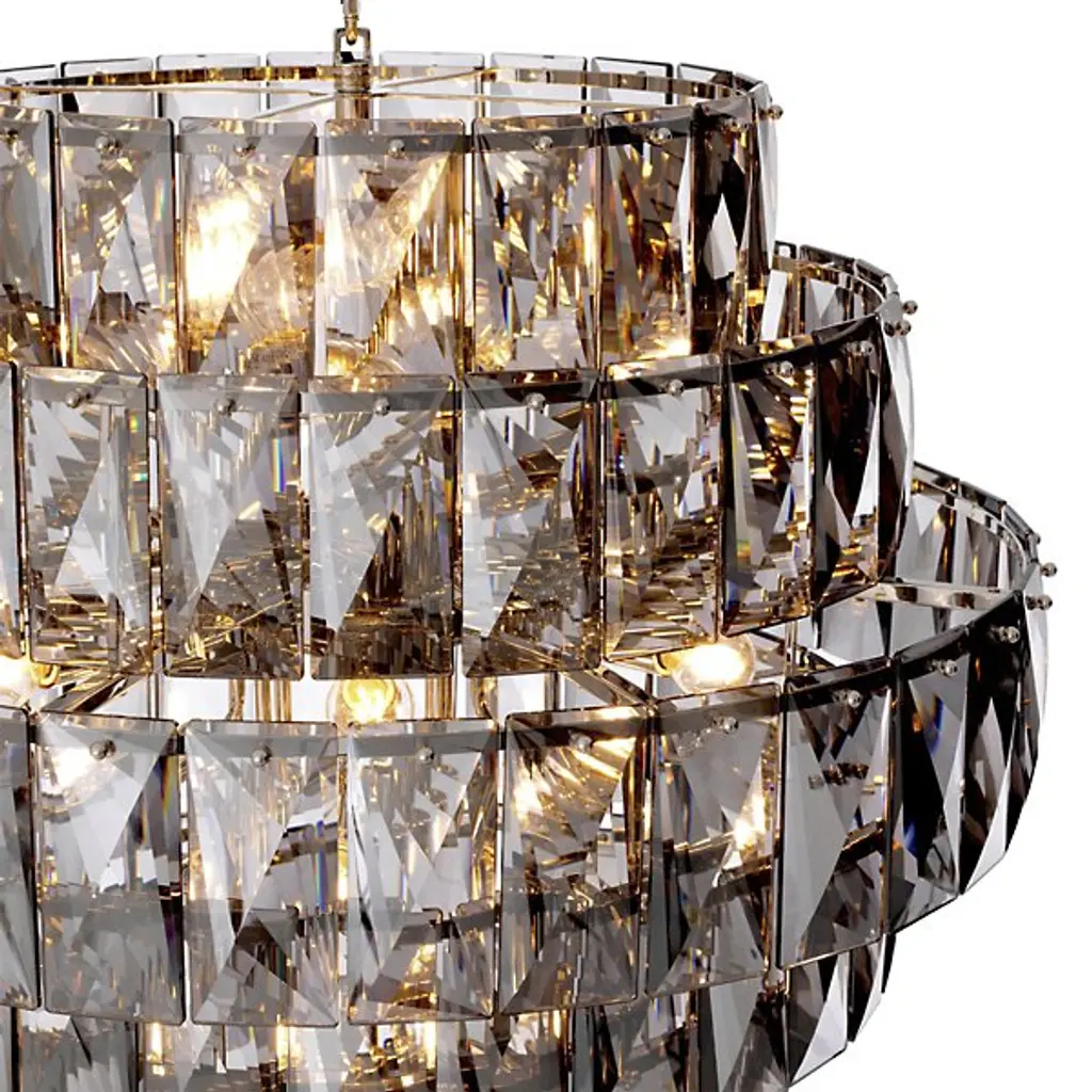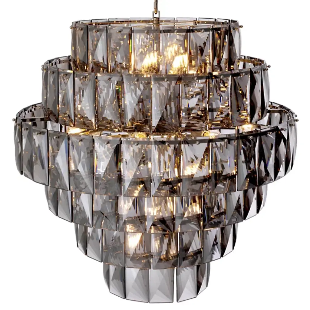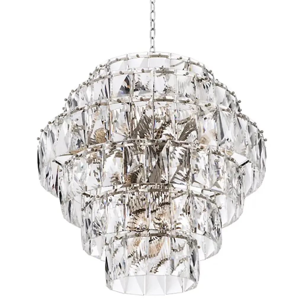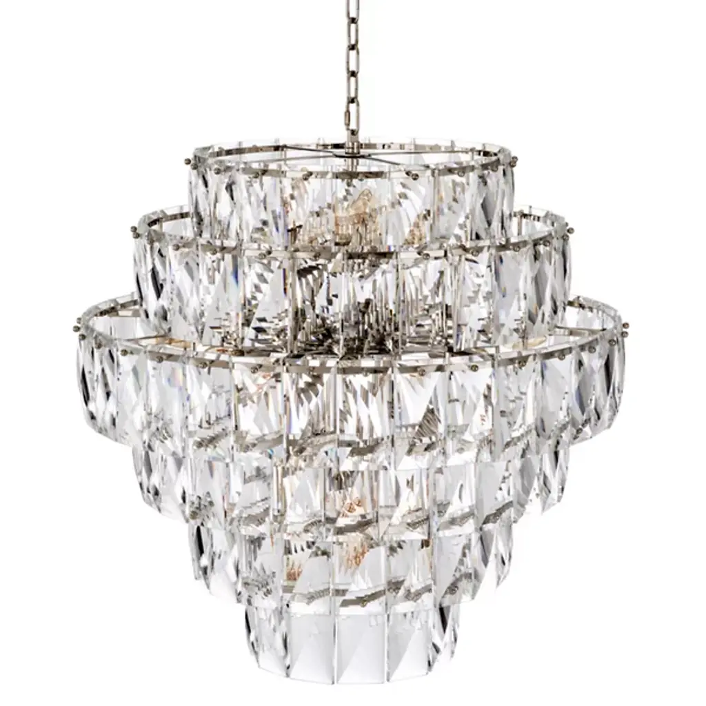 The Amazone Large Chandelier by Eichholtz has a dynamic, dramatic presence that elevates spaces with a balance of beautiful glass and light. Suspended by a linked chain, this piece features a collection of slim, rectangular glass plates that are neatly arranged in a series of tiers, creating a tapered silhouette that reflects, refracts, and filters a lovely layer of illumination throughout this design. Ideal for spacious rooms that are looking for an elegant, eye-catching addition, this chandelier is a glamorous way to brighten up the surroundings.