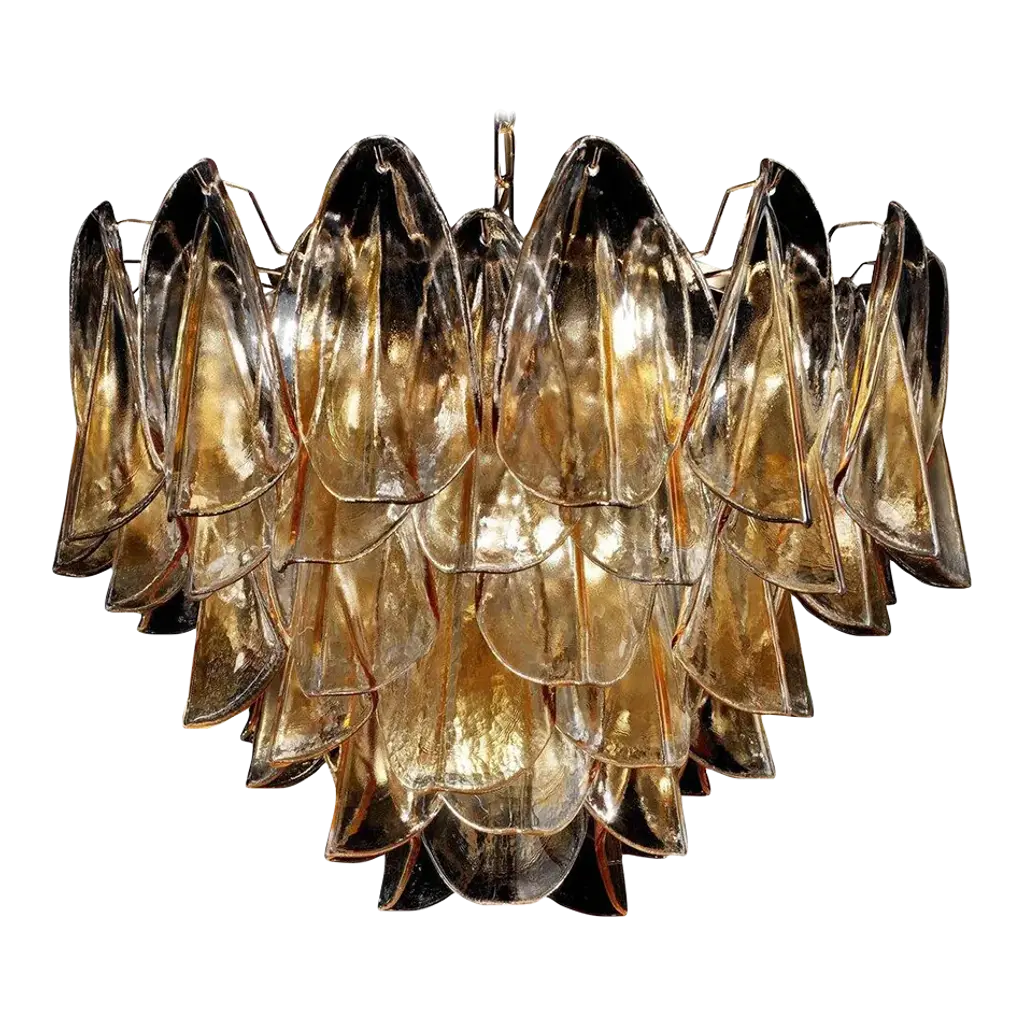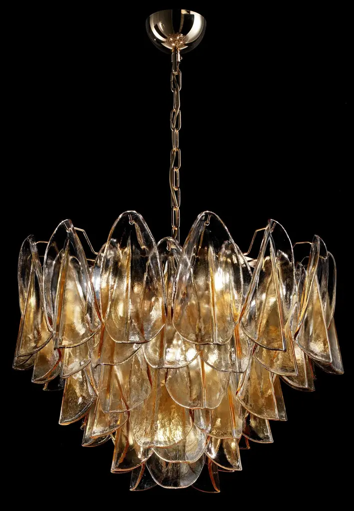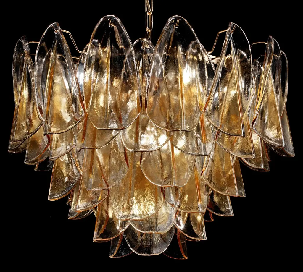 Italian chandelier shown with clear and amber Murano glass petals, mounted on 24 k gold finish metal frame / Designed by Fabio Bergomi for Fabio Ltd, inspired by Vistosi / Made in Italy7 lights / E26 or E27 type / max 60W eachMeasures: Diameter: 29.5 inches / height: 23.5 inches plus chain and canopyOrder only / This item ships from Italy.