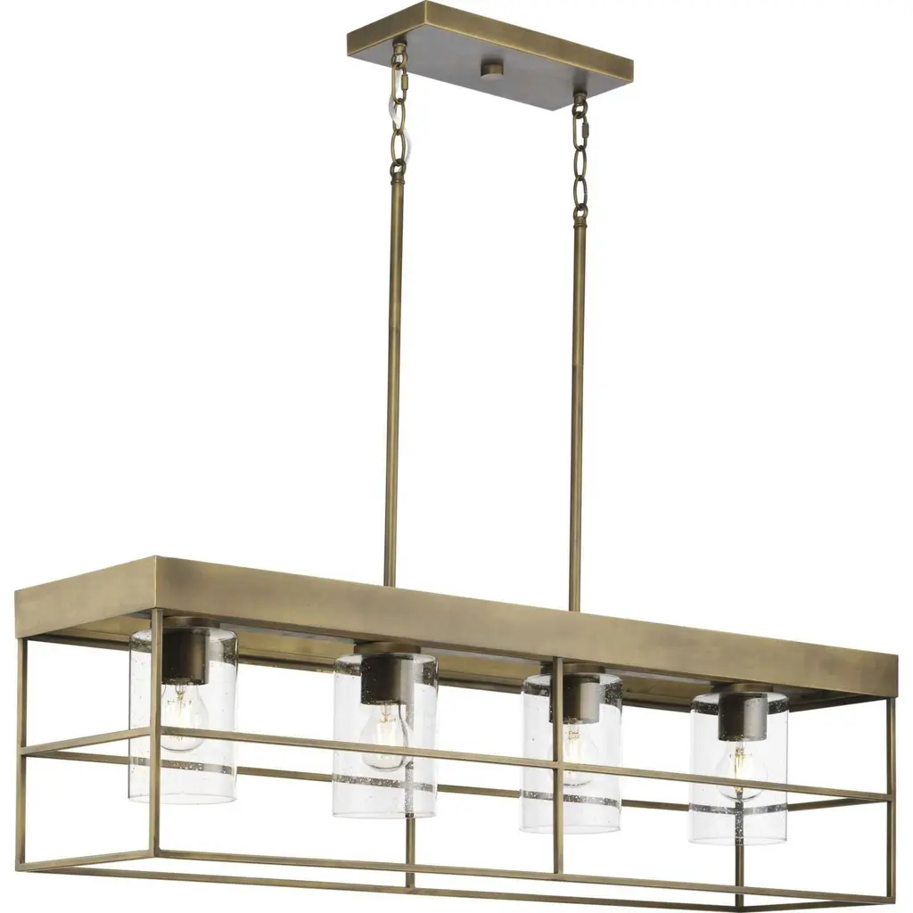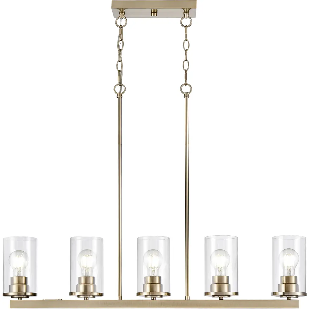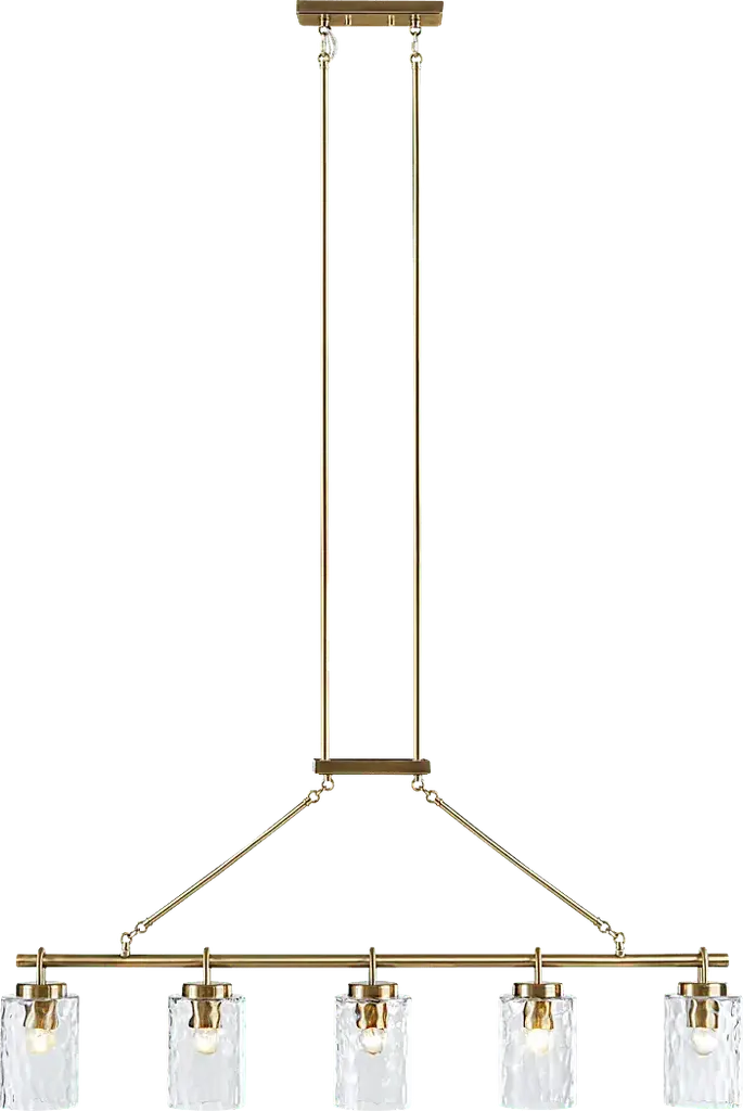 Elevate your space with the Amity Park Brass Chandelier. This stylish fixture blends transitional design with a modern touch, featuring a sleek antique brass finish and five textured glass cylindrical shades. Perfect for entryways, dining rooms, or above kitchen islands, the adjustable rod allows for customized hanging heights. Professional installation by an electrician is recommended.