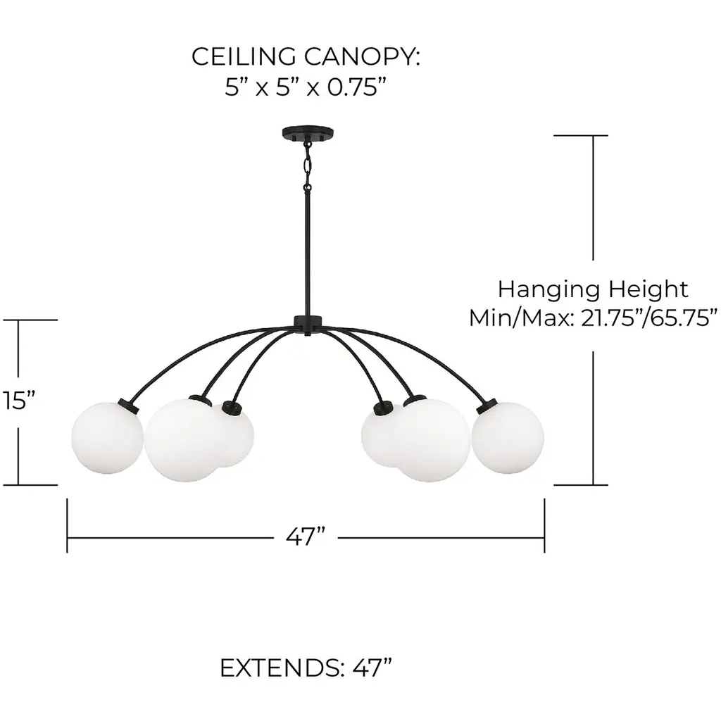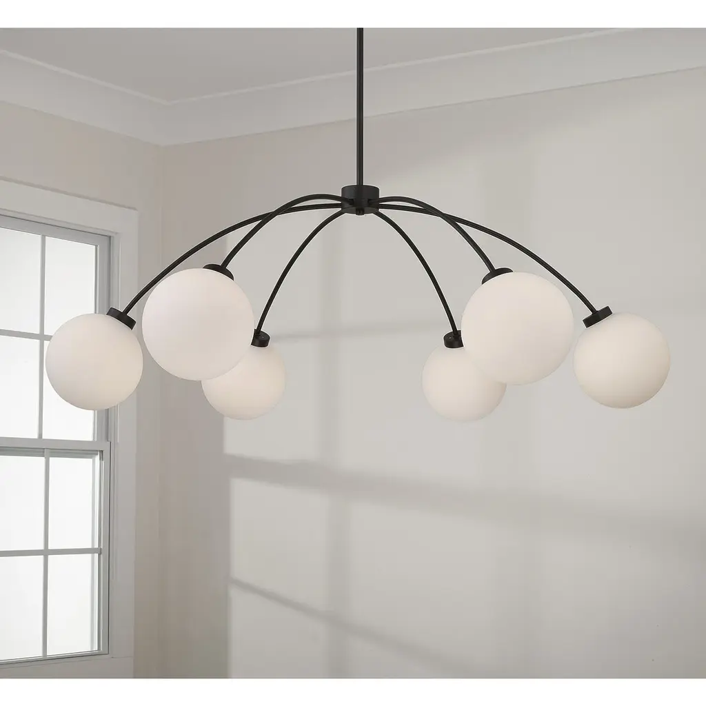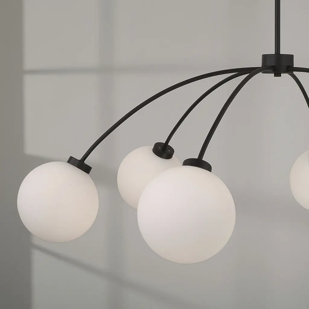 Bring modern curves and high contrast to any space with the Amos Large Chandelier. The Soft White glass globes almost seem to float at the bottom of the curved arms, while the Black Iron finish creates subtle texture for added visual appeal.