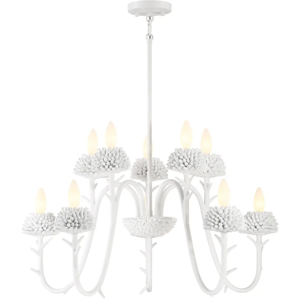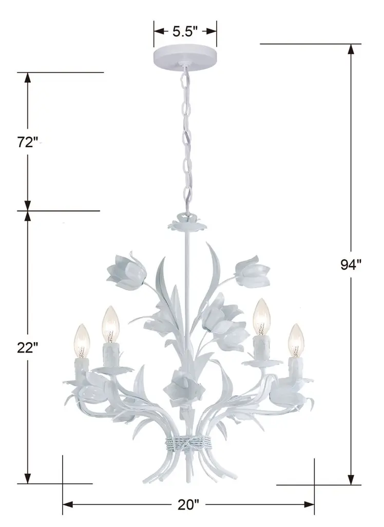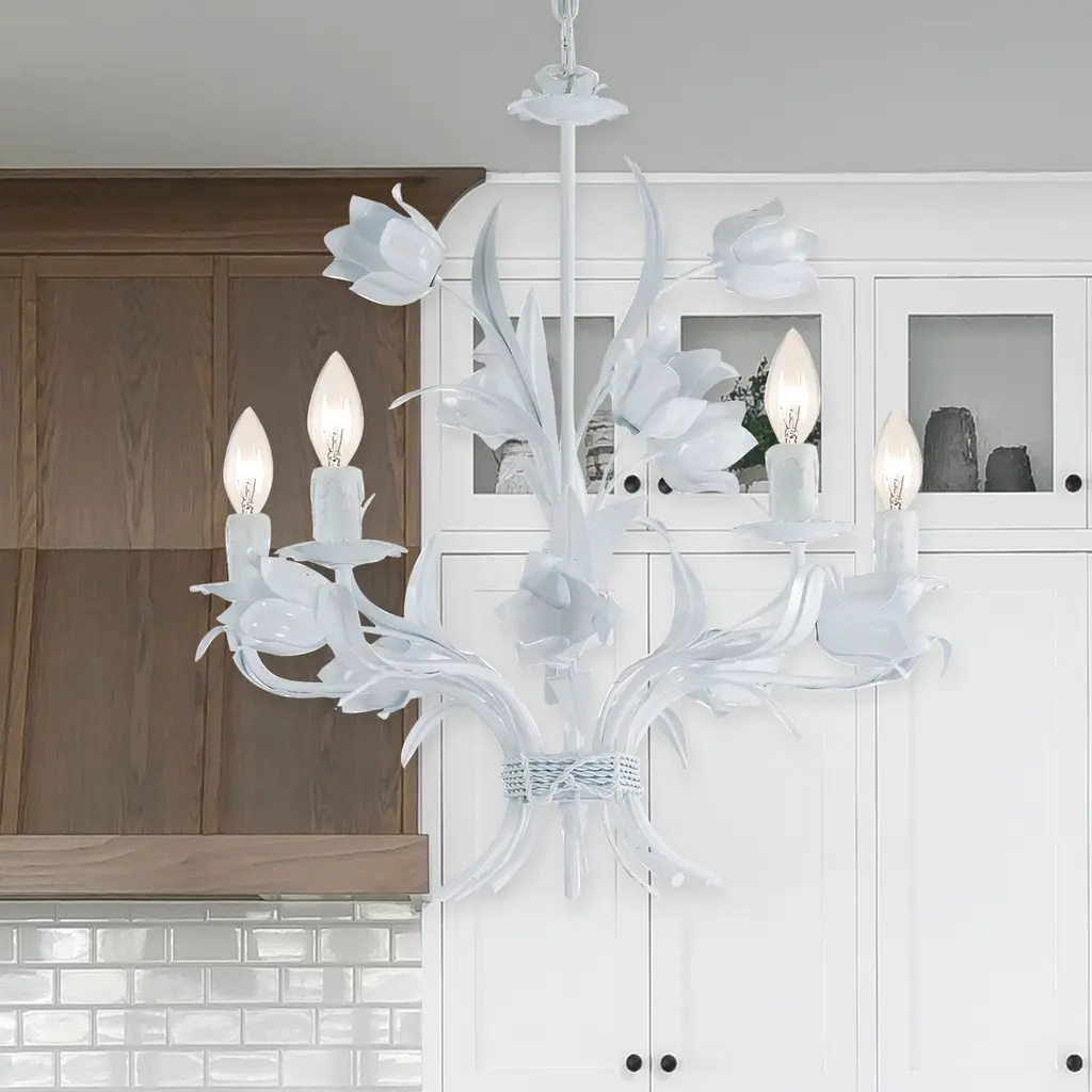 The glossy white finish of this tulip-bedecked chandelier maximizes the light from its bulbs. It's a year-round reminder of the joys of spring. Hardwired.