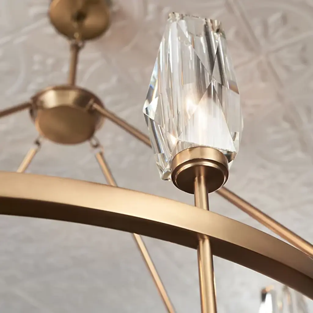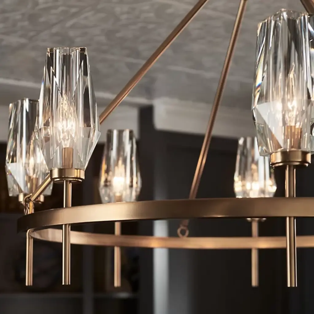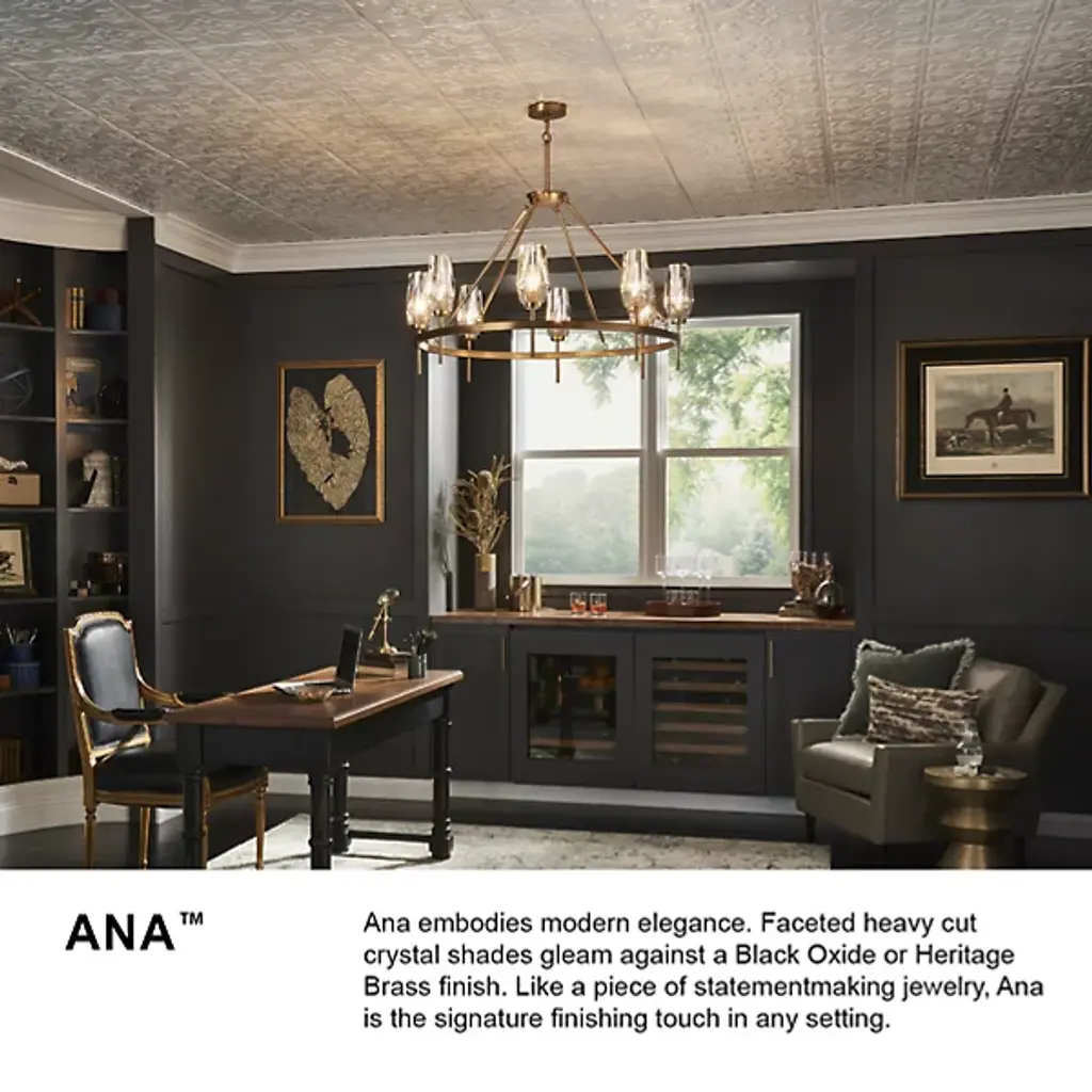 Few things say elegance like the warm, brilliant highlights jumping off a piece of finely cut crystal. The Ana Chandelier from Hinkley Lighting showcases the dazzling properties of glass in a refined modern design. A steel ring frame and suspension give the piece an open feel. Slotting into the ring frame, trim metal stems combine with the shades to create an abstracted floral quality. Captivating with a variety of facets, clear crystal shades amplify the glow of the bulb inside. The shimmering light brings your room or foyer an alluring ambiance.