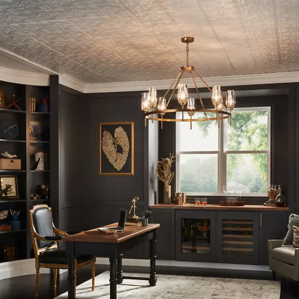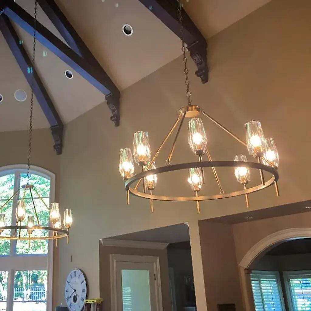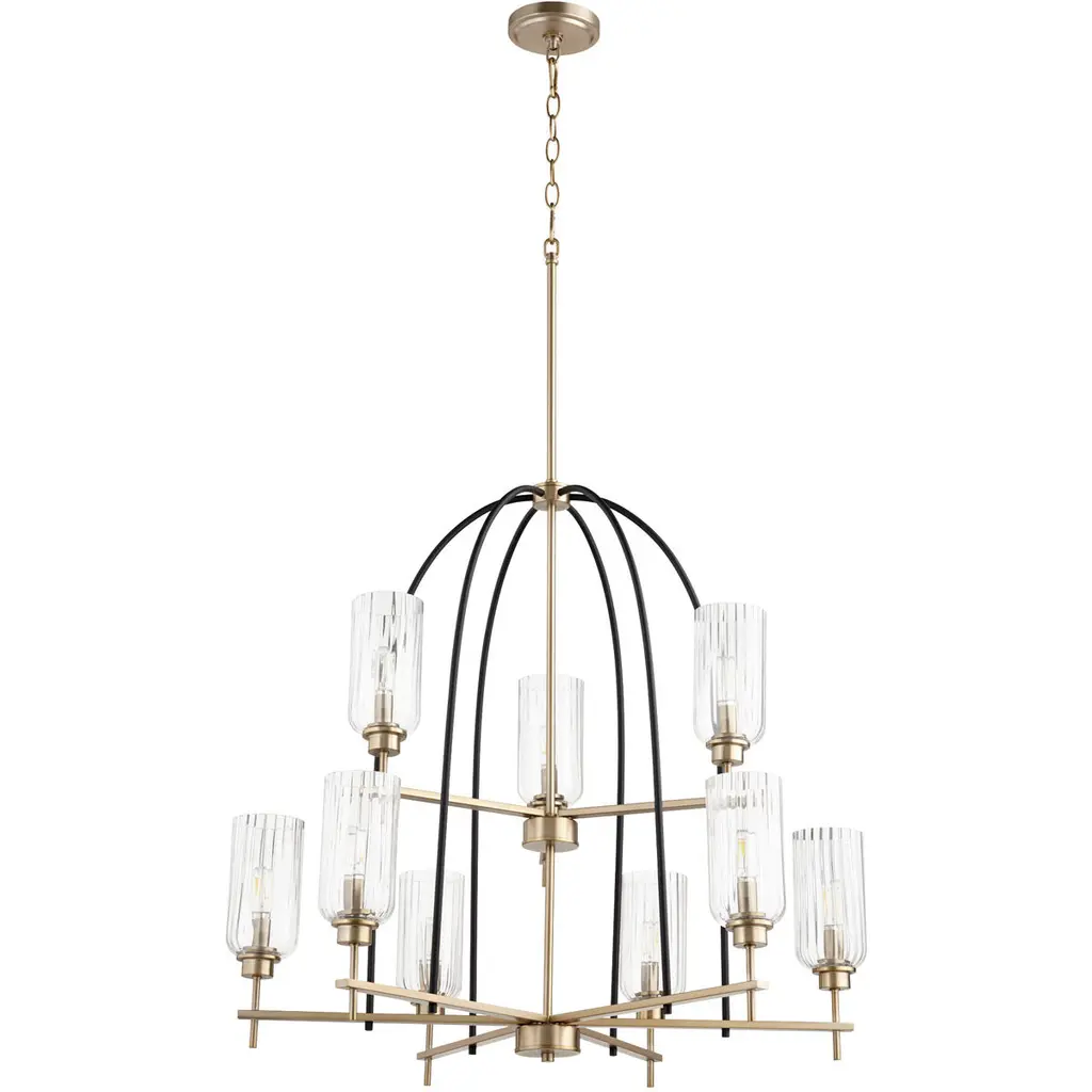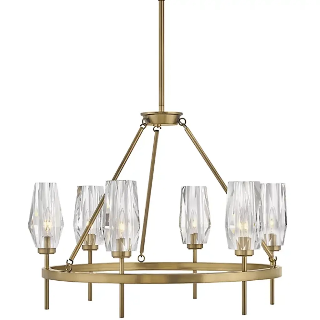 Few things say elegance like the warm, brilliant highlights jumping off a piece of finely cut crystal. The Ana Chandelier from Hinkley Lighting showcases the dazzling properties of glass in a refined modern design. A steel ring frame and suspension give the piece an open feel. Slotting into the ring frame, trim metal stems combine with the shades to create an abstracted floral quality. Captivating with a variety of facets, clear crystal shades amplify the glow of the bulb inside. The shimmering light brings your room or foyer an alluring ambiance.