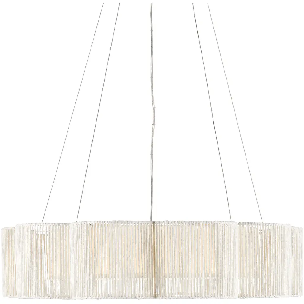 Scallops of Kraft paper twine fold around the wrought iron frame of the Ancroft Chandelier to form a delicate flowing silhouette. The string has a white finish that works in concert with the contemporary silver leaf on the metal to keep the white chandelier light and airy. This is enhanced by the fact that it is hung from aircraft cable, which is adjustable. The integrated LED light flows through a diffuser fitted to the bottom of the shade.