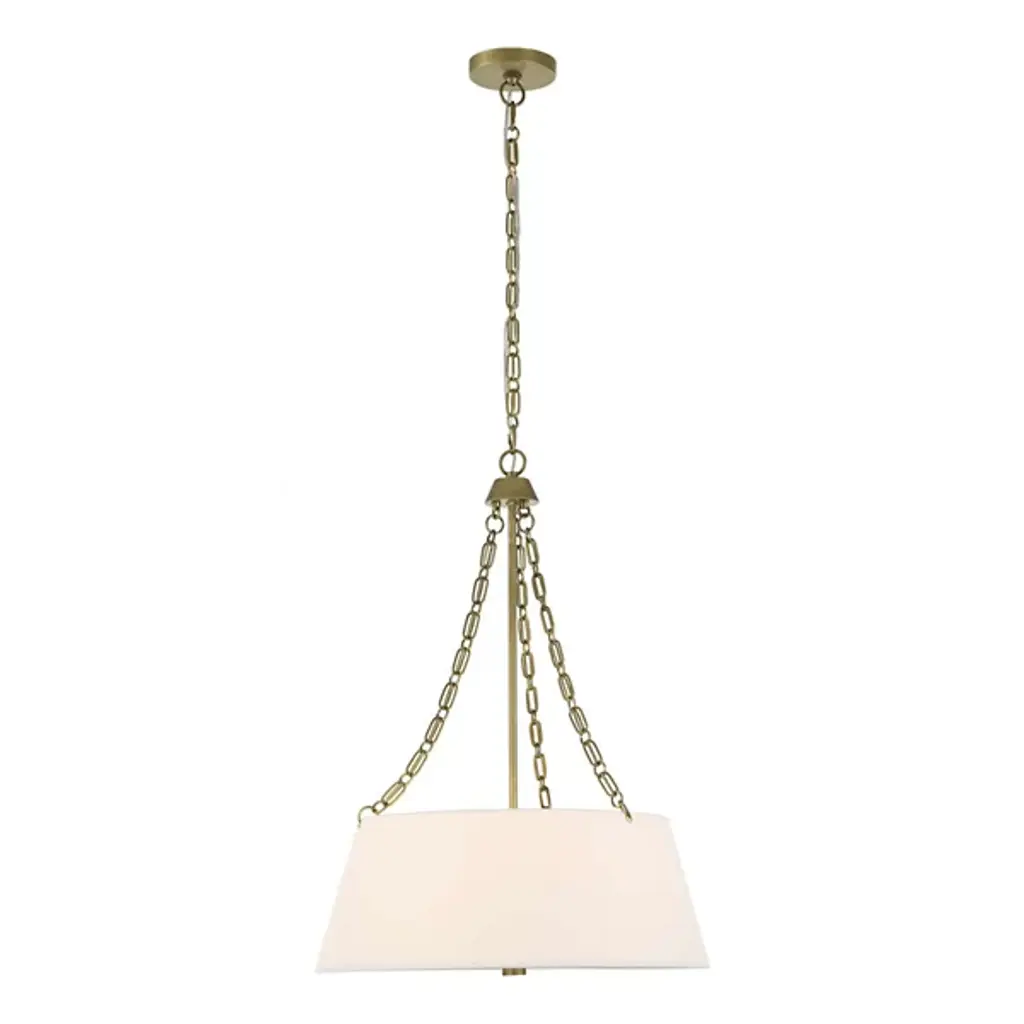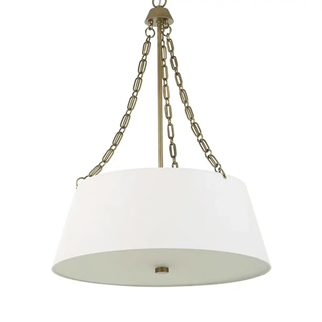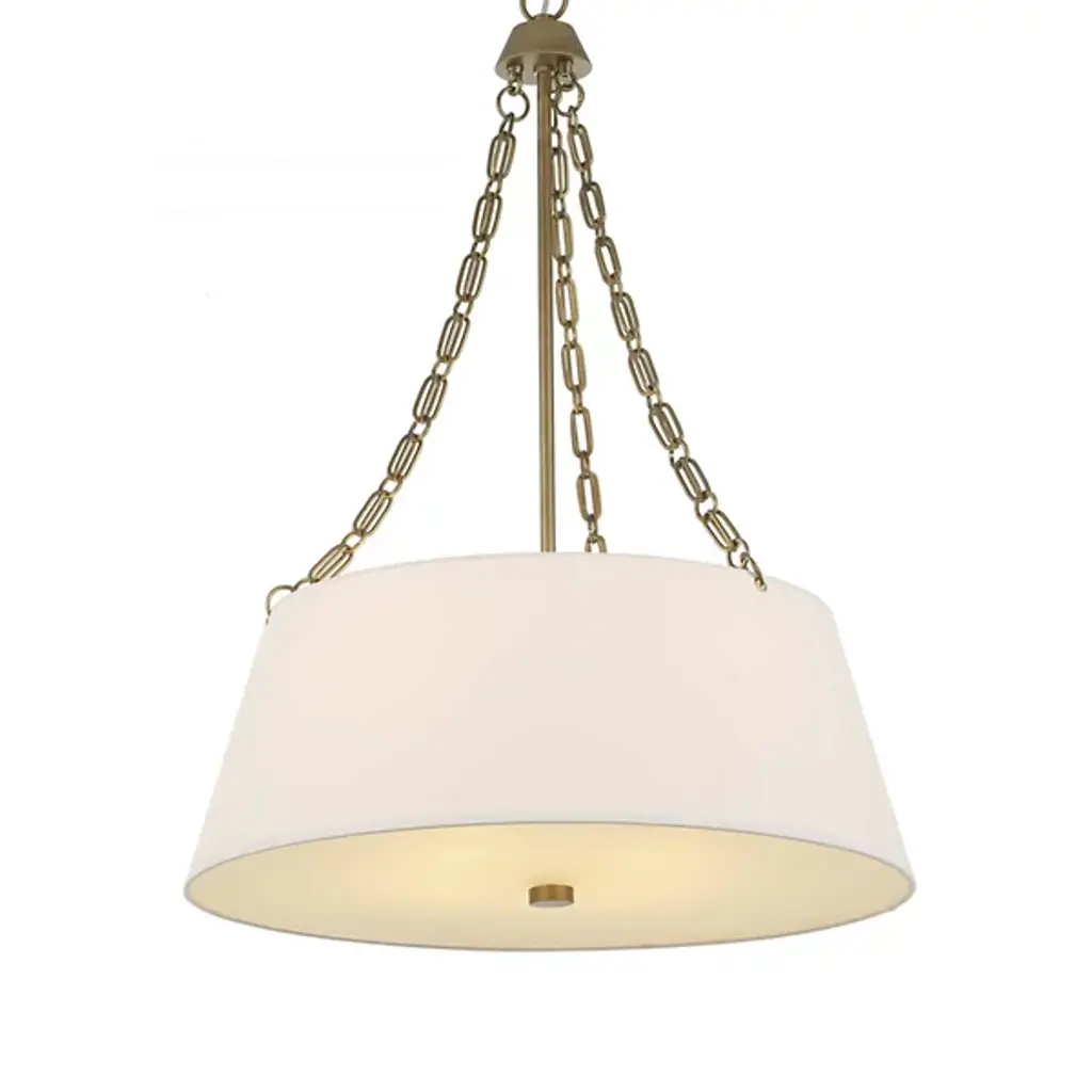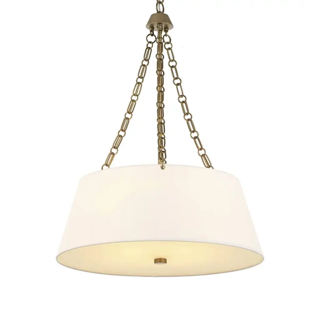 The Andalucia Chandelier from Uttermost presents classical proportions with artisanal chain detailing that recalls traditional Spanish ironwork. Sergio Orozco Designs reimagined historic metalworking techniques through custom double oval links that create visual texture above the primary linen shade. The tapered fabric drum provides soft light diffusion while maintaining clean geometric lines. A secondary glass diffuser positioned below adds layered illumination control, while the decorative chain suspension system becomes an integral design element rather than mere functional hardware
