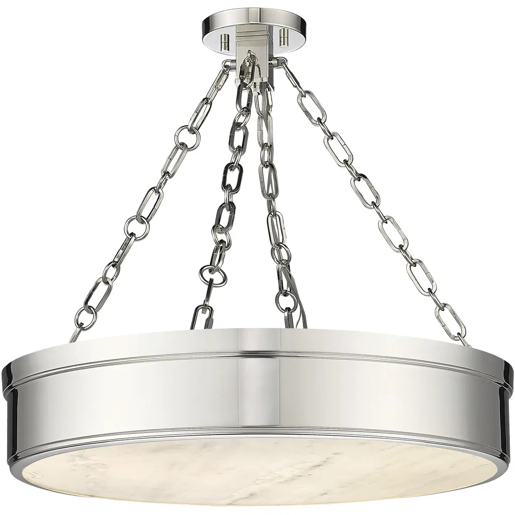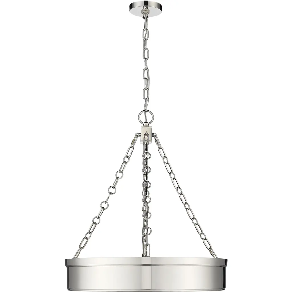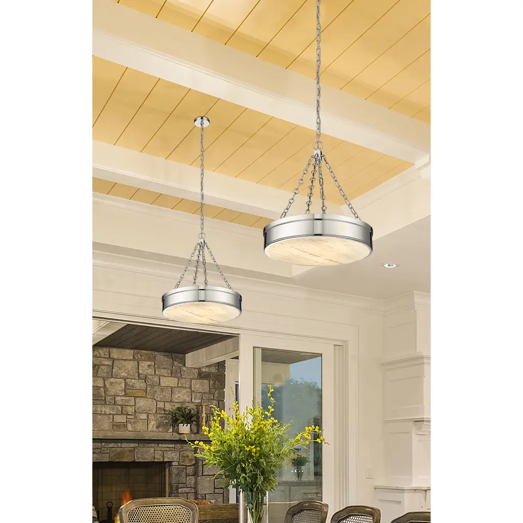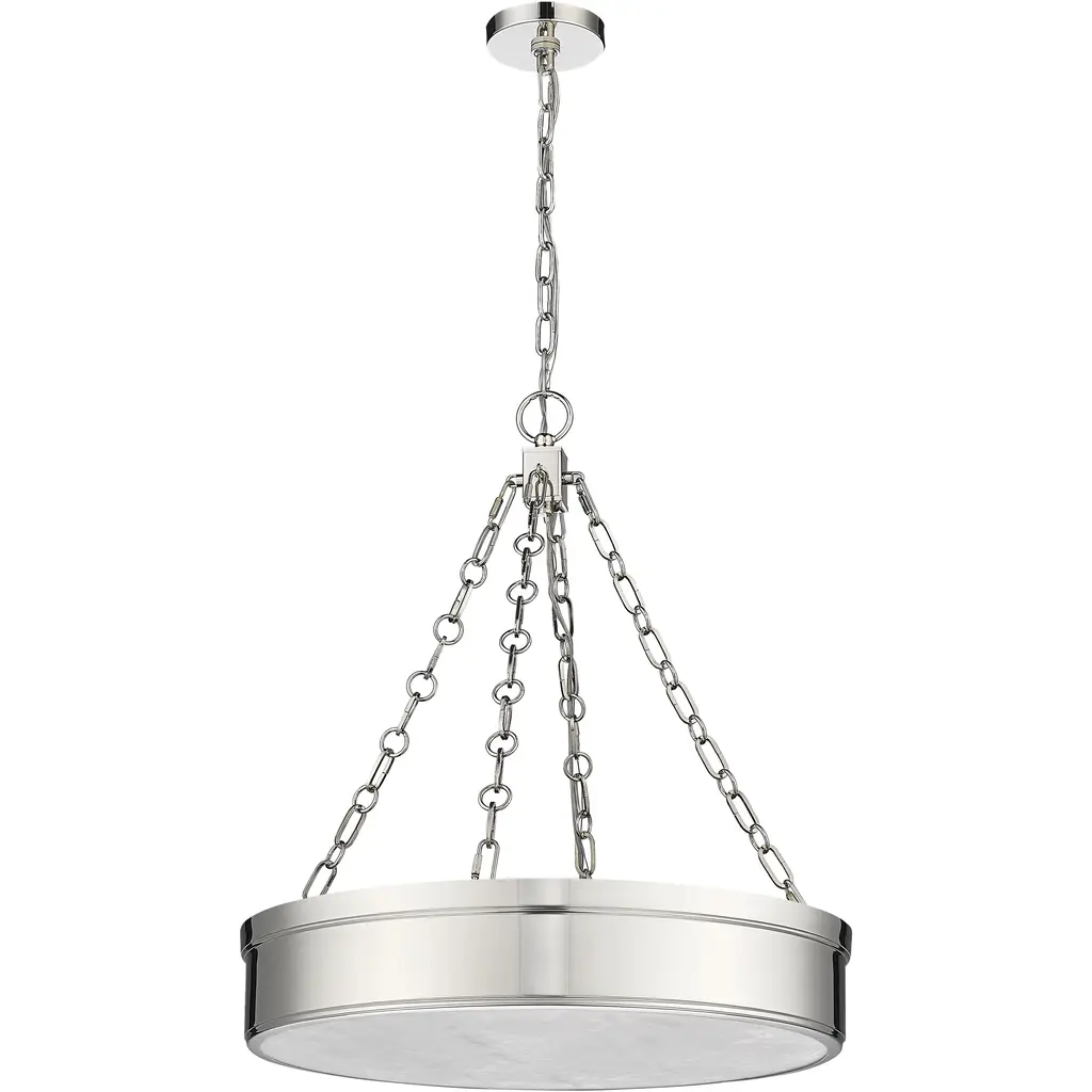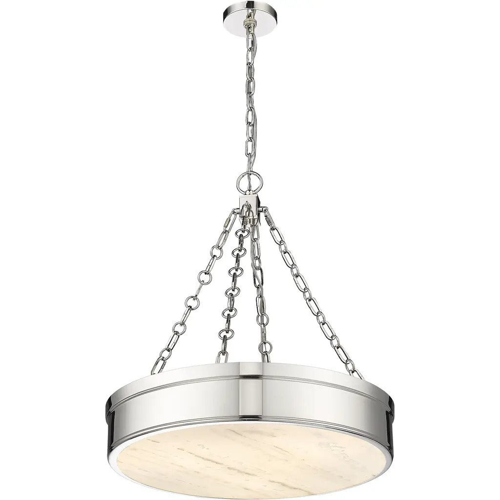 Versatile in design, this three-light LED pendant light suits decor schemes from industrial to modern and adds a sleek minimalist look. A ring design crafts simplicity in a fixture from the Anders collection, featuring a pleasing polished nickel finish steel circular frame suspended from cable chains reinforcing a symmetrical aesthetic. With a translucent alabaster diffuser, soft ambient lighting adds a warm glow to kitchens, living areas, and entryways.