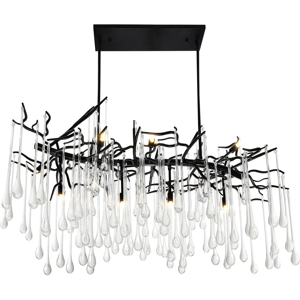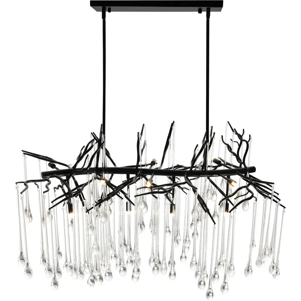 Bring art and atmosphere to your interior with the Anita 10-Light Linear Chandelier in Black. Designed to dazzle, this sculptural lighting fixture from the Anita Collection blends nature-inspired elements with modern sophistication. The elongated silhouette features branch-like arms that stretch gracefully across your space, each accented by shimmering clear crystal drops that sparkle in the light. Finished in a classic black, this chandelier feels effortlessly current while maintaining timeless charm. Perfectly suited for contemporary kitchens, dining rooms, or loft-style living areas, its 47-inch length ensures a commanding presence, especially when hung over a long table or island. Ten G9 bulb sockets offer generous light output and compatibility with both halogen and LED options. Adjustable chains let you fine-tune the hang height to suit your ceiling, while the included hardware and installation guide make setup straightforward. Elevate your home with a fixture thats both a source of light and a piece of sculptural art. The Anita 10-Light Linear Chandelier brings refined drama to any room.
