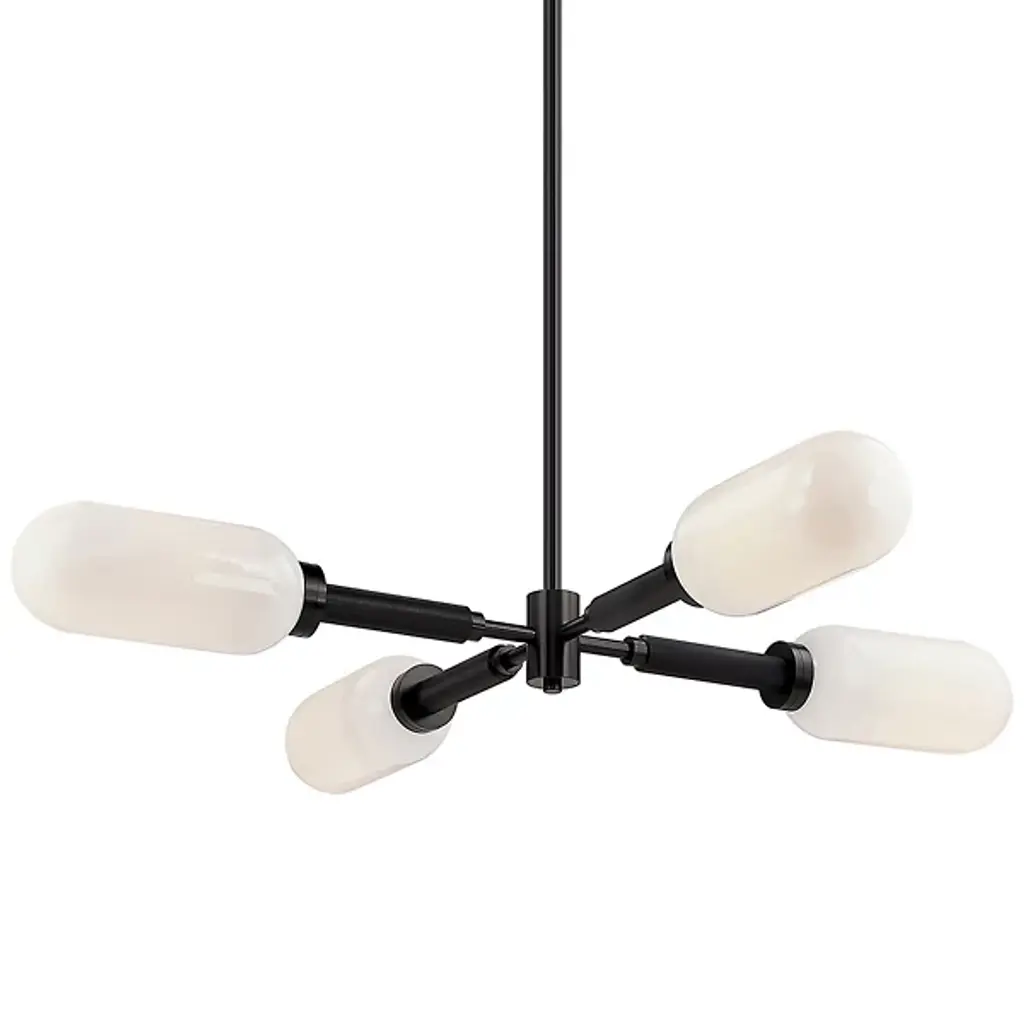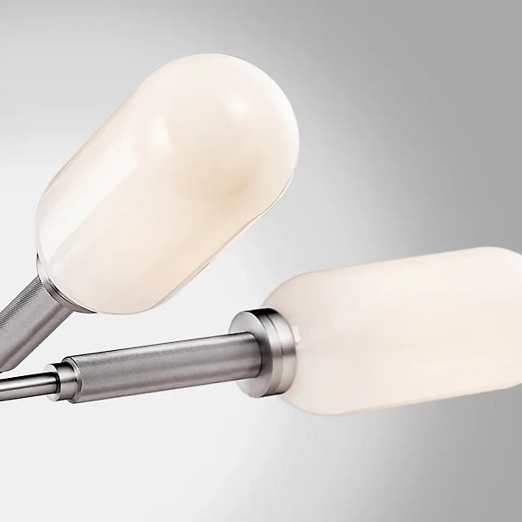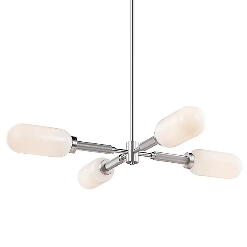 Sleek, industrial-inspired lighting design for modern interiors. The Annex 4-Light Chandelier by Troy Lighting features 4 capsule-shaped White Opal Glass shades that fully enclose the light source within and ensure even, glare-free dispersal of ambient light. The smoothness of these shades stands out in contrast to the texture provided by the Solid Aluminum frame. Each light holder has a micro-textured surface similar to that often found in metal cabinet pulls, grab bars and hand weights; it’s an unexpectedly lovely industrial design element. In a modern dining room or entryway, this chandelier will be the bright and urbane centerpiece you’ve always wanted.