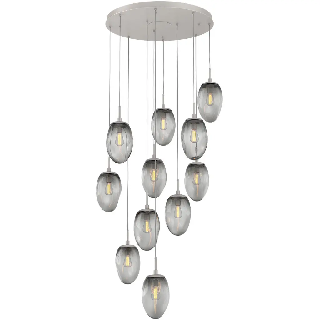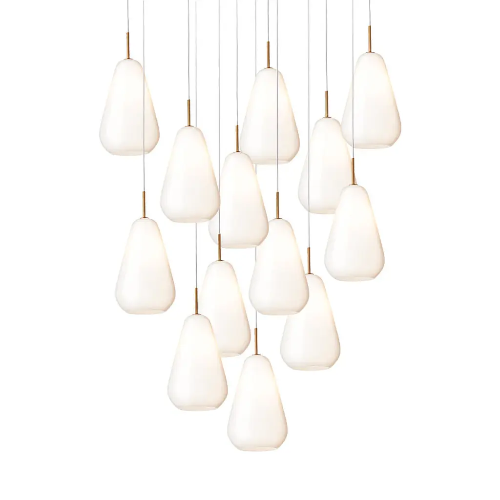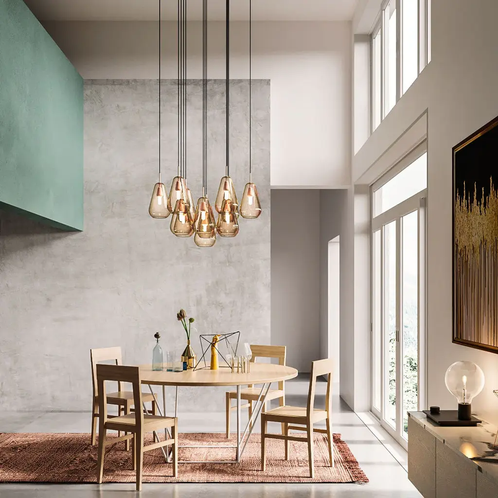 The Anoli chandeliers are created with inspiration from the Nordic nature. The Anoli 13 chandelier consists of 13 drop-shaped pendants, and the elegant mouth-blown glass shades symbolize silent raindrops on an autumn day. The natural teardrop shape creates calm and balance in the interior, and the chandelier is suitable above a round dining table or in the corner of a living room.