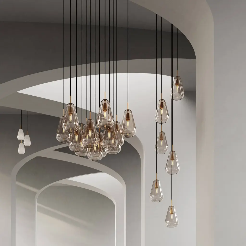 With a half-dozen of its mouth-blown glass pendants massed together, this chandelier clearly alludes to the tranquility of falling droplets of rain which originally inspired Nuura's series Anoli. The Danish brand's cofounder Sofie Refer encapsulates the warm Nordic light with hand-painted glass in a delicate golden color and metal hardware in the same subtle shade. Imagine the chandelier's magical effect in a hall or sweeping staircase or in a living area to illuminate a dusky corner.