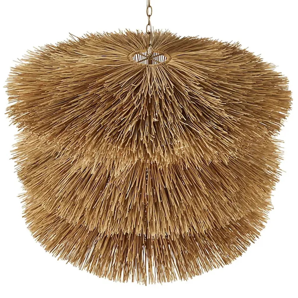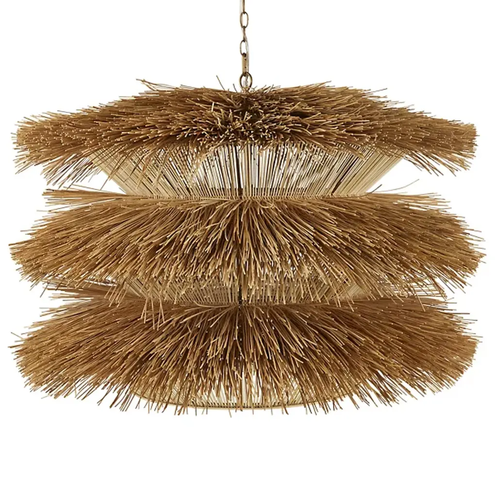 Elevate your space with the captivating allure of the Ansari Chandelier from Arteriors. Natural, sustainable rattan intricately woven across the tiers creates a rich textural contrast. Anchored by an iron pipe finished in antique brass, this architectural fixture hosts three bulbs on an inside mount, casting a unique and enchanting glow throughout. Each piece is distinct, and the finish variations enhance its character, making it a striking and eco-friendly addition to your interior.