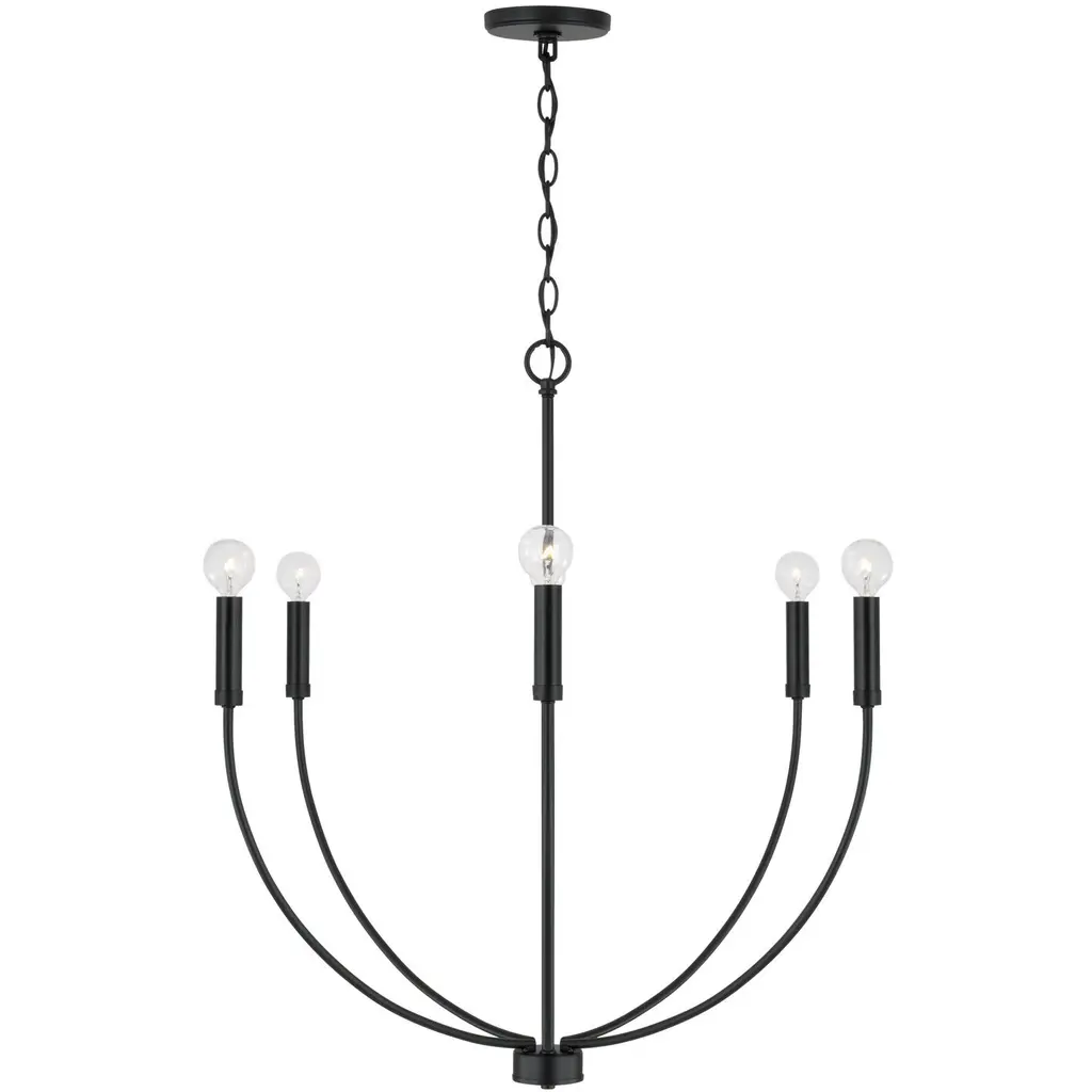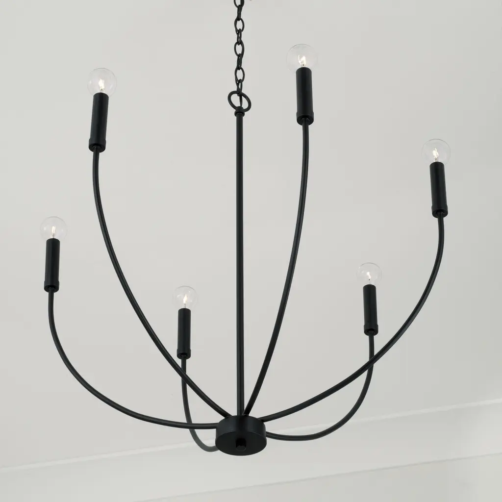 A classic shape refreshed with sleek contours and sweeping curves, the Ansley 6-Light Chandelier for HomePlace makes a statement that suits every style. The elongated arms and open silhouette invites standout style that doesn't overpower, while the Matte Black finish creates sophisticated contrast.