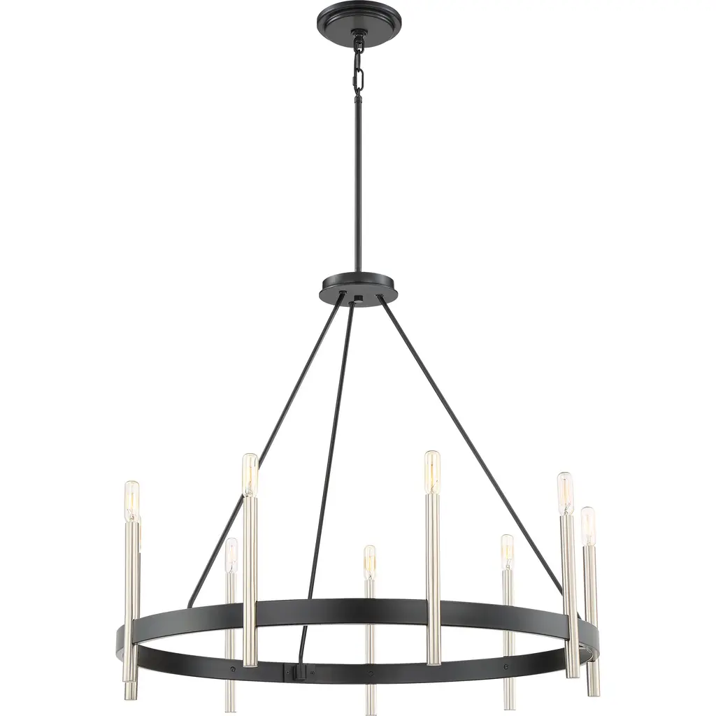 The Anthem is a master class in minimalist elegance. A simple circular frame in matte black hosts a series of exaggerated candle sleeves in lustrous brushed nickel. The contrast in scale and finish creates drama in the otherwise modest design.