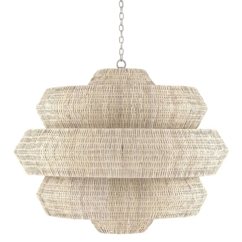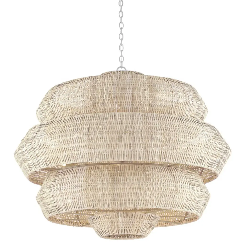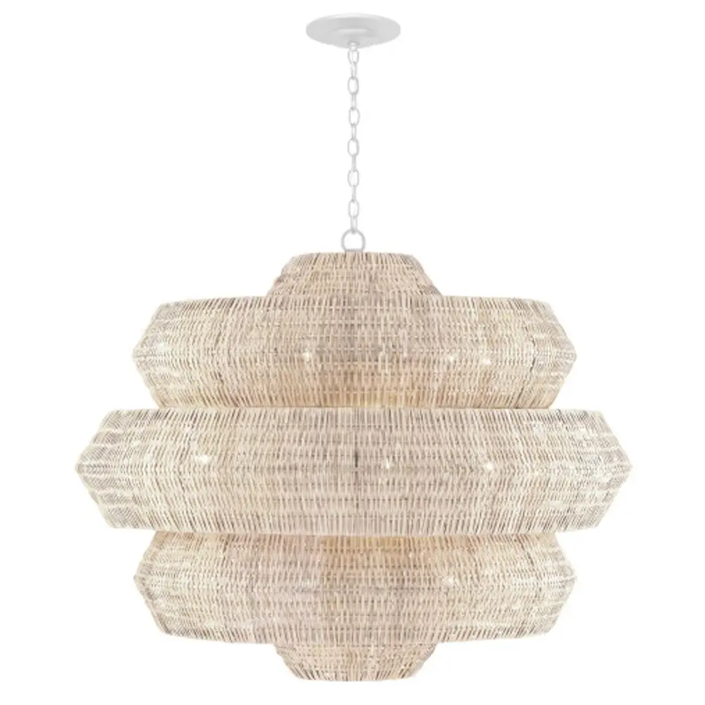 The Antibes Chandelier is crafted from natural bleached rattan woven over a geometric wrought iron frame. Its design offers a choice between a petite or bold scale, making it suitable for various spaces while maintaining a light and airy feel. Multiple bulbs are nestled within, providing ample illumination and highlighting the texture of the natural materials. The chandelier is adjustable with the use of an included chain/rod kit/cable.