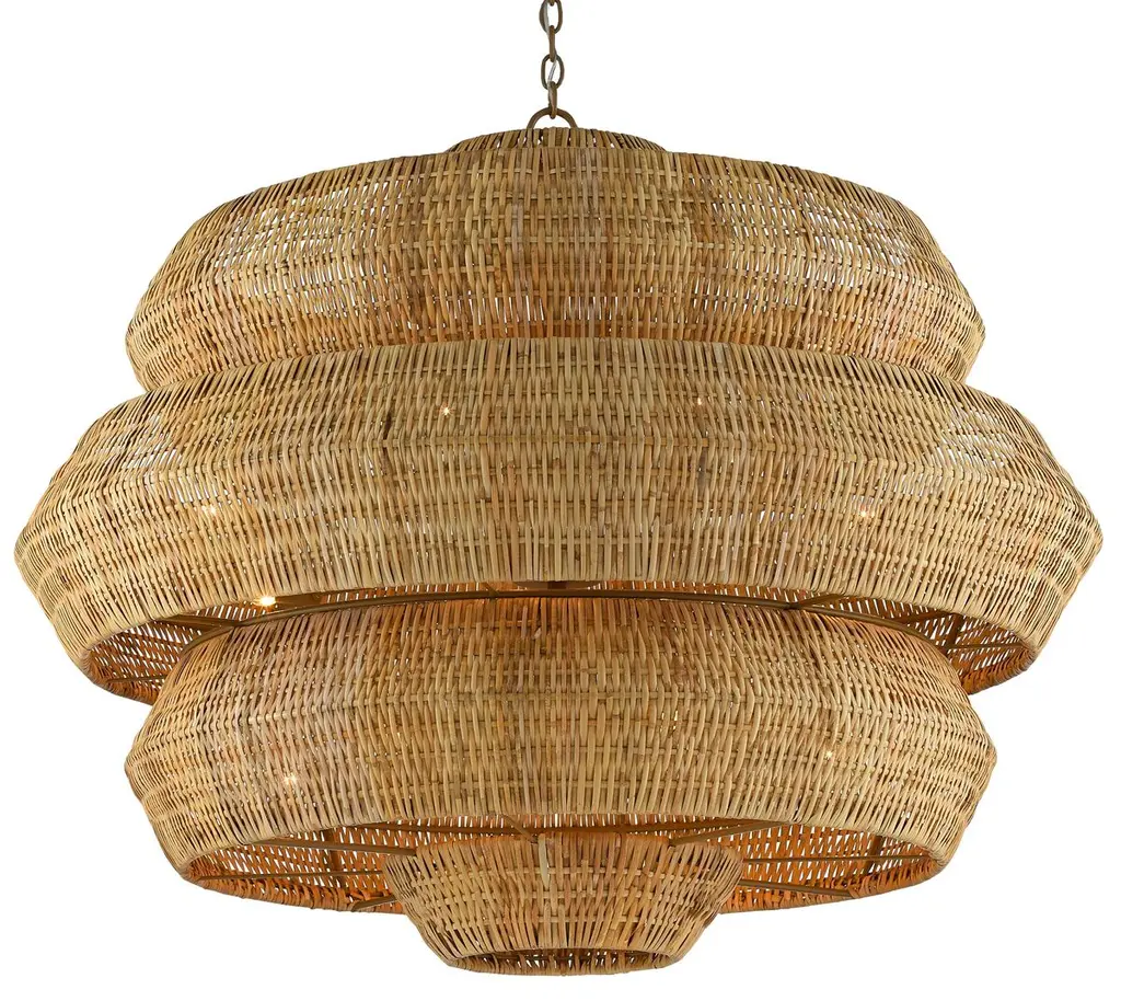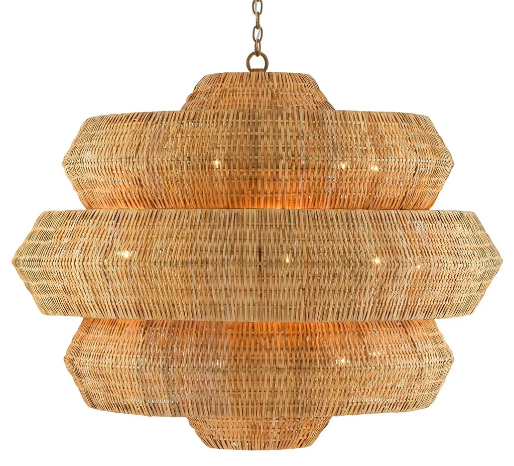 The Antibes Chandelier is crafted from natural bleached rattan woven over a geometric wrought iron frame. Its design offers a choice between a petite or bold scale, making it suitable for various spaces while maintaining a light and airy feel. Multiple bulbs are nestled within, providing ample illumination and highlighting the texture of the natural materials. The chandelier is adjustable with the use of an included chain/rod kit/cable.