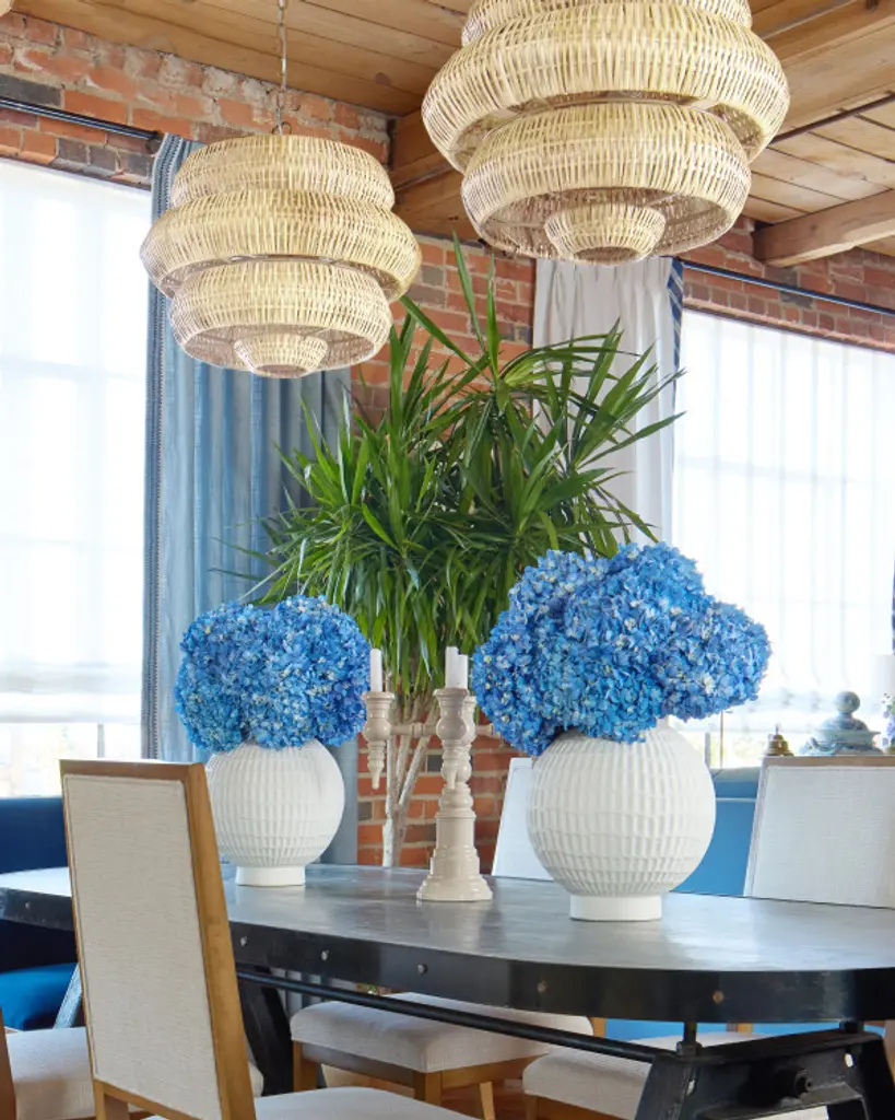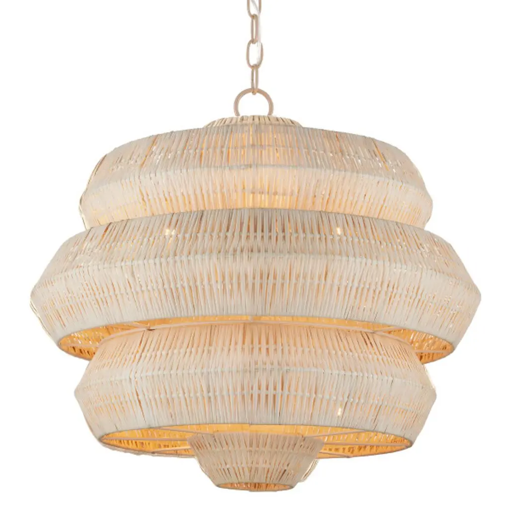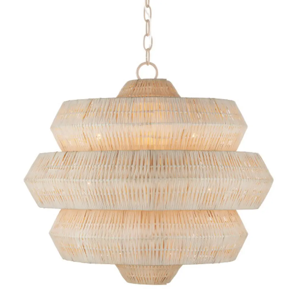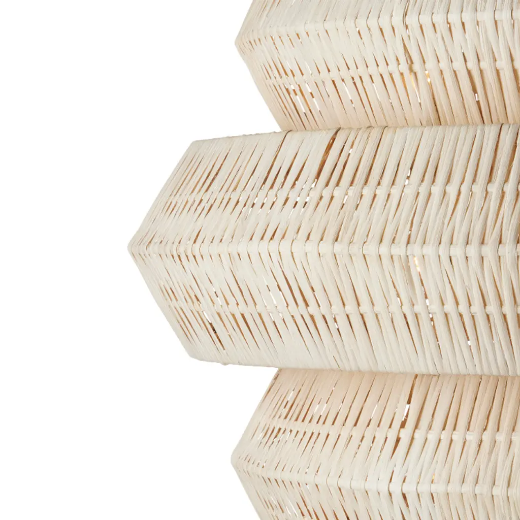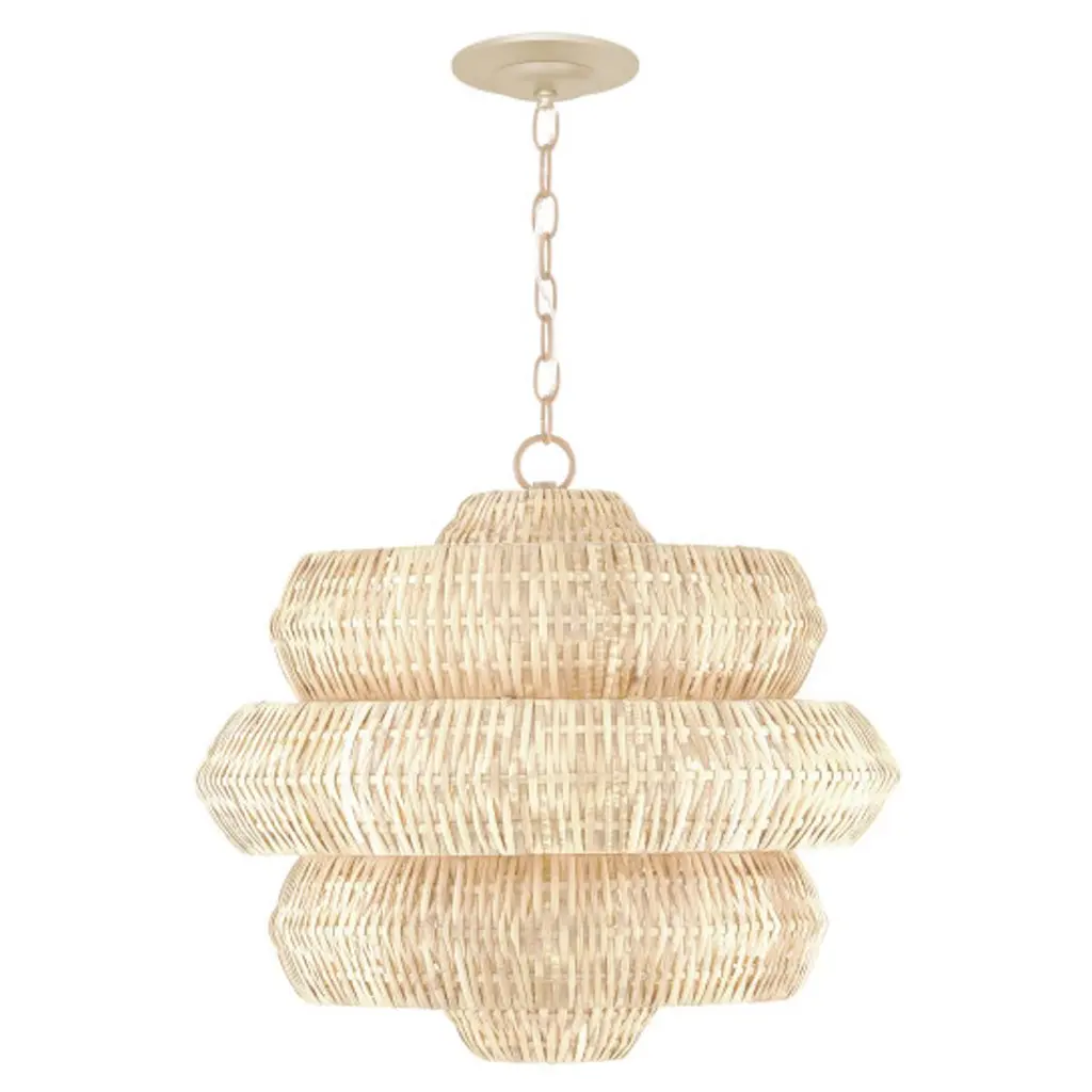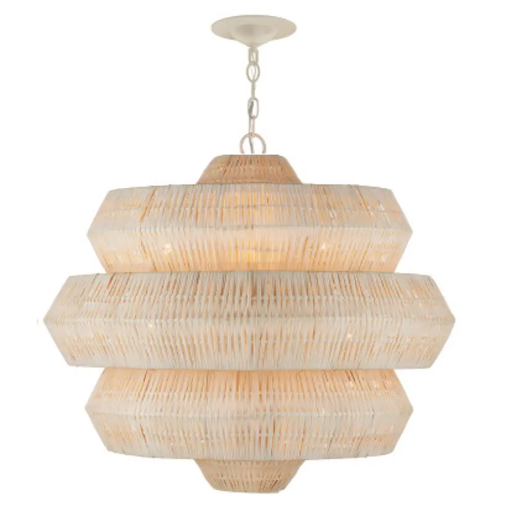 The Antibes Chandelier is crafted from natural bleached rattan woven over a geometric wrought iron frame. Its design offers a choice between a petite or bold scale, making it suitable for various spaces while maintaining a light and airy feel. Multiple bulbs are nestled within, providing ample illumination and highlighting the texture of the natural materials. The chandelier is adjustable with the use of an included chain/rod kit/cable.