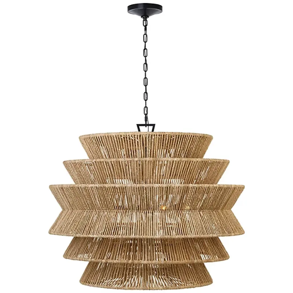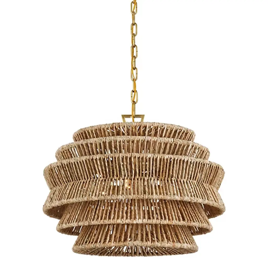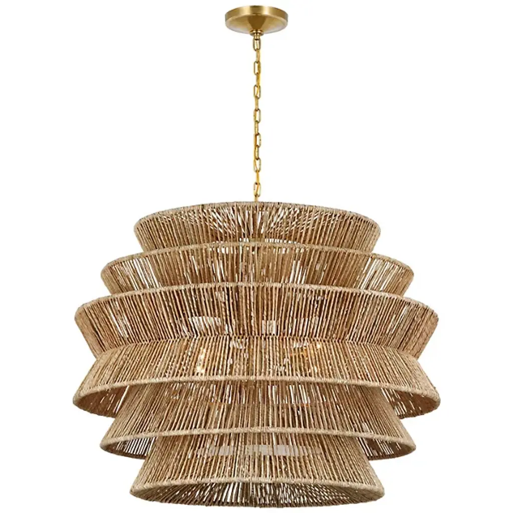 Presented by Visual Comfort Signature, the Antigua Chandelier is a truly mesmerizing lighting fixture that exudes elegance and natural beauty. Designed by Chapman & Myers, it is composed primarily of natural abaca rope, adorning throughout its entire bodice. The organic texture and earthy tones of the abaca create a captivating visual and tactile experience. As the light emanates from within, it delicately peeks through the layers of the rope, casting a gentle and enchanting effect in the surrounding space.