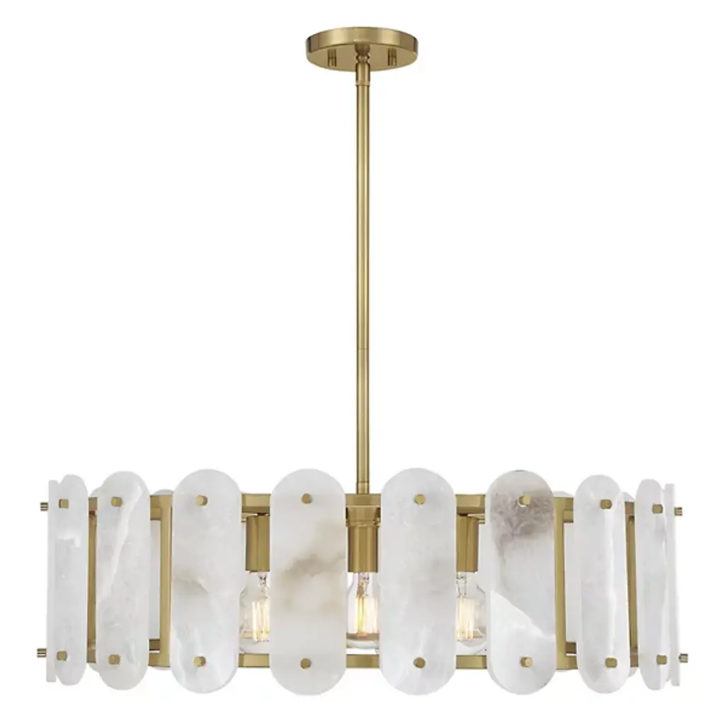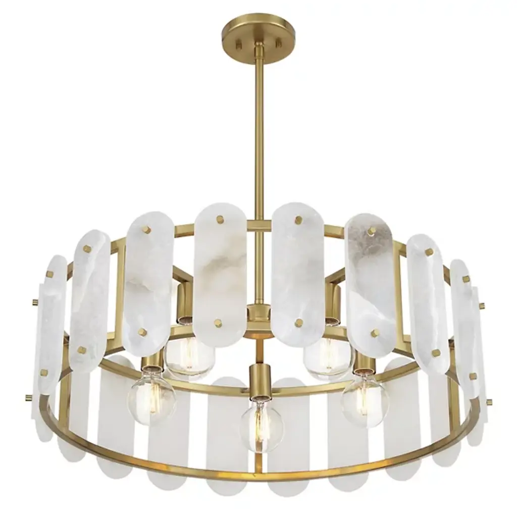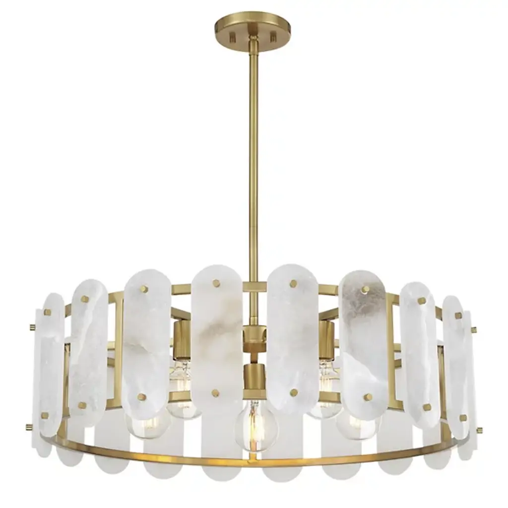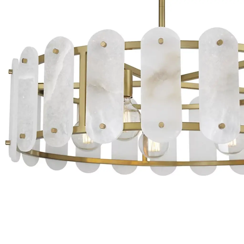 The Antolini Chandelier from Savoy House mixes transitional intricacy with contemporary simplicity, featuring a circular structure enclosing exposed light sources with round-ended tiles of natural alabaster. This chandelier keeps interest using precisely spaced natural stone tiles, which contrast with the metal joinery to suggest delicate jewelry and surround the lamping to cast alternating beams of direct light to the sides. The tiles themselves show off a warm glow that brings the unique veining across their surfaces to life, adding a remarkable, vibrant presence to entryways, gathering spaces, or kitchen islands.