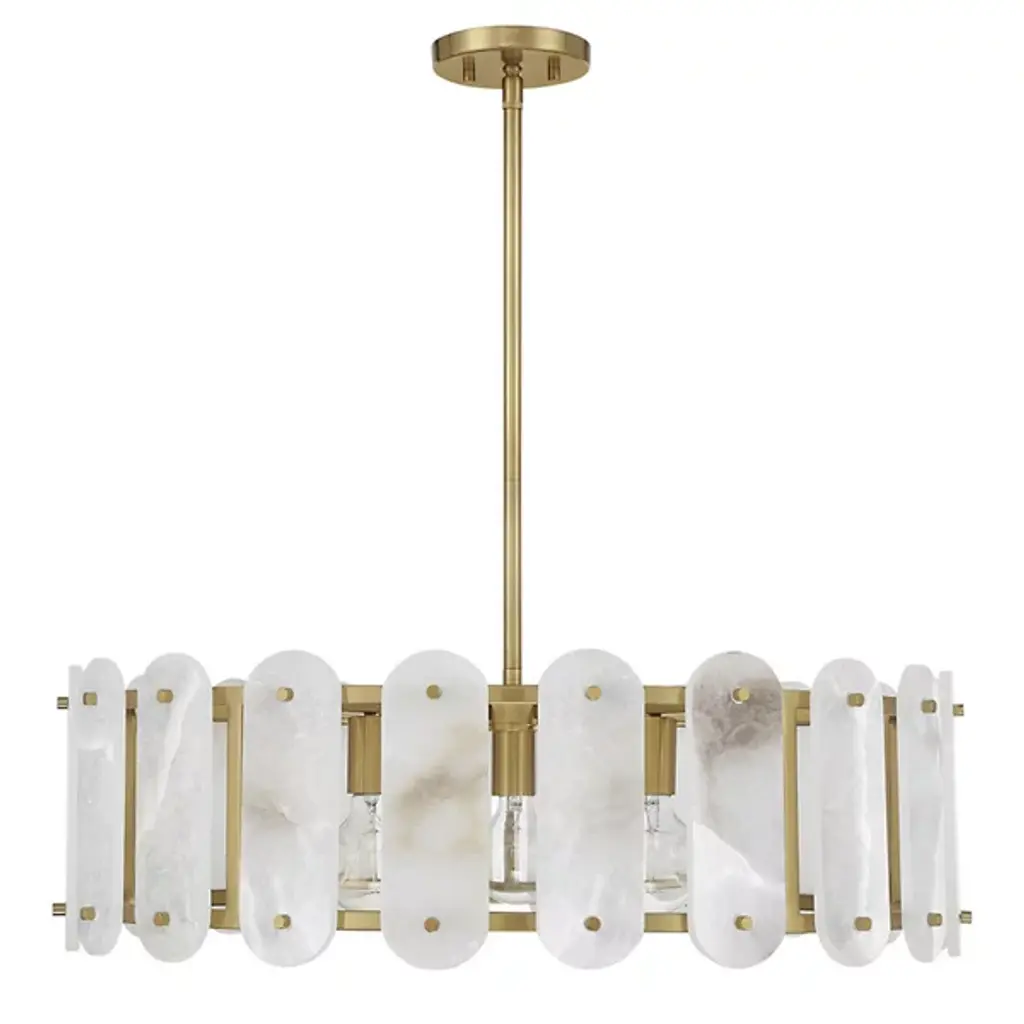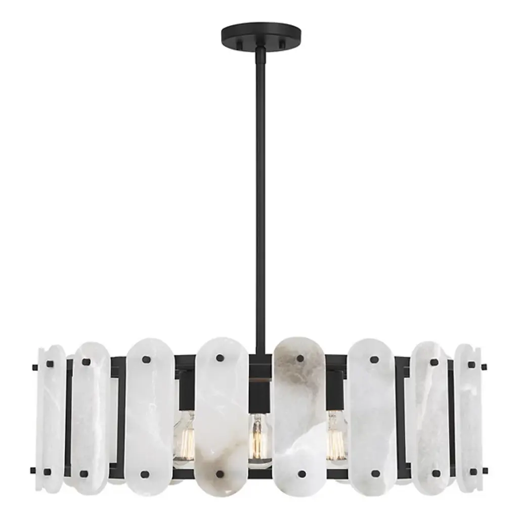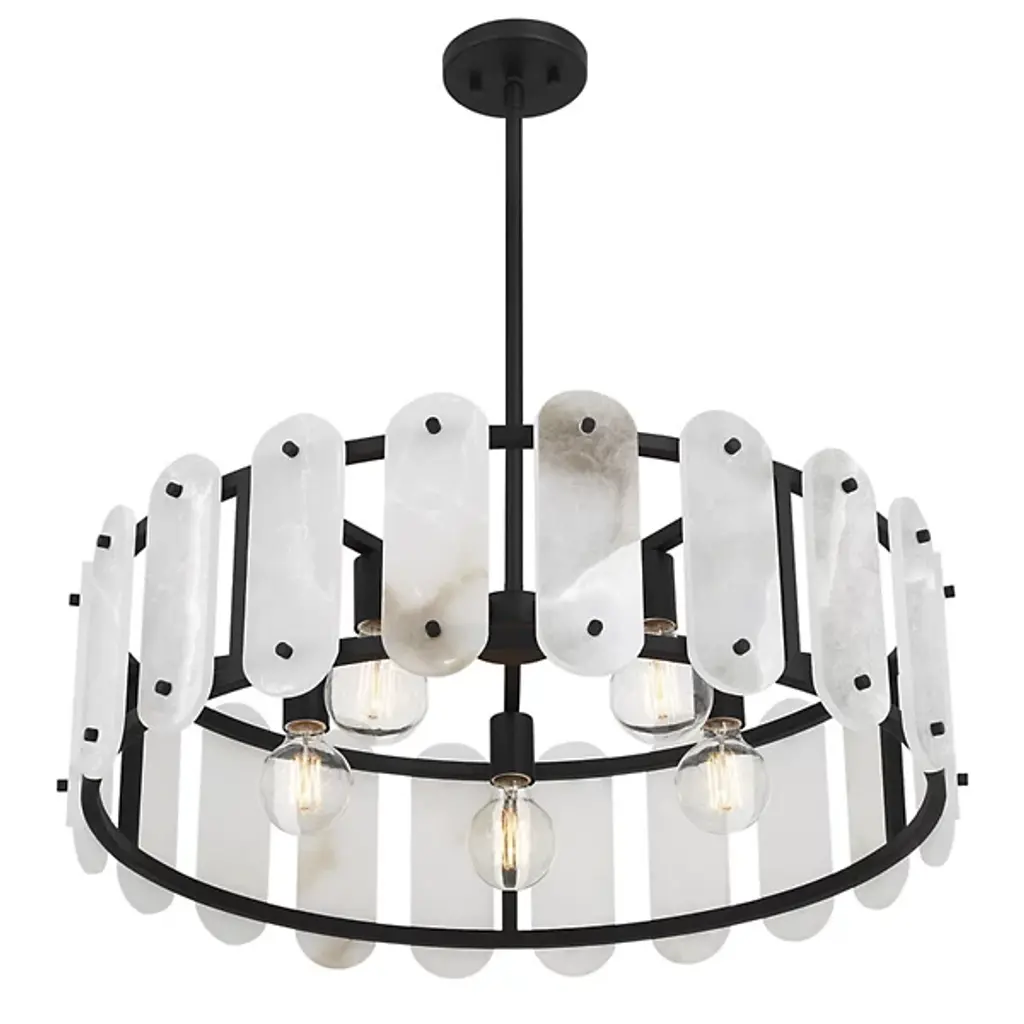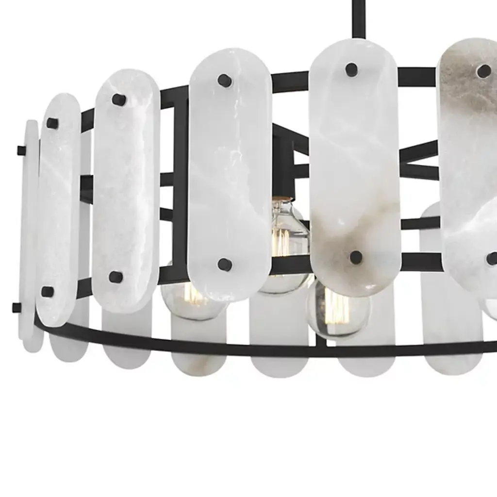 The Antolini Chandelier from Savoy House mixes transitional intricacy with contemporary simplicity, featuring a circular structure enclosing exposed light sources with round-ended tiles of natural alabaster. This chandelier keeps interest using precisely spaced natural stone tiles, which contrast with the metal joinery to suggest delicate jewelry and surround the lamping to cast alternating beams of direct light to the sides. The tiles themselves show off a warm glow that brings the unique veining across their surfaces to life, adding a remarkable, vibrant presence to entryways, gathering spaces, or kitchen islands.