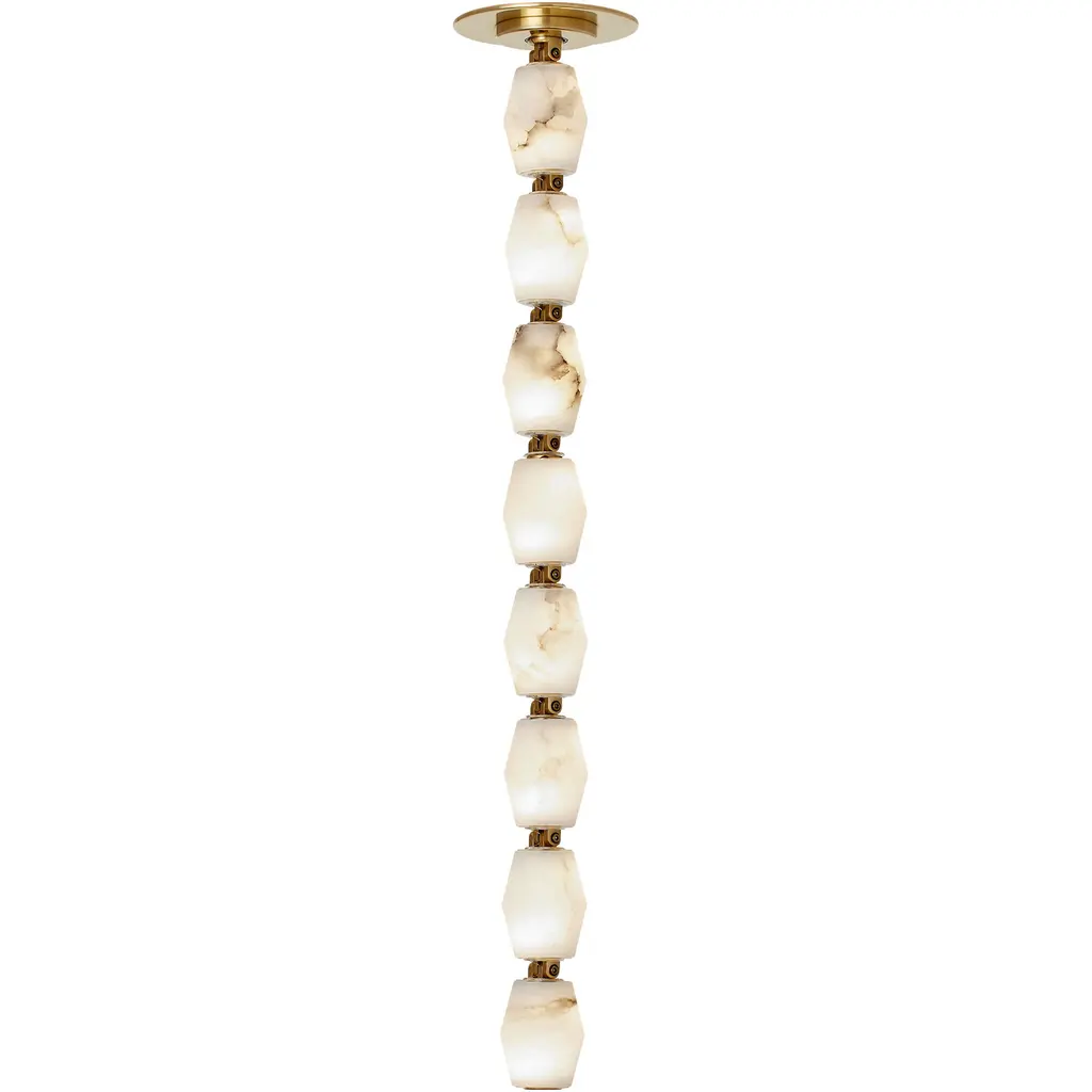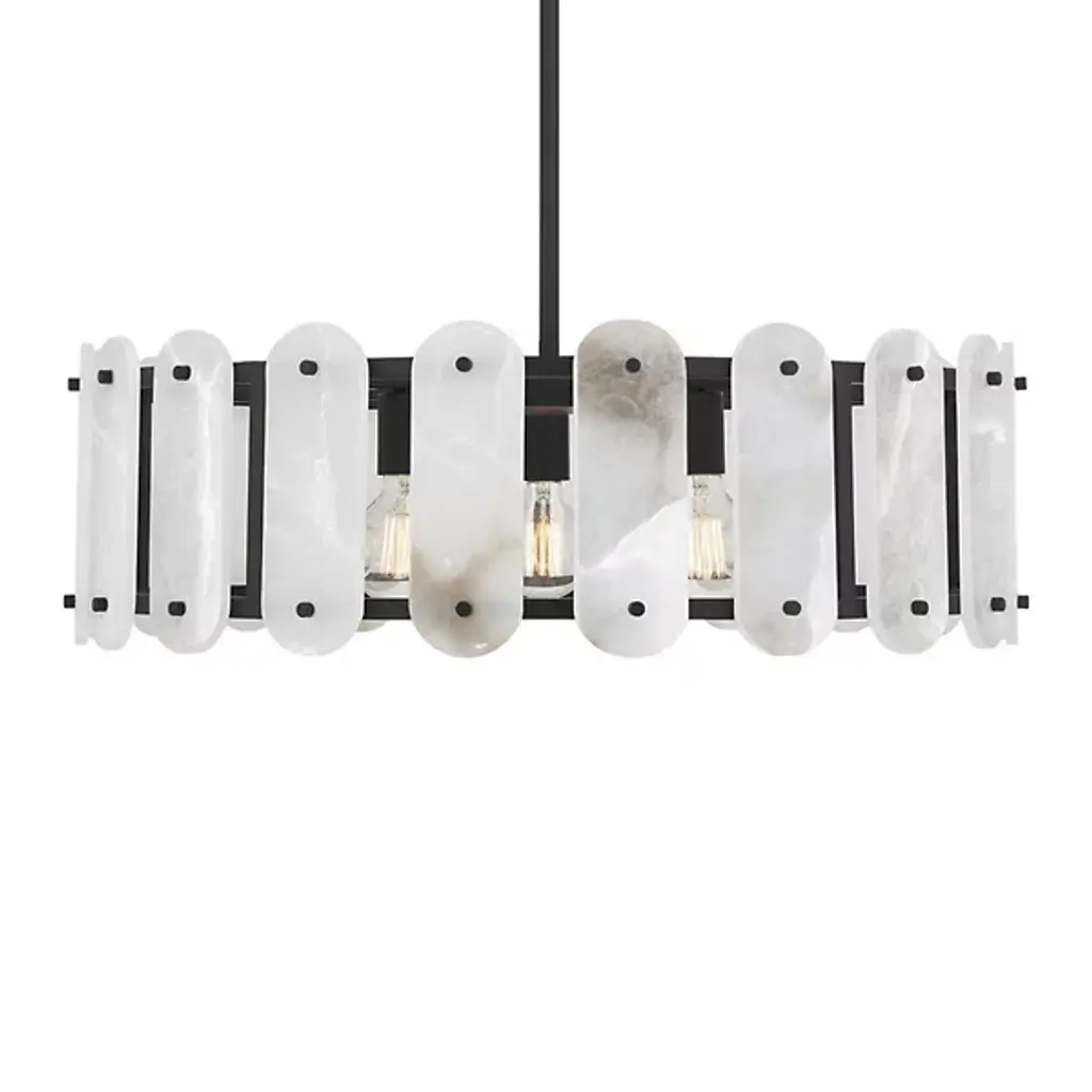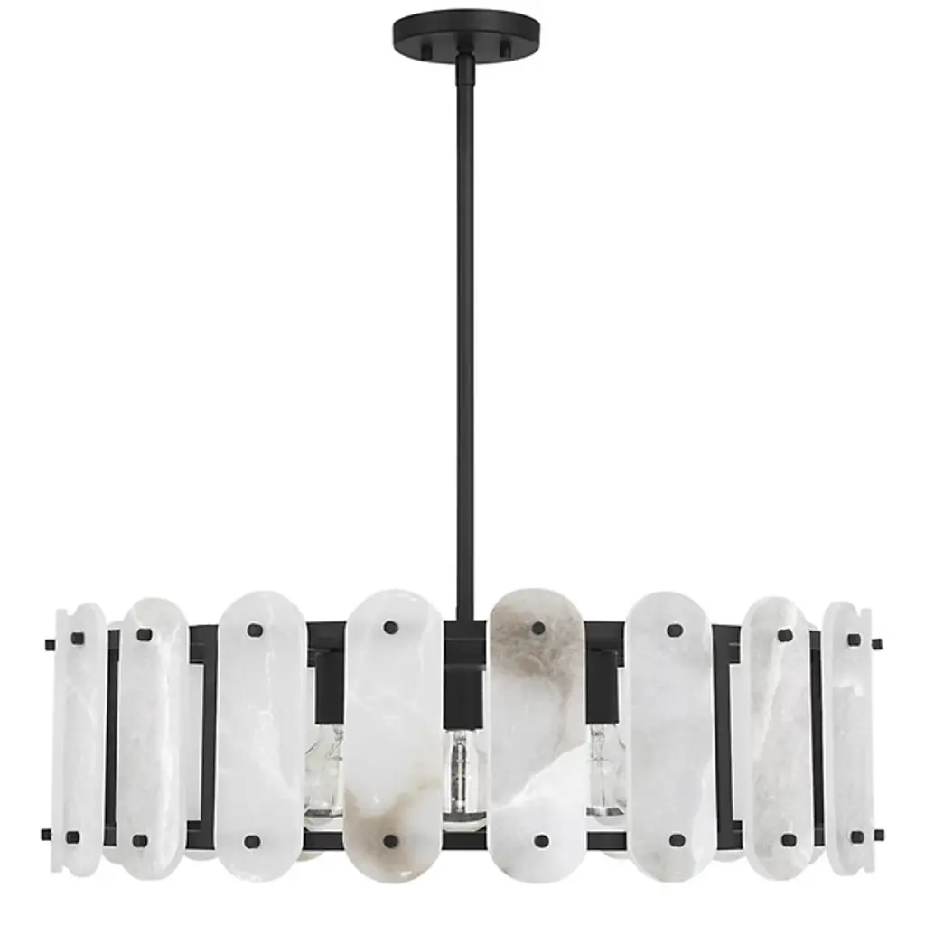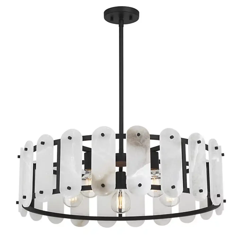 The Antolini Chandelier from Savoy House mixes transitional intricacy with contemporary simplicity, featuring a circular structure enclosing exposed light sources with round-ended tiles of natural alabaster. This chandelier keeps interest using precisely spaced natural stone tiles, which contrast with the metal joinery to suggest delicate jewelry and surround the lamping to cast alternating beams of direct light to the sides. The tiles themselves show off a warm glow that brings the unique veining across their surfaces to life, adding a remarkable, vibrant presence to entryways, gathering spaces, or kitchen islands.
