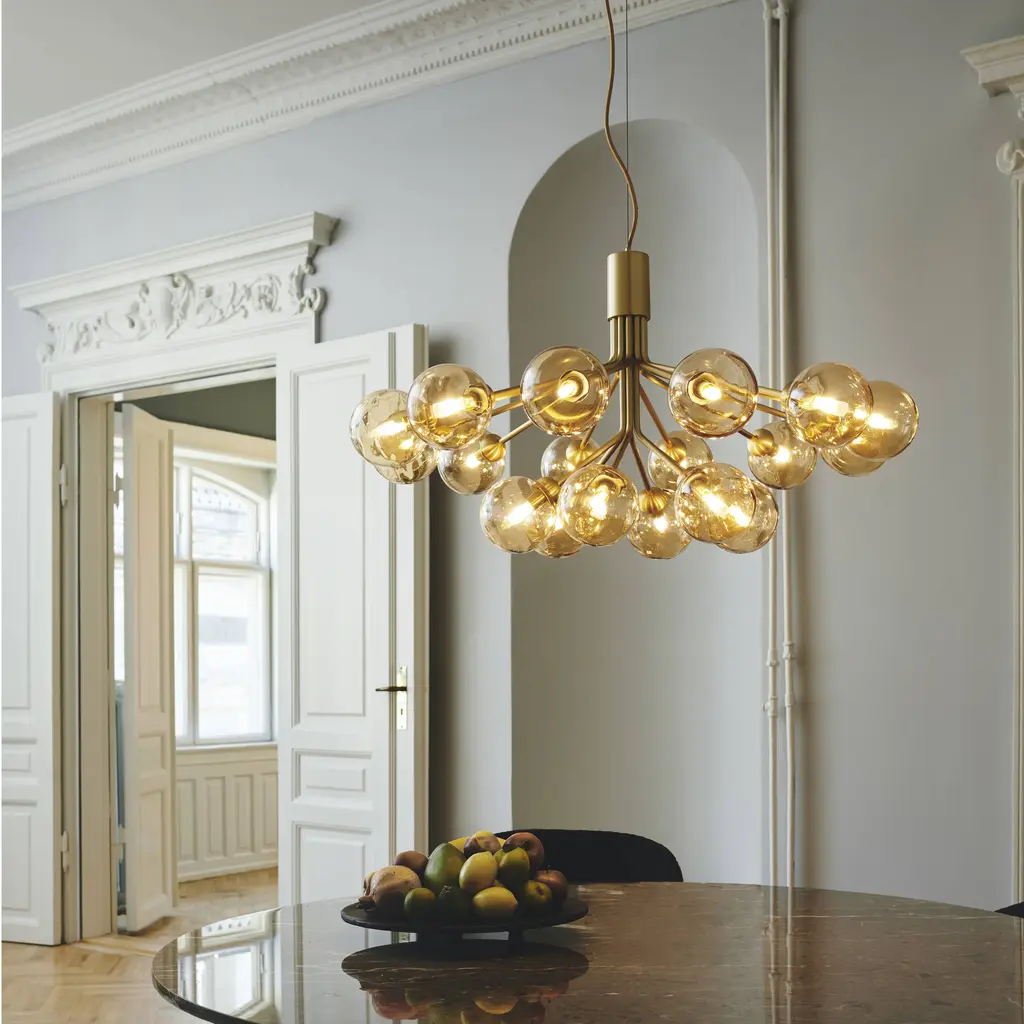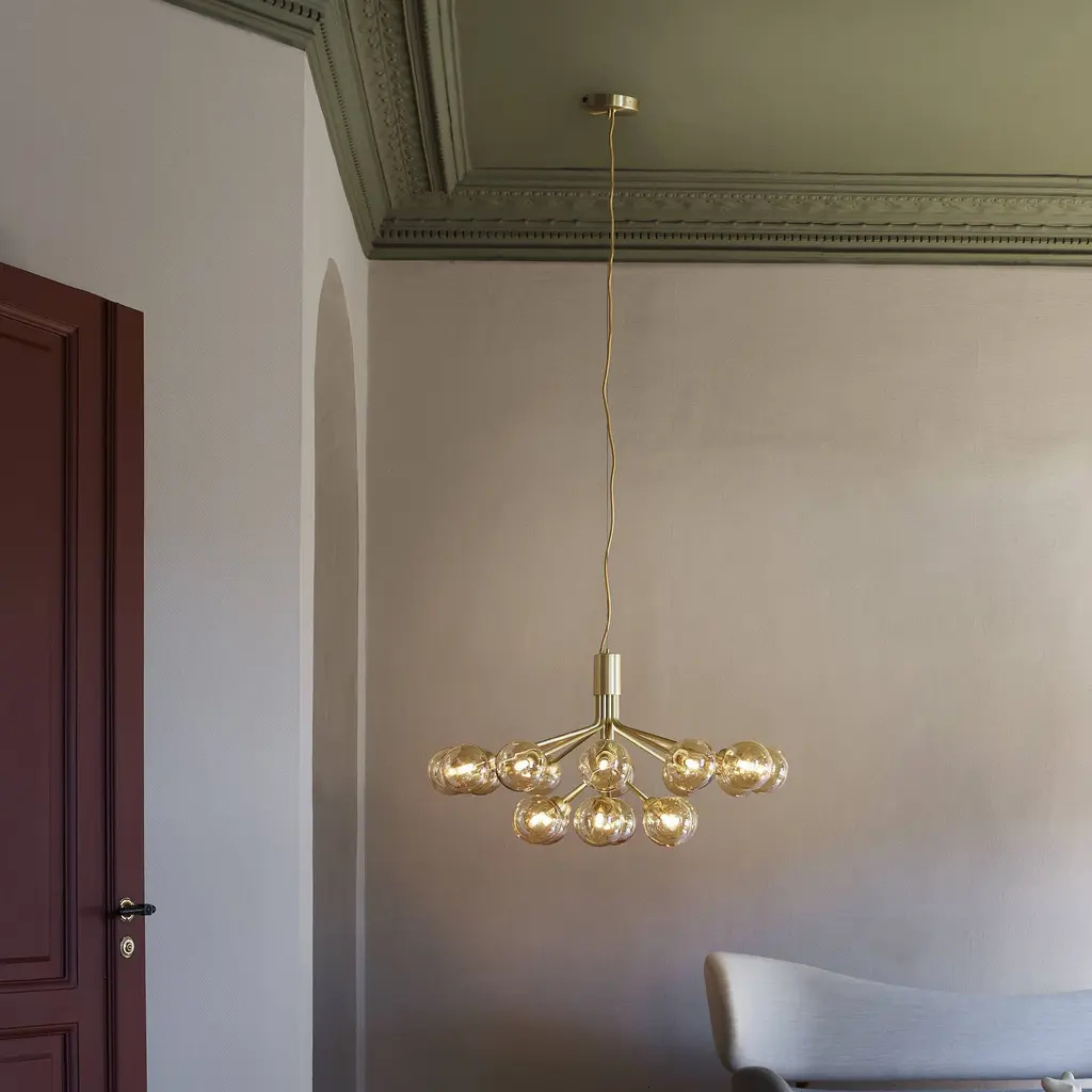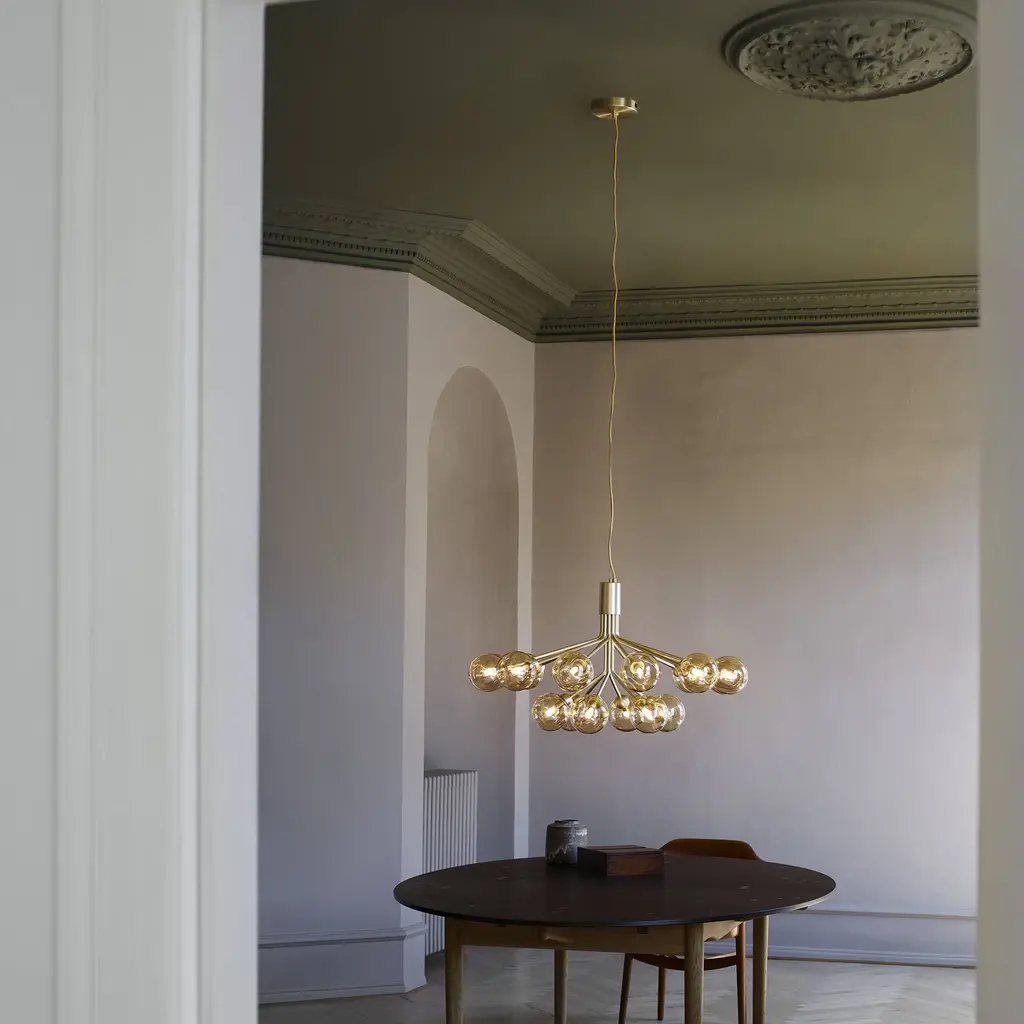 With a suitably grand gesture, fit to grace a large dining table or expanded entryway, Sofie Refer has created a dramatic bouquet of light. Apiales 18, the larger model in Nuura's collection, features that number of elegantly mouth-blown glass globes. Gathered and held together, they resemble flowers on individual "stalks," finished in a choice of golden Brush Brass or the smooth Satin Black, that create an eye-catching bloom of illumination.