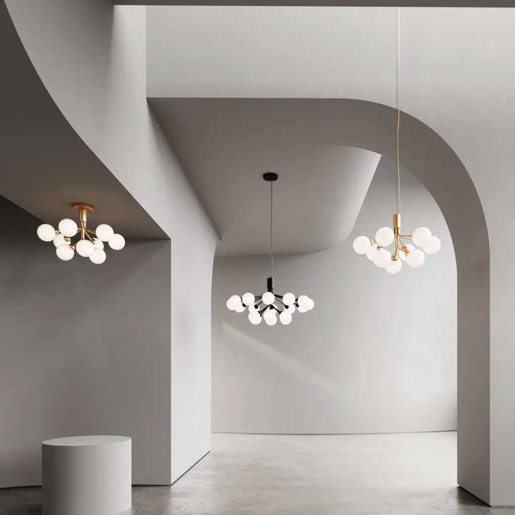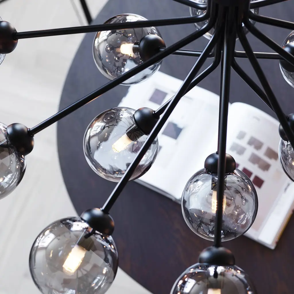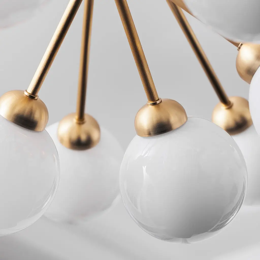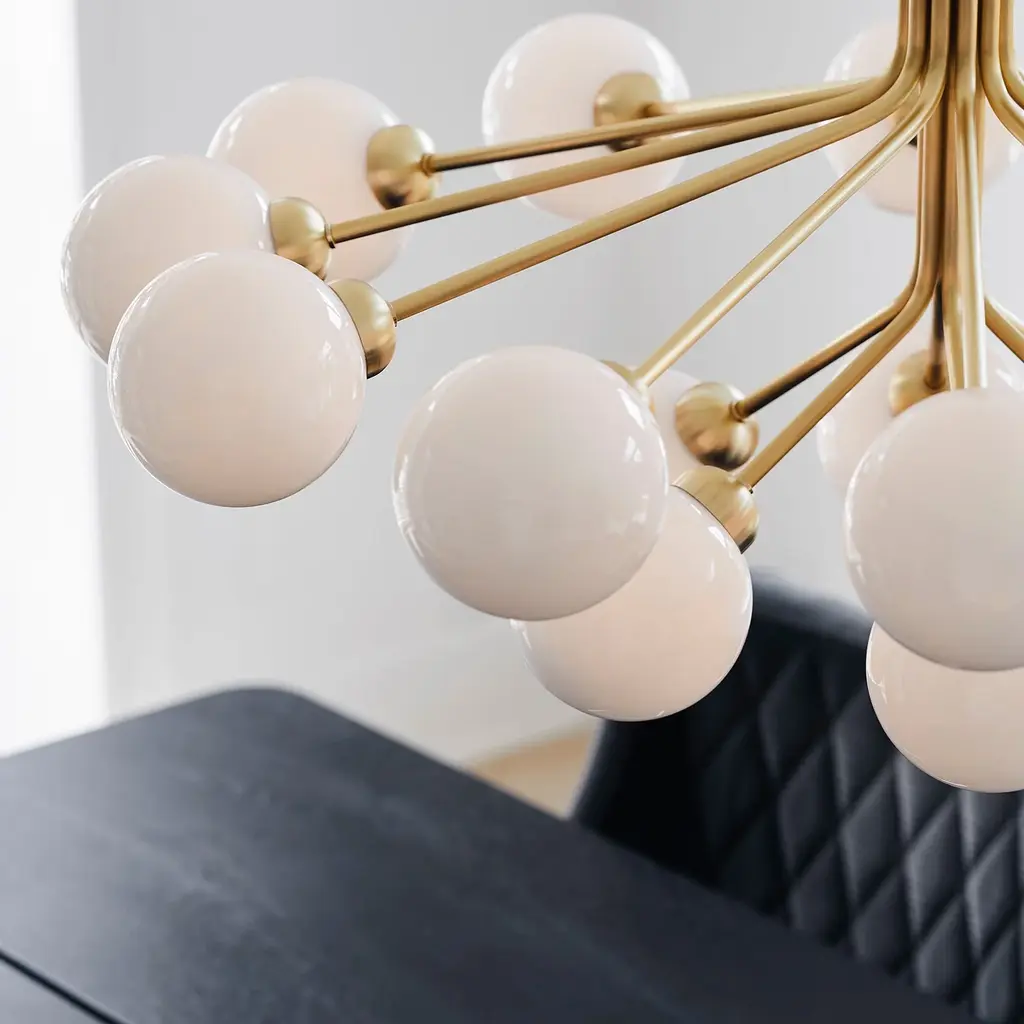 With a suitably grand gesture, fit to grace a large dining table or expanded entryway, Sofie Refer has created a dramatic bouquet of light. Apiales 18, the larger model in Nuura's collection, features that number of elegantly mouth-blown glass globes. Gathered and held together, they resemble flowers on individual "stalks," finished in a choice of golden Brush Brass or the smooth Satin Black, that create an eye-catching bloom of illumination.