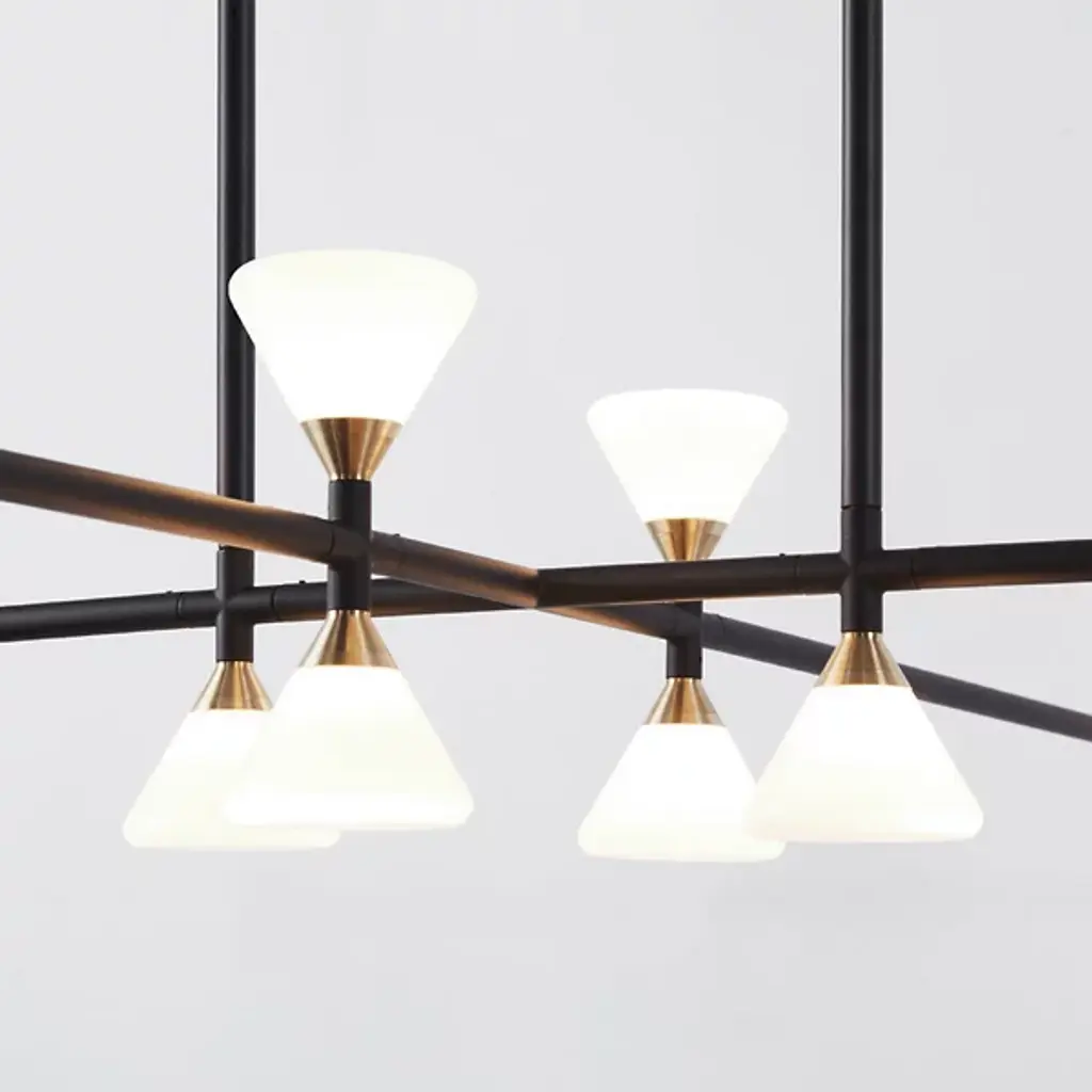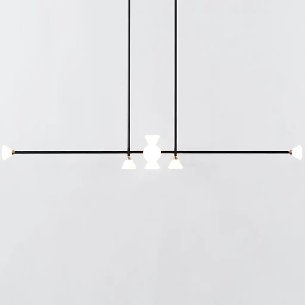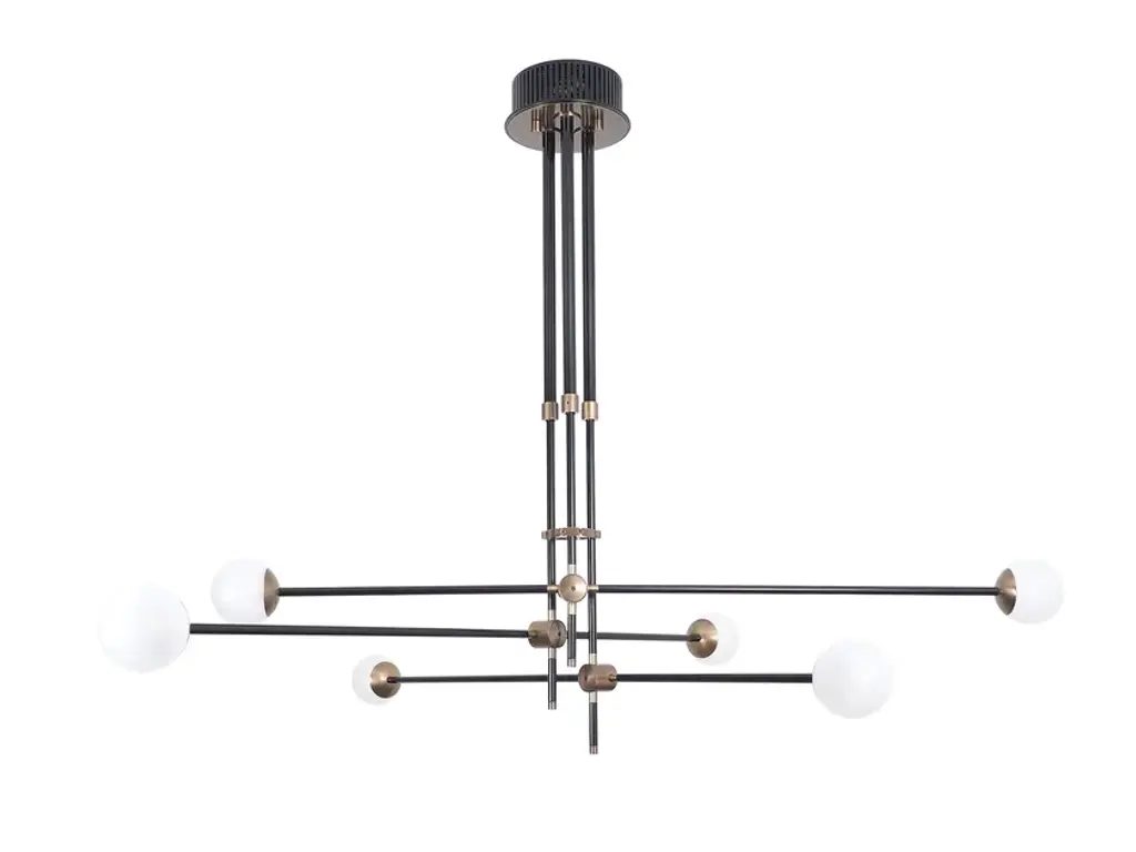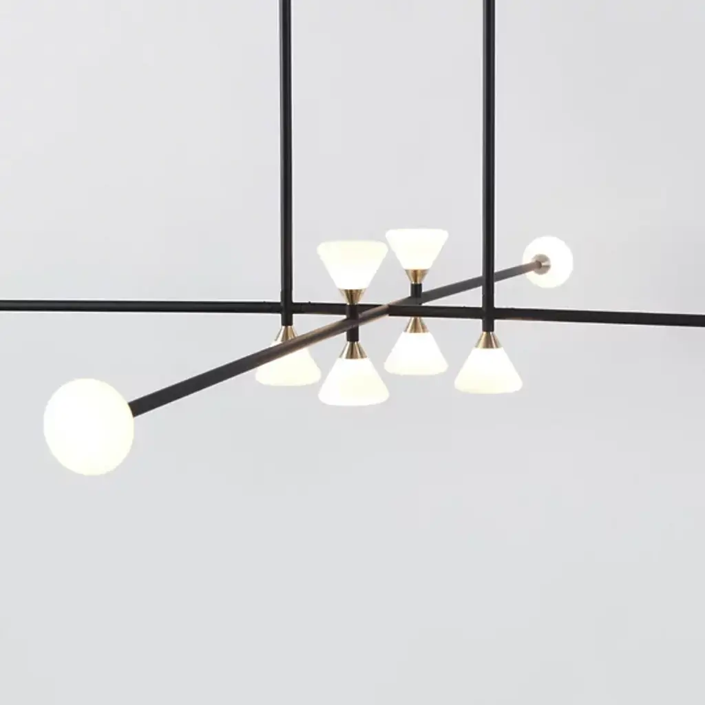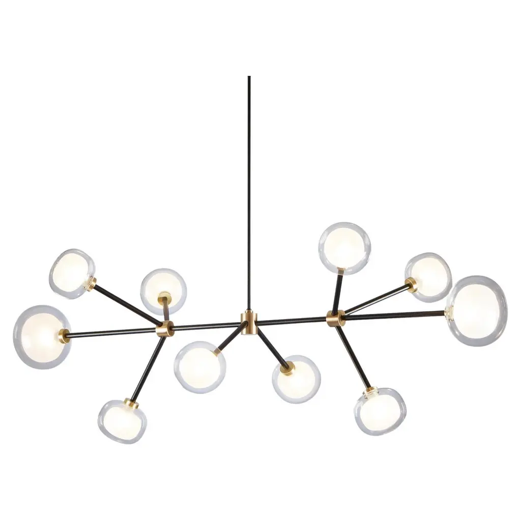 The Apollo Horizontal LED Chandelier from Roll & Hill stretches far and wide with endearing shapes and wondrous radiance. Creators McKenzie & Kim approach each piece with the goal of producing minimal lines and a balanced movement of components. A wood canopy catches the eye above with subtle wood grain accents. A slender downrod suspension sets the chandelier’s linear tone. Slender arms cross at the center, marked by a group of handblown glass shades. These shades also cap off the arms while containing brilliant lamping. The lamping faces in near every direction, setting the piece up for a clean, airy glow.