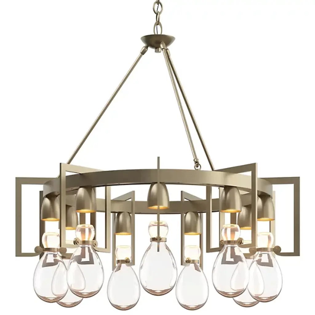 Who knew that traditional glass medicinal jars could serve as stunning elements to a contemporary piece? The intricate construction of the Apothecary Circular Chandelier from Hubbardton Forge grabs your eyes with stunning lines and an intriguing form. Setting the tone is a circular steel body, sharpened by open rectangular frames, and a series of tasteful, hand-blown glasses crafted in an elegant teardrop shape. With incandescent light from above, these reflective glasses are detailed with brilliant accents of warm light.
