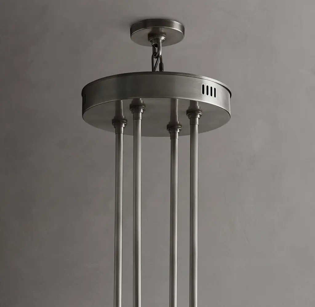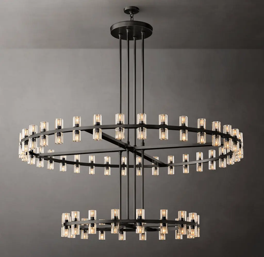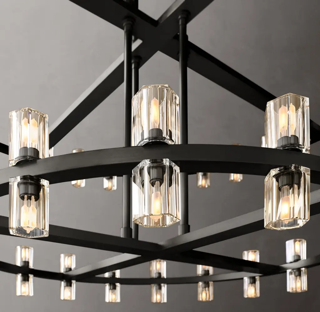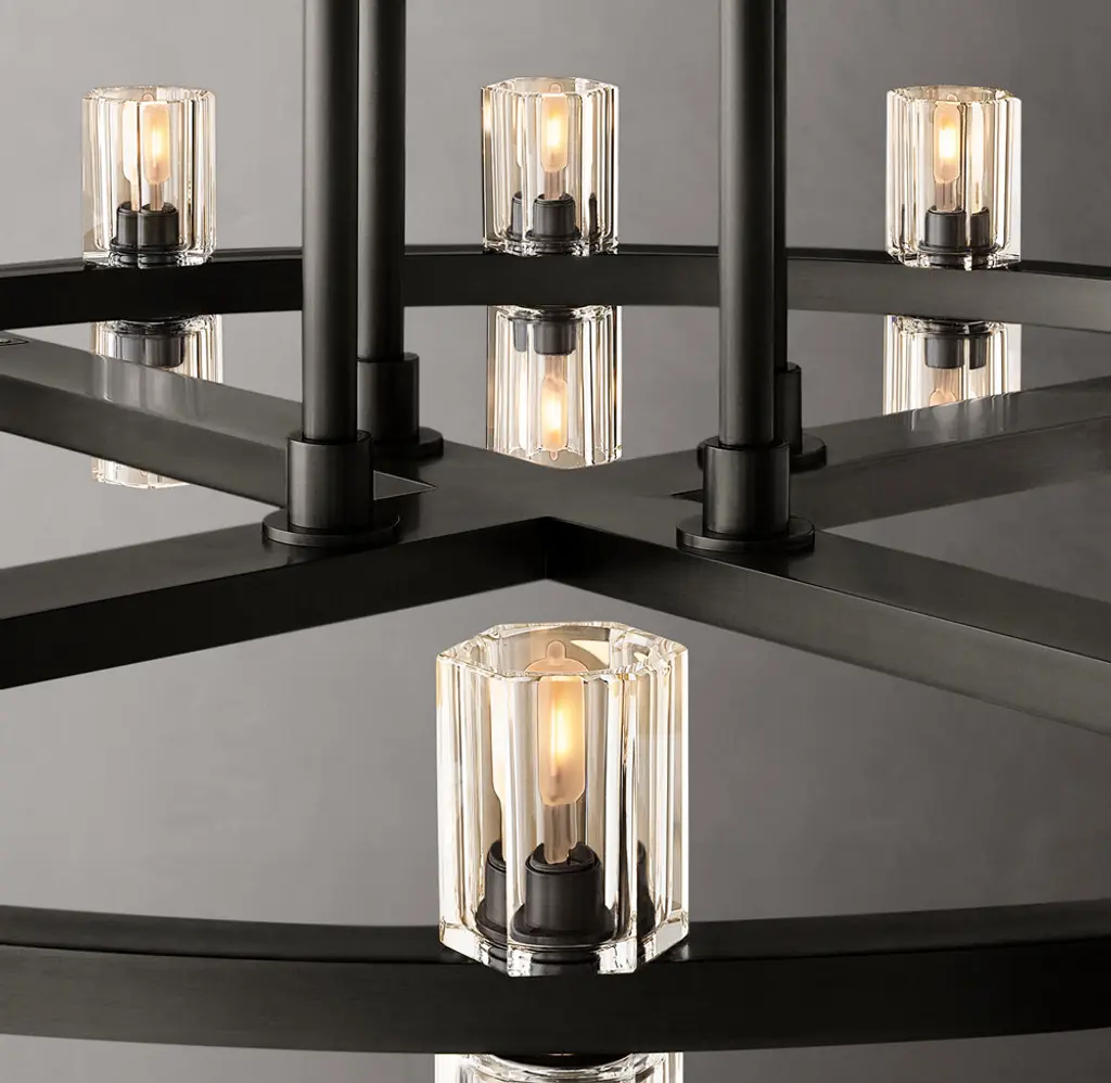 Jonathan Browning's rhythmic design for the Arcachon collection is inspired by the shape and scale of industrial gears, where spokes intersperse with negative space in order to interlock with other gears. Here, the spokes are hexagonal forms juxtaposed with rounded interiors, beautifully crafted of crystal glass, running along a simple, solid metal frame. SHOP THE ENTIRE COLLECTION