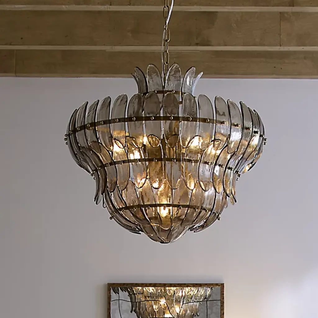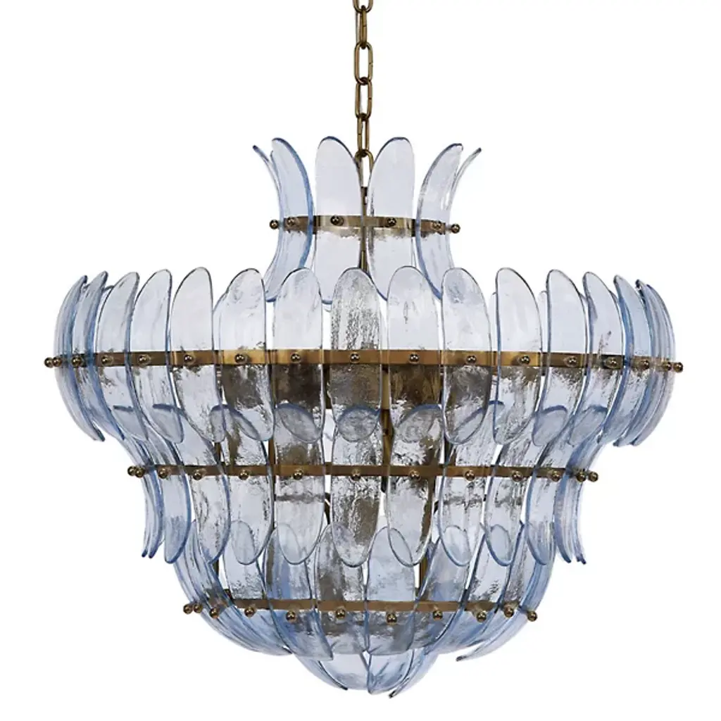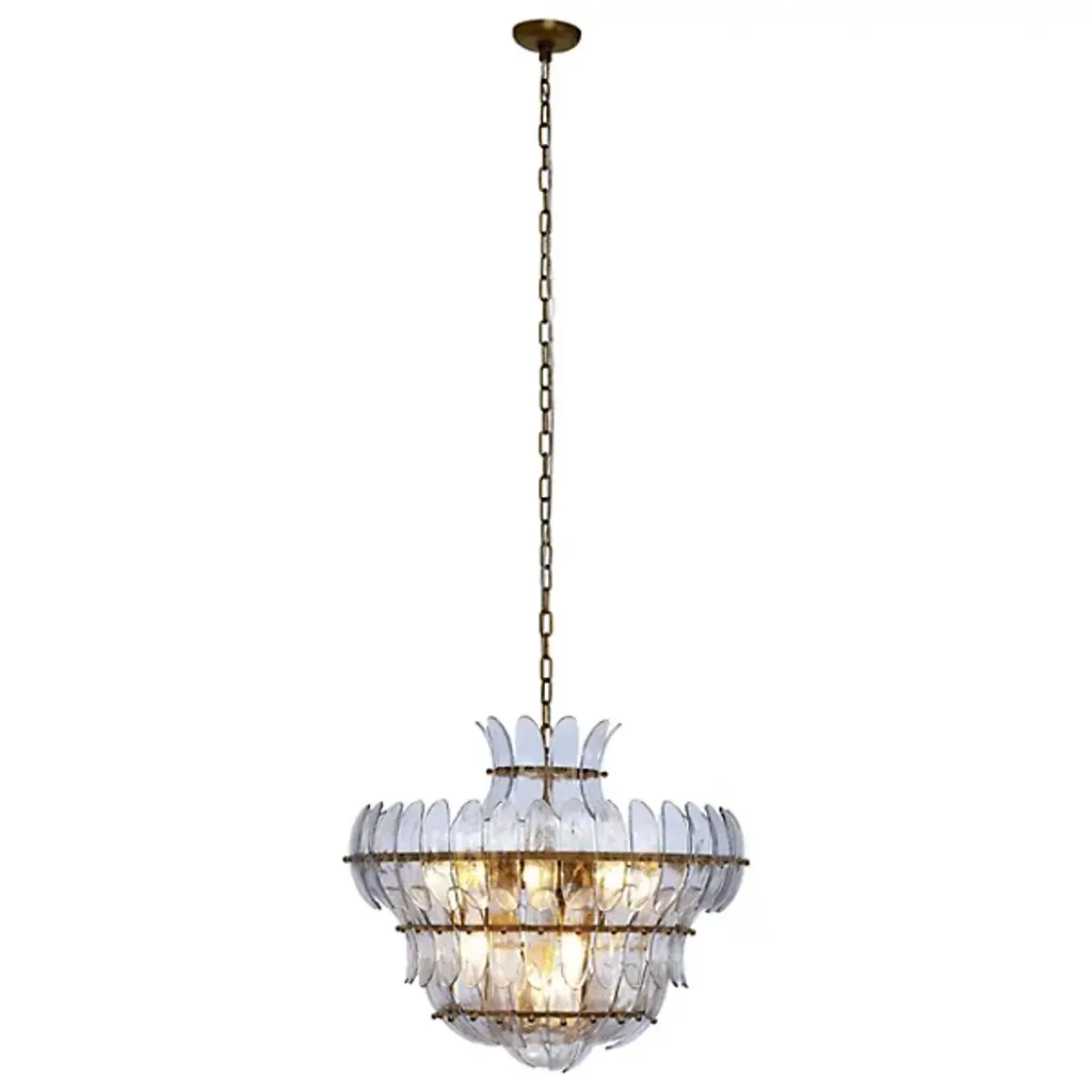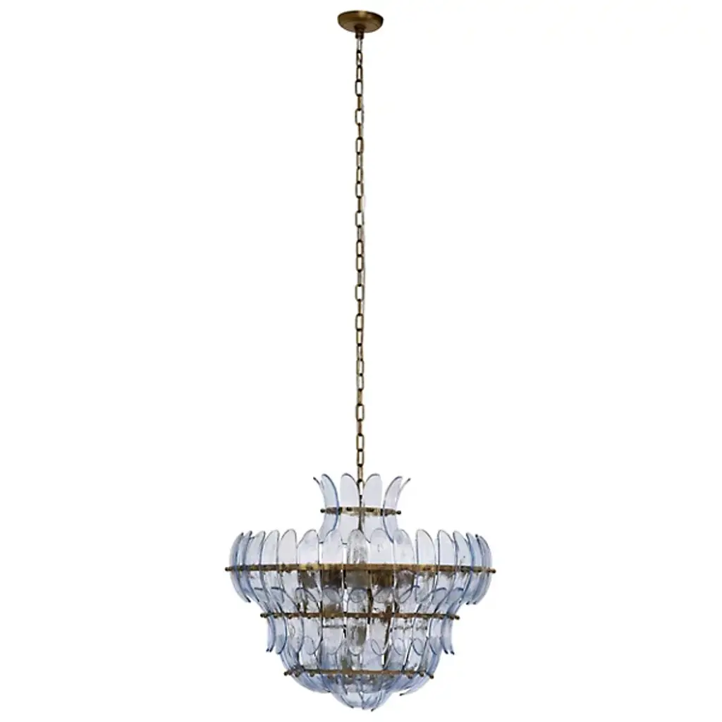 The Arcade Chandelier from Jamie Young Co. offers a fresh interpretation of vintage elegance, making it a true statement piece. Crafted with delicate glass petals bound to iron rings, its layered design creates depth and striking visual interest. Each shade enhances the chandelier’s artistic appeal. Suspended by an antiqued brass chain with a coordinating brass canopy, this exquisite fixture brings a touch of timeless sophistication to any space, blending classic charm with modern refinement.