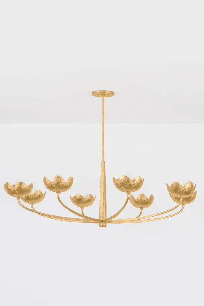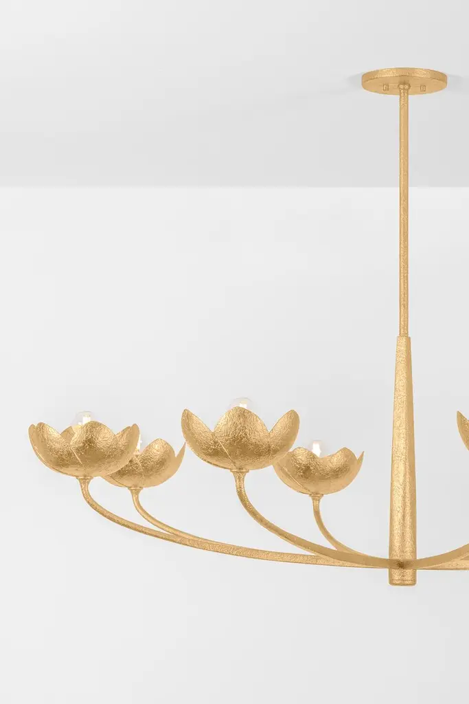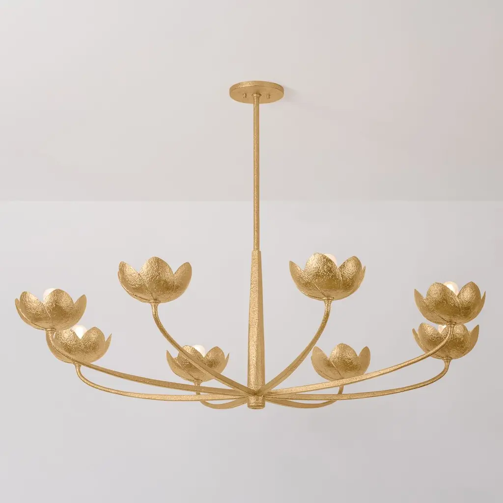 A fresh take on a botanic motif, the Arcata family features sculptural, romantic silhouettes with highly tactile, hand-worked finishes. The gentle sweeping arms transition from square to round, creating a dynamic look that complements the floral forms. Arcata is available as a 1-light sconce and 6 or 8-light chandeliers.