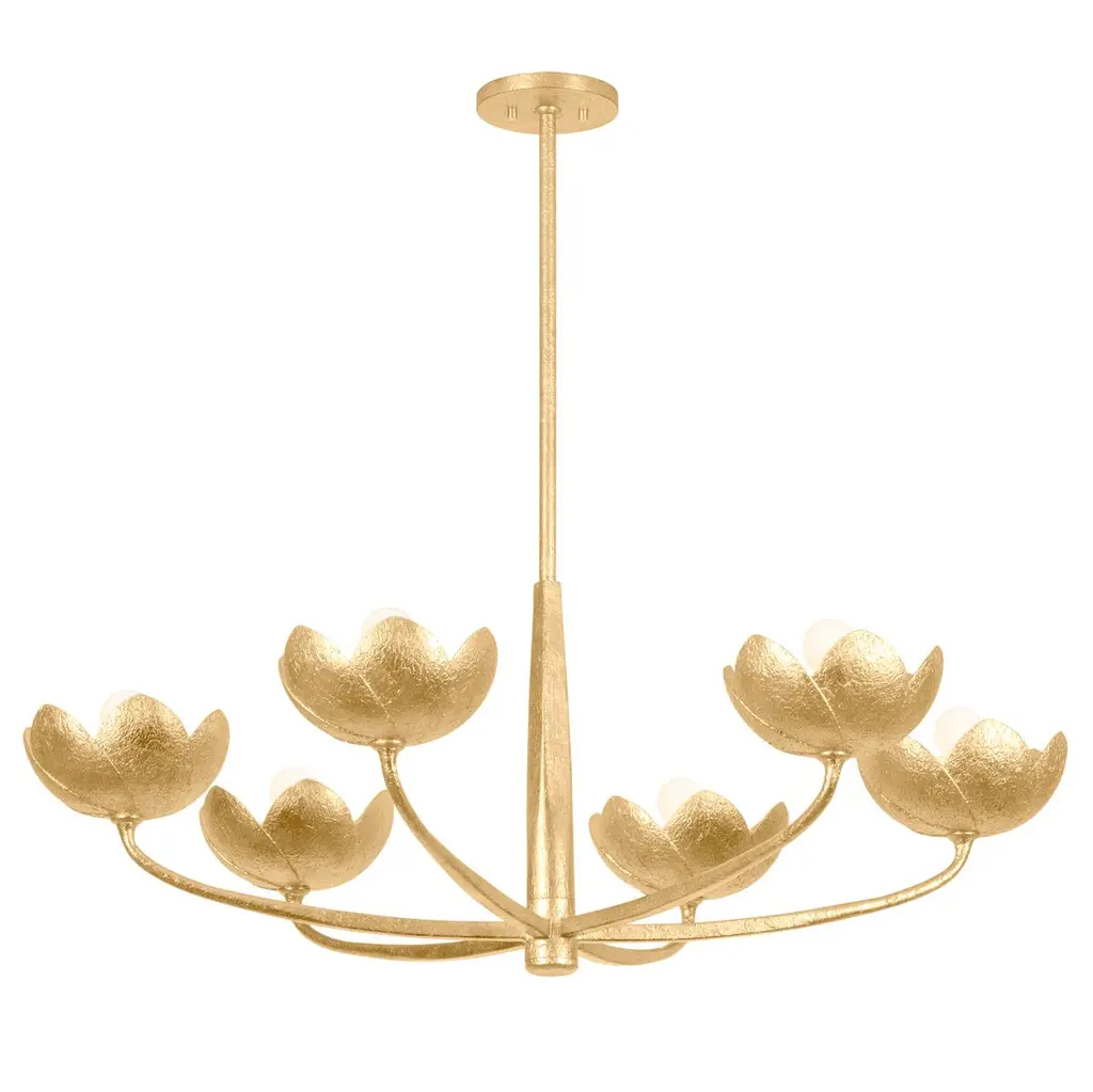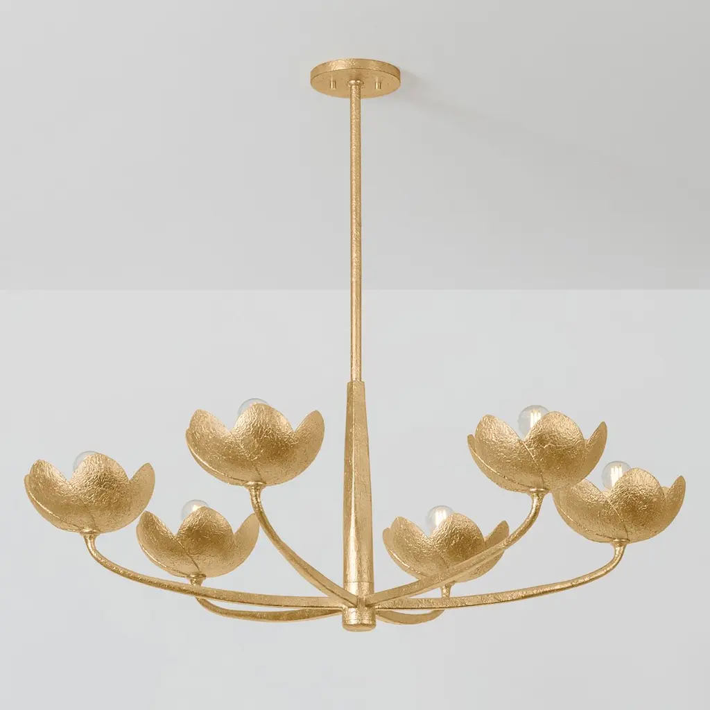 A fresh take on a botanic motif, the Arcata family features sculptural, romantic silhouettes with highly tactile, hand-worked finishes. The gentle sweeping arms transition from square to round, creating a dynamic look that complements the floral forms. Arcata is available as a 1-light sconce and 6 or 8-light chandeliers.