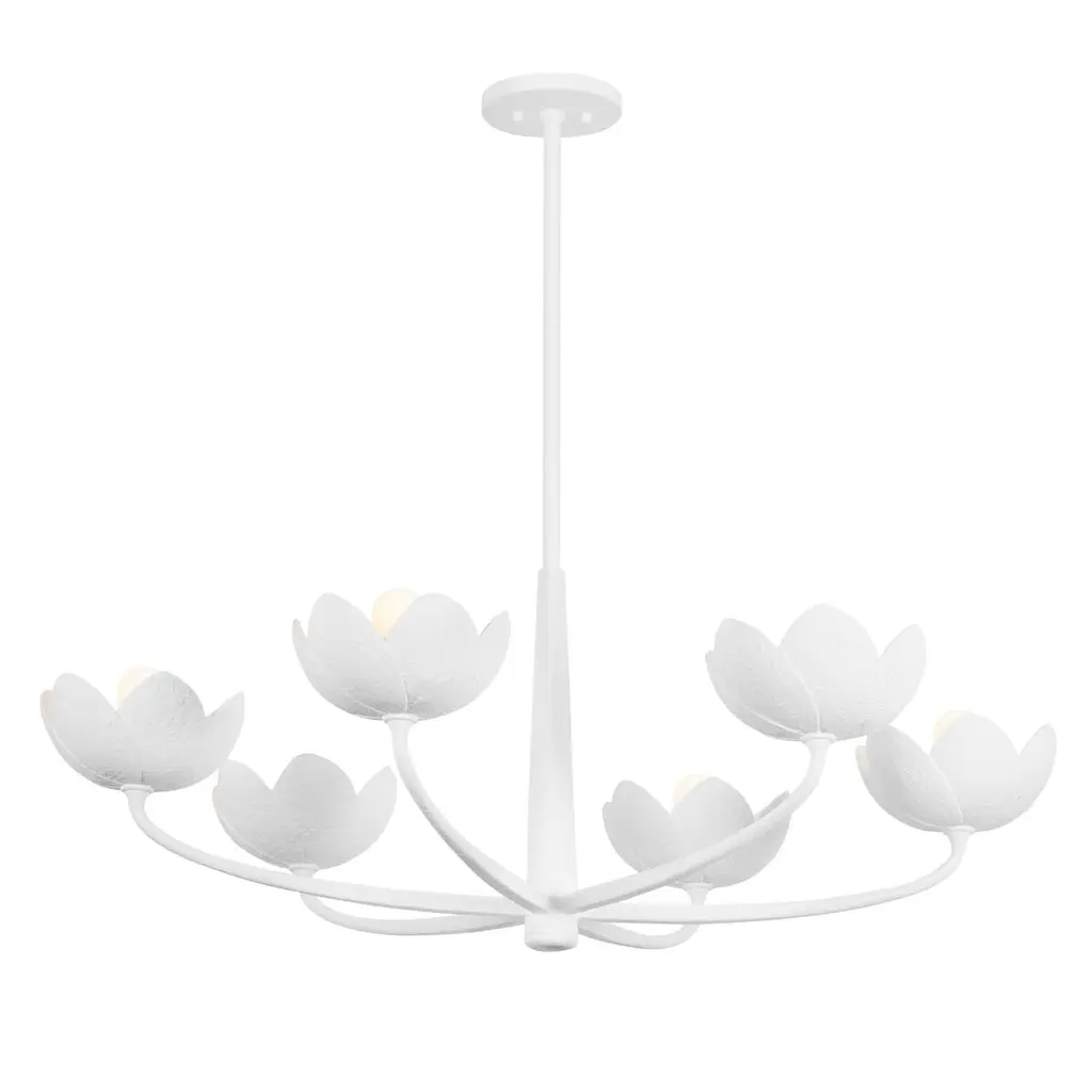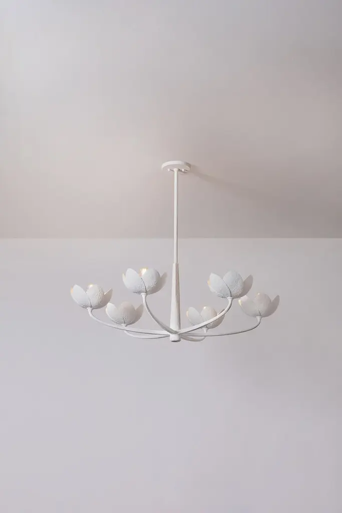 A fresh take on a botanic motif, the Arcata family features sculptural, romantic silhouettes with highly tactile, hand-worked finishes. The gentle sweeping arms transition from square to round, creating a dynamic look that complements the floral forms. Arcata is available as a 1-light sconce and 6 or 8-light chandeliers.