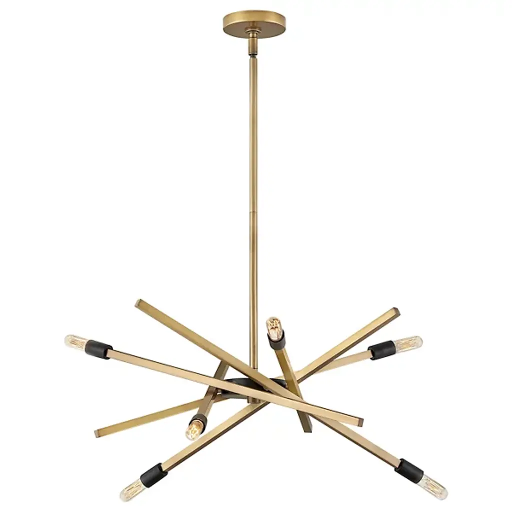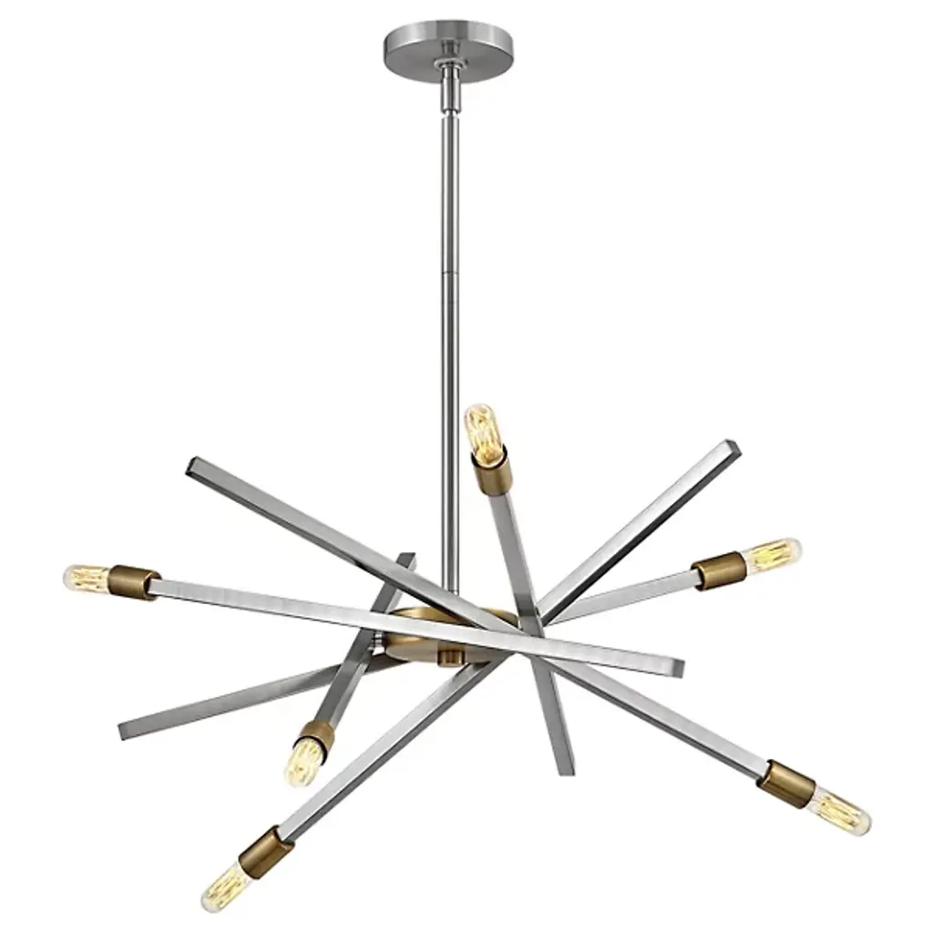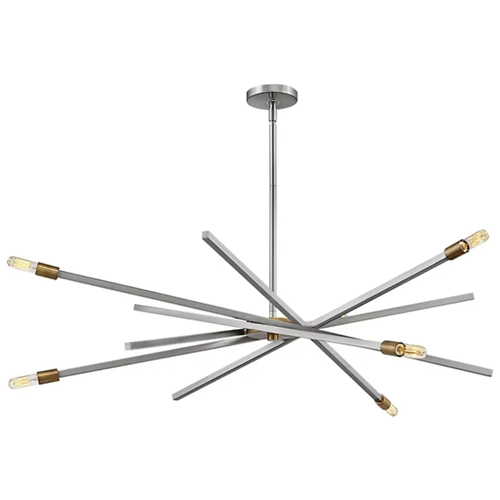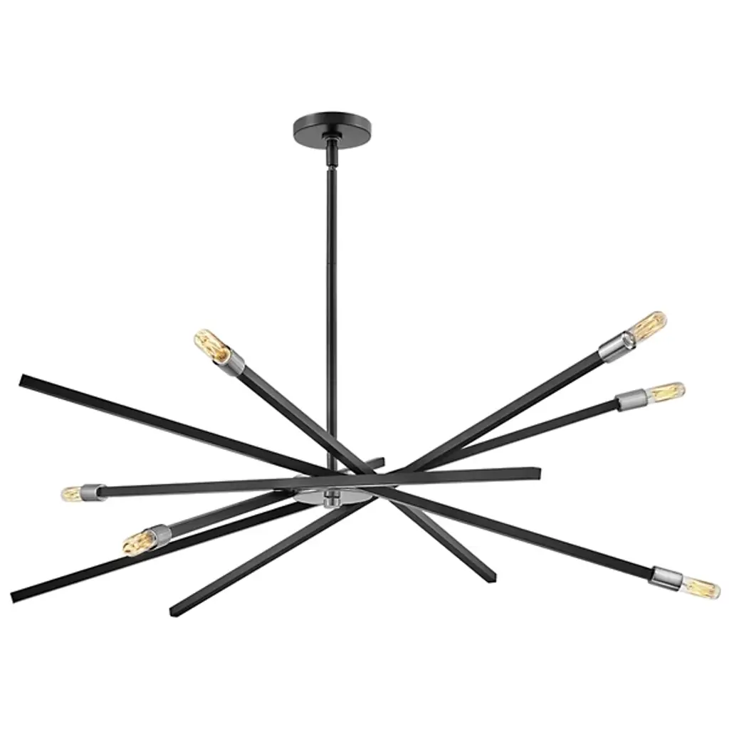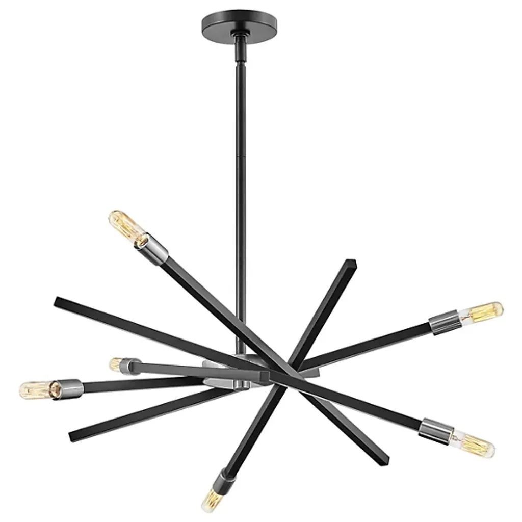 A straight shot to ceiling lighting excellence. The distinctive, angular design of the Archer Chandelier by Hinkley Lighting is perfect for adding a vibrant, almost mobile quality to your ceiling, as it provides powerful yet warm indirect lighting from multiple points. The Steel constructed chandelier consists of a conventionally made cylindrical stem extending from a thick circular canopy, as well as a series of rectangular rods that hold the chandelier’s bulbs, each angled at a different orientation to create a multidirectional lighting pattern.