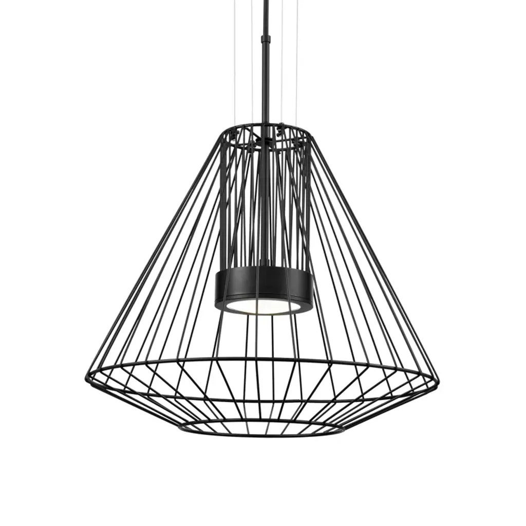 The Arctic collection uses a basic wire rod as structure and aesthetic form. The seemingly continuous lines interconnect, creating a complex framework that encapsulates and emphasizes the light source. A substantial glass optic is the focal point of the lamp, augmented by the concentric rings of the lightweight latticework design.