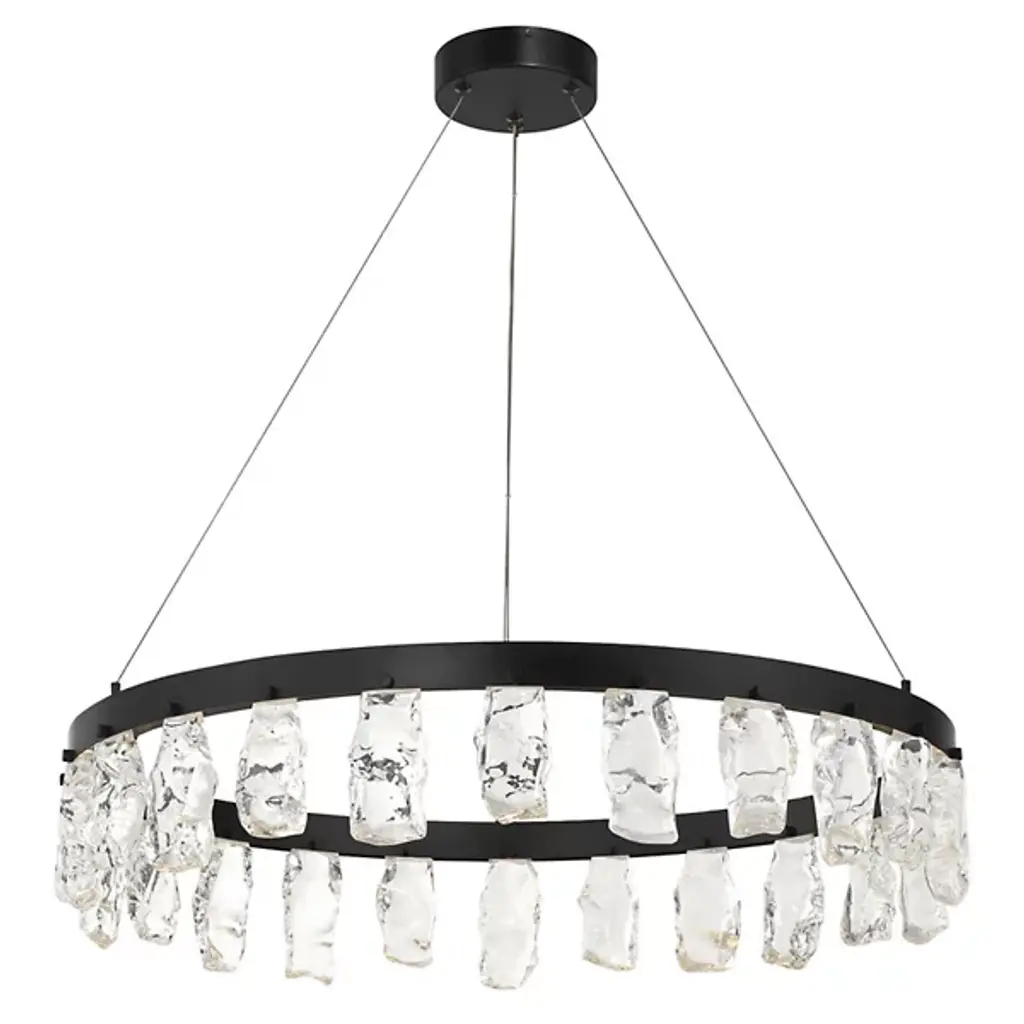 The Arctic Glacier LED Chandelier from George Kovacs suspends faux rock crystals in a circular formation, each piece mimicking naturally formed ice. The raw, organic shapes of these crystal elements catch and scatter light in unpredictable ways. A matte casing provides a stark contrast, while LED lighting brings each crystal to life, perfect above dining tables or in grand entryways. The dimmable design allows you to shift between bright illumination and subtle glow. The suspended crystals appear to float within their circular frame, creating movement as light plays across their irregular surfaces.
